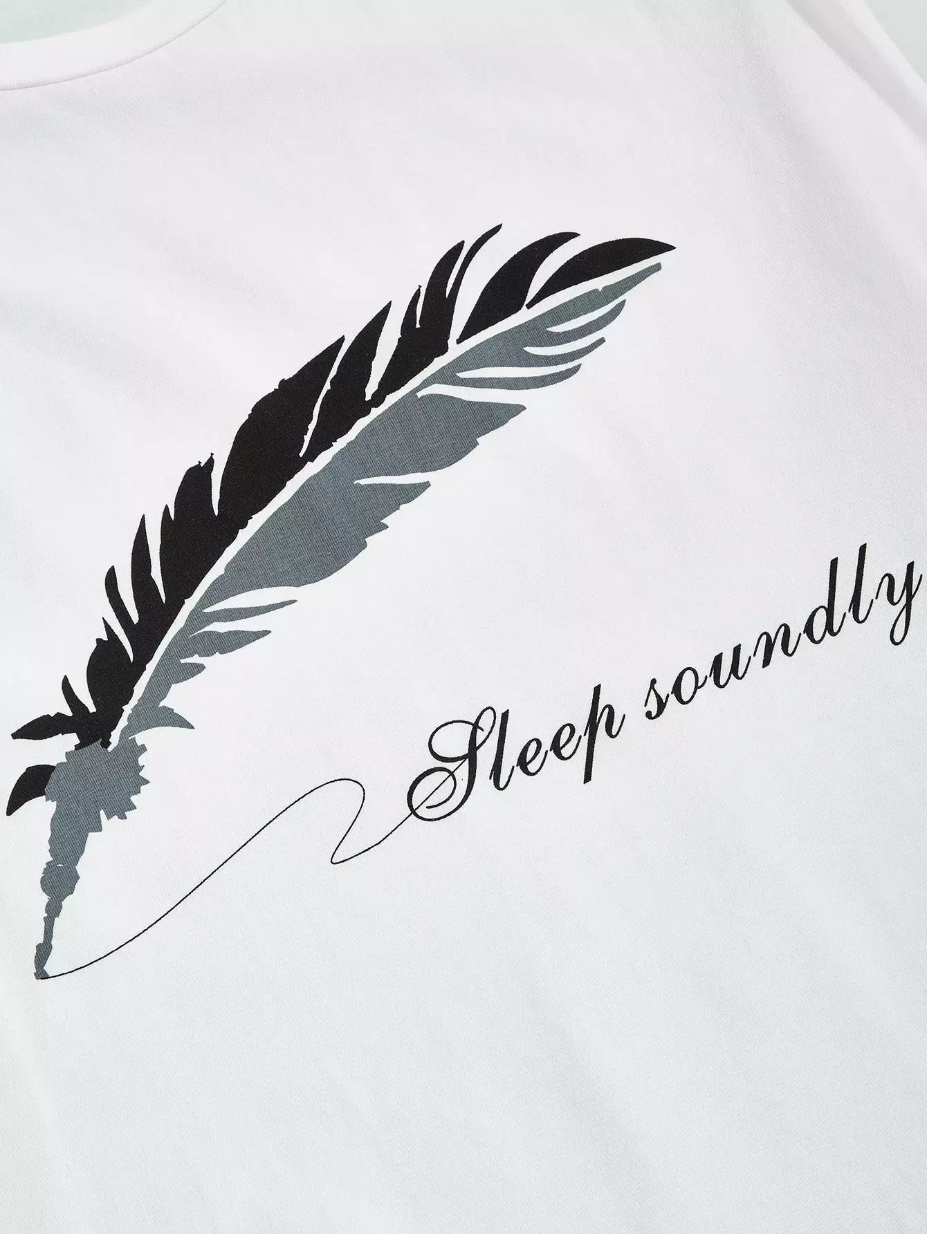 Men Feather and Slogan Graphic Tee and Gingham Pants PJ Set