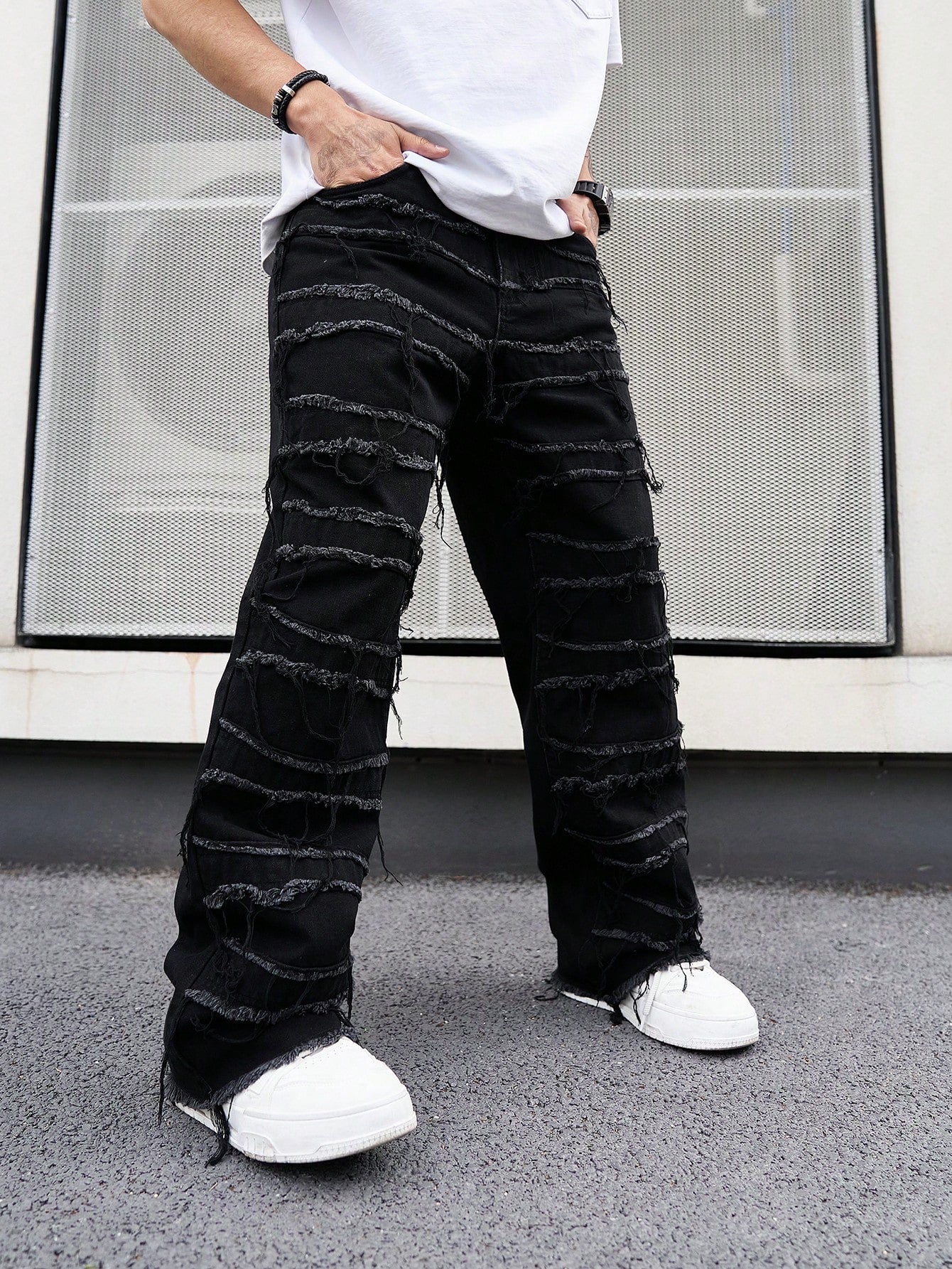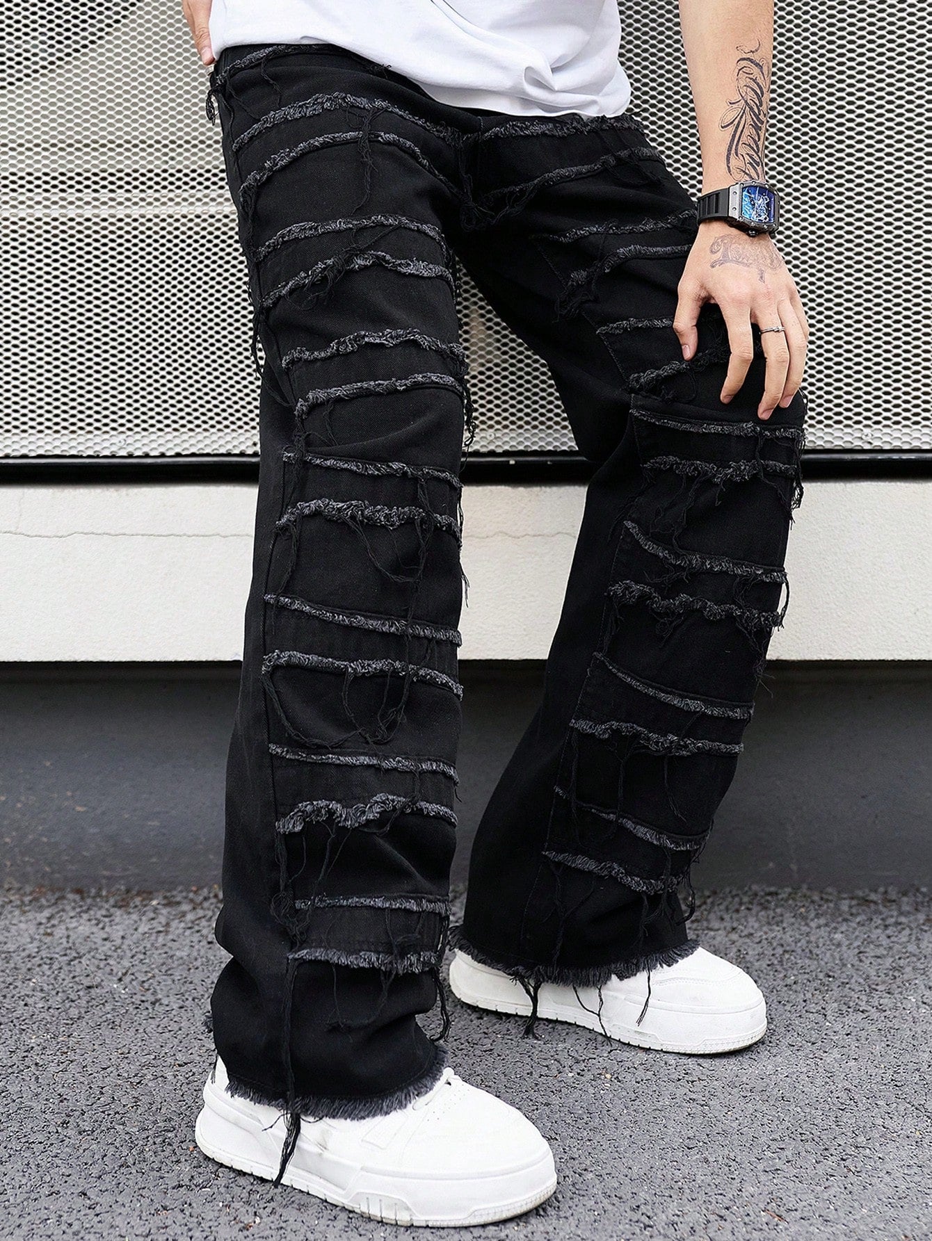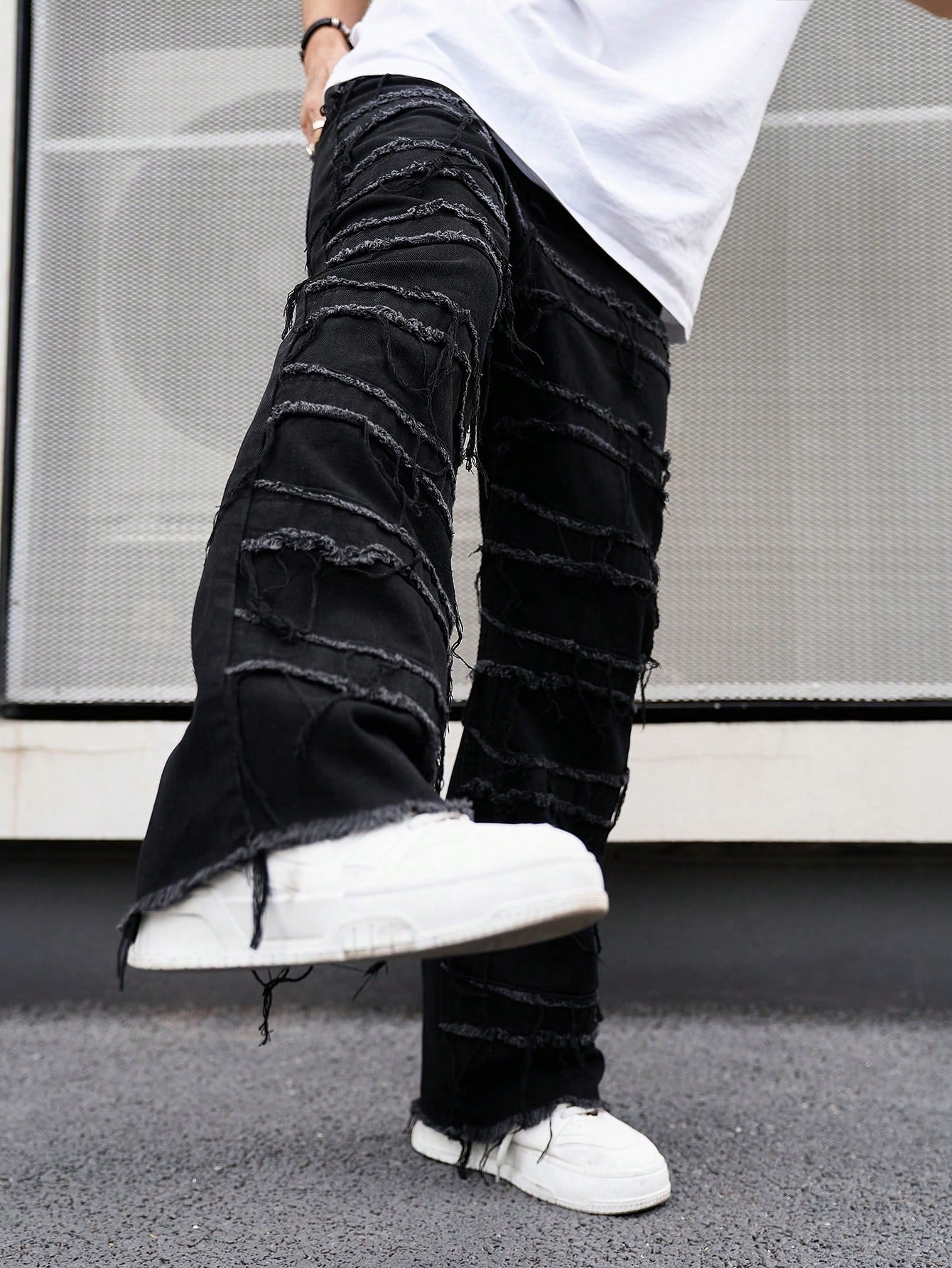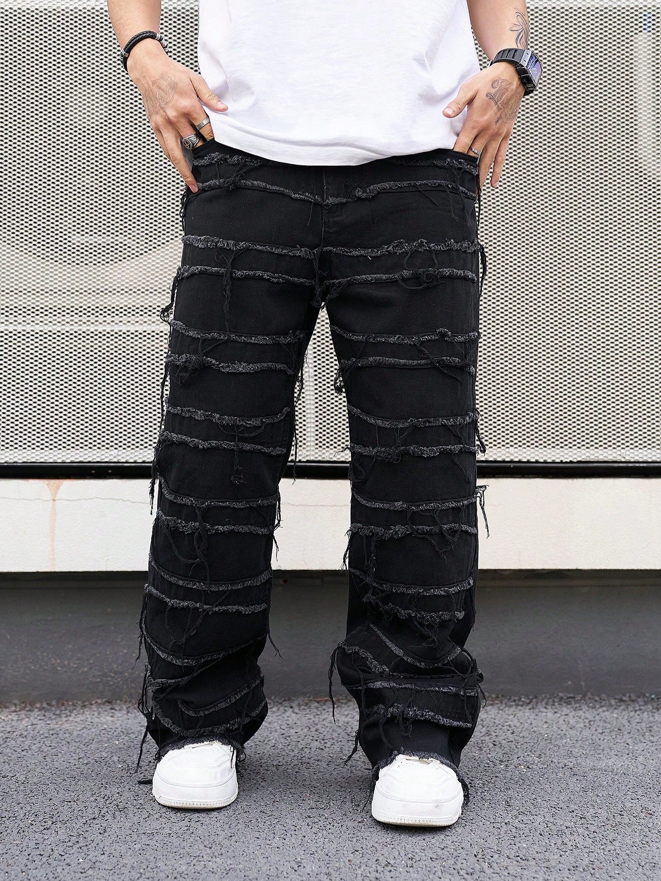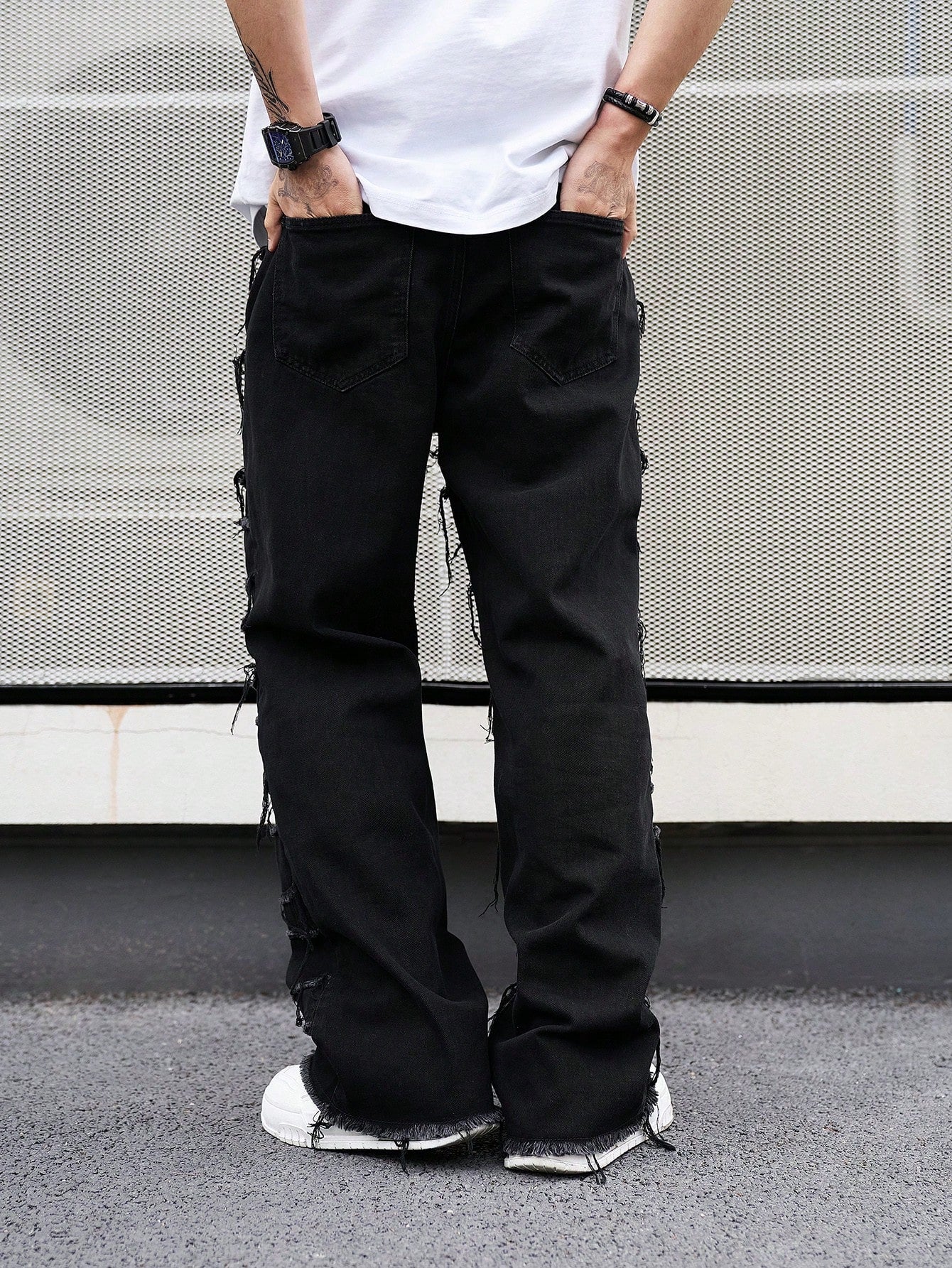 Manfinity ZONE917 Men's Straight Leg Jeans With Frayed Hem Plain Wide Jeans Long Baggy Plain Black Washed Cargo Jeans