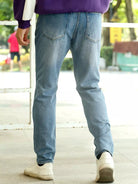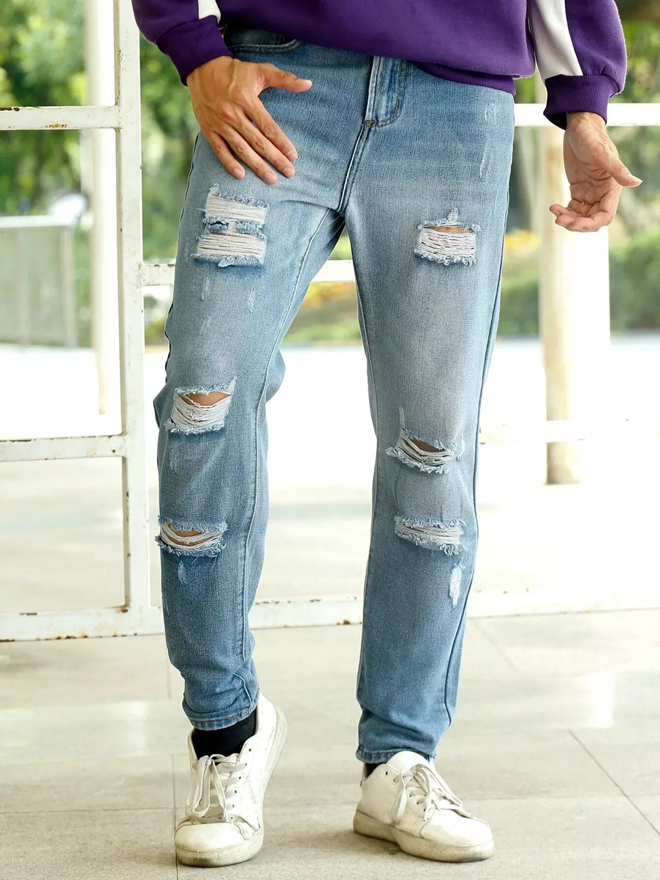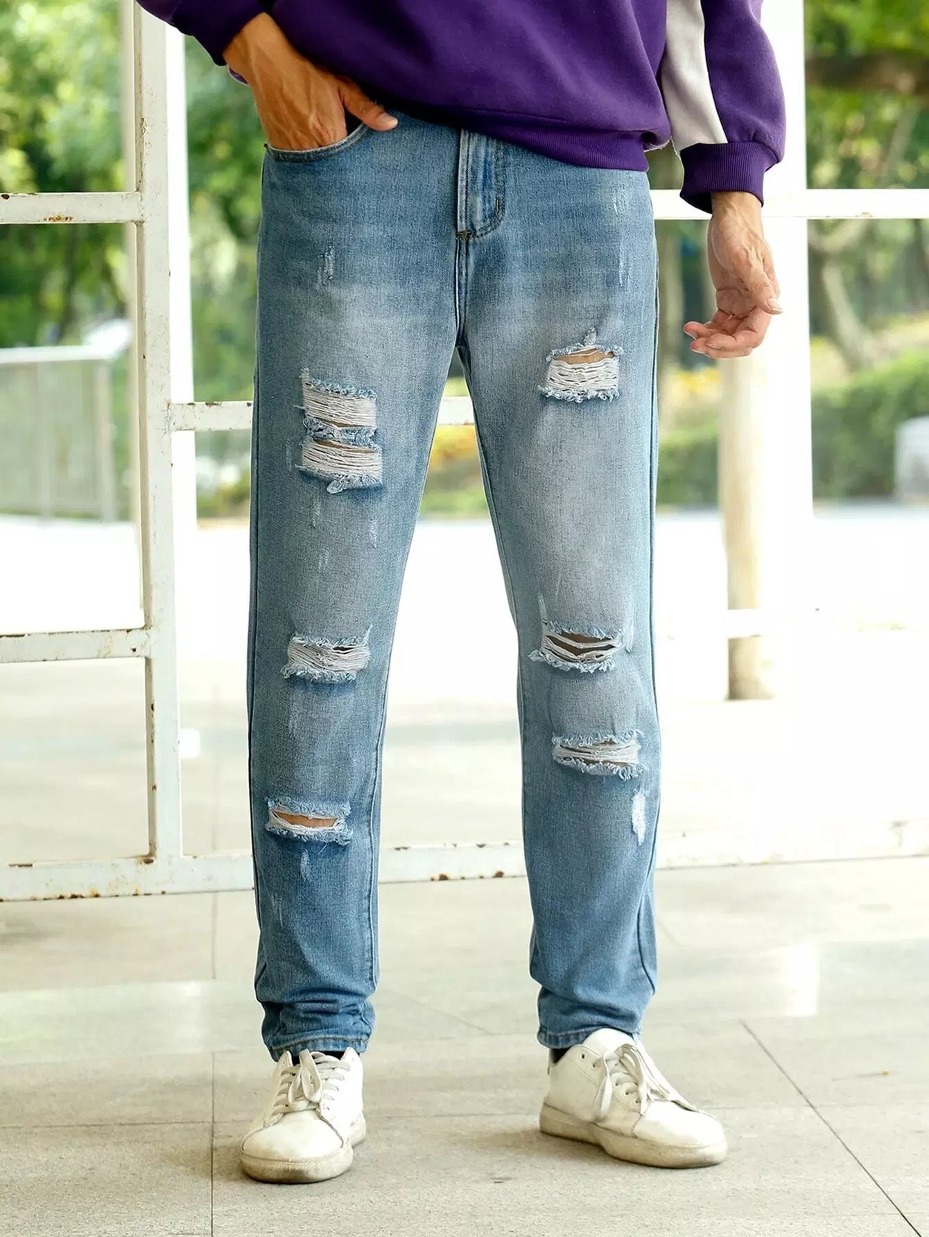 Men Ripped Frayed Bleach Wash Cat Scratch Jeans
