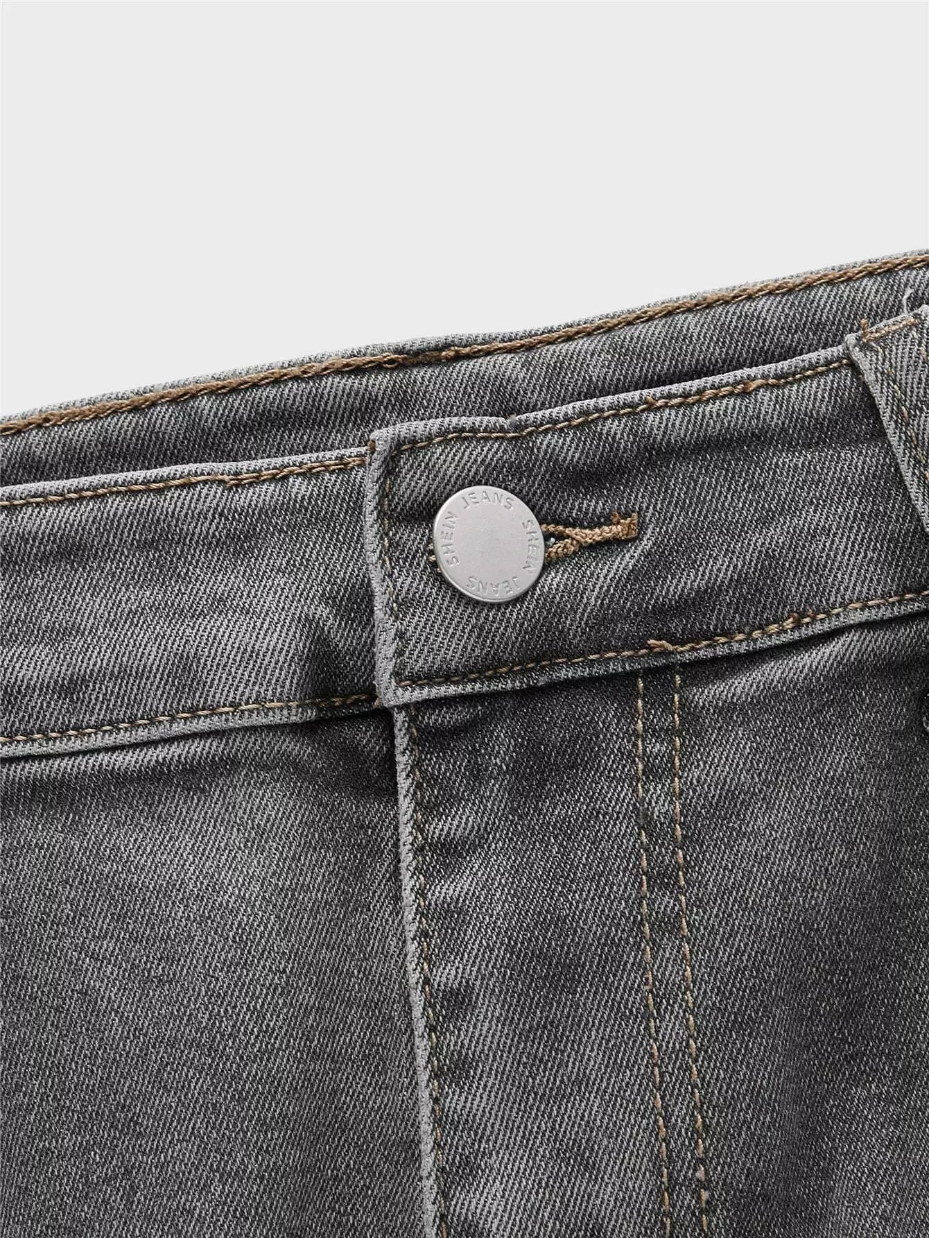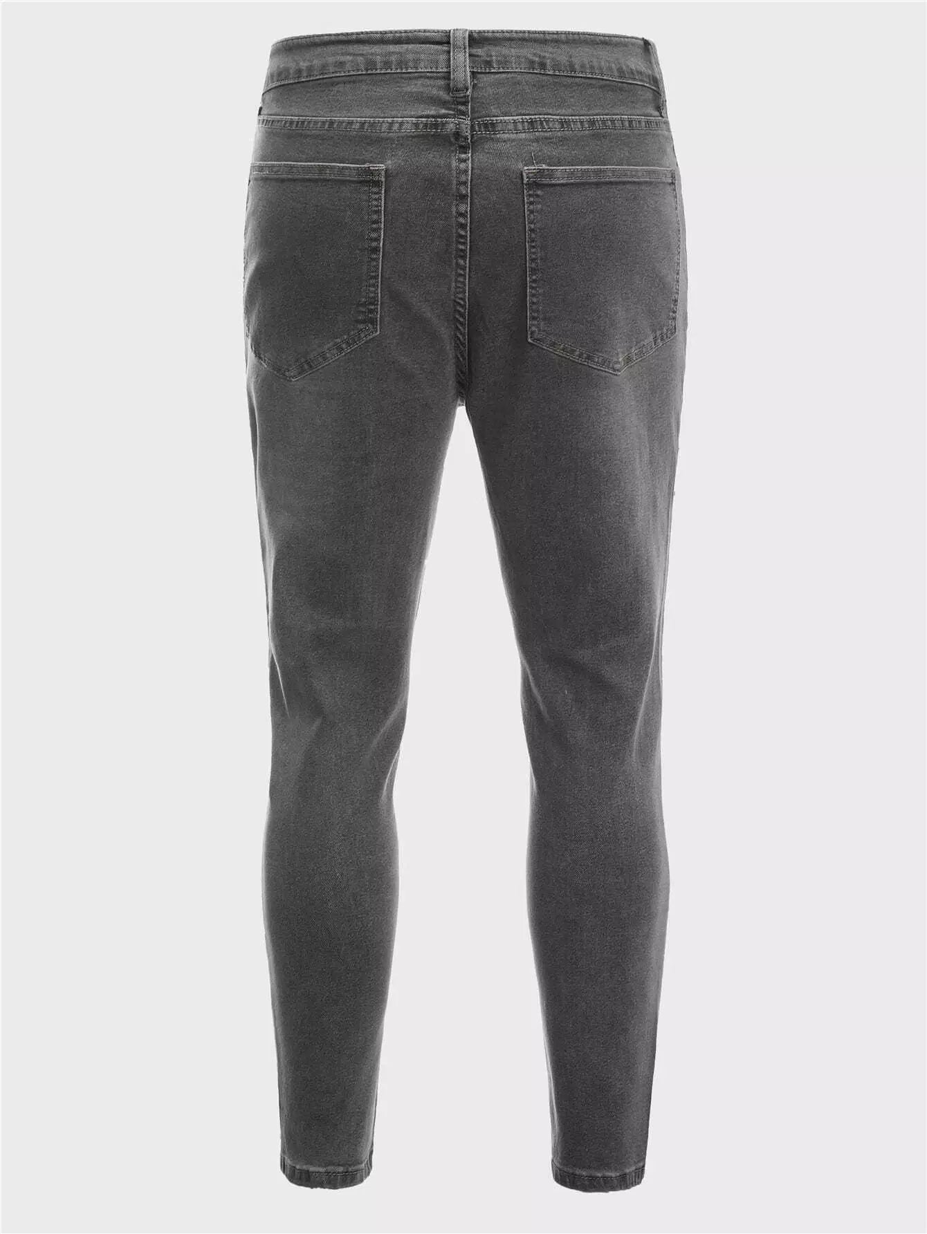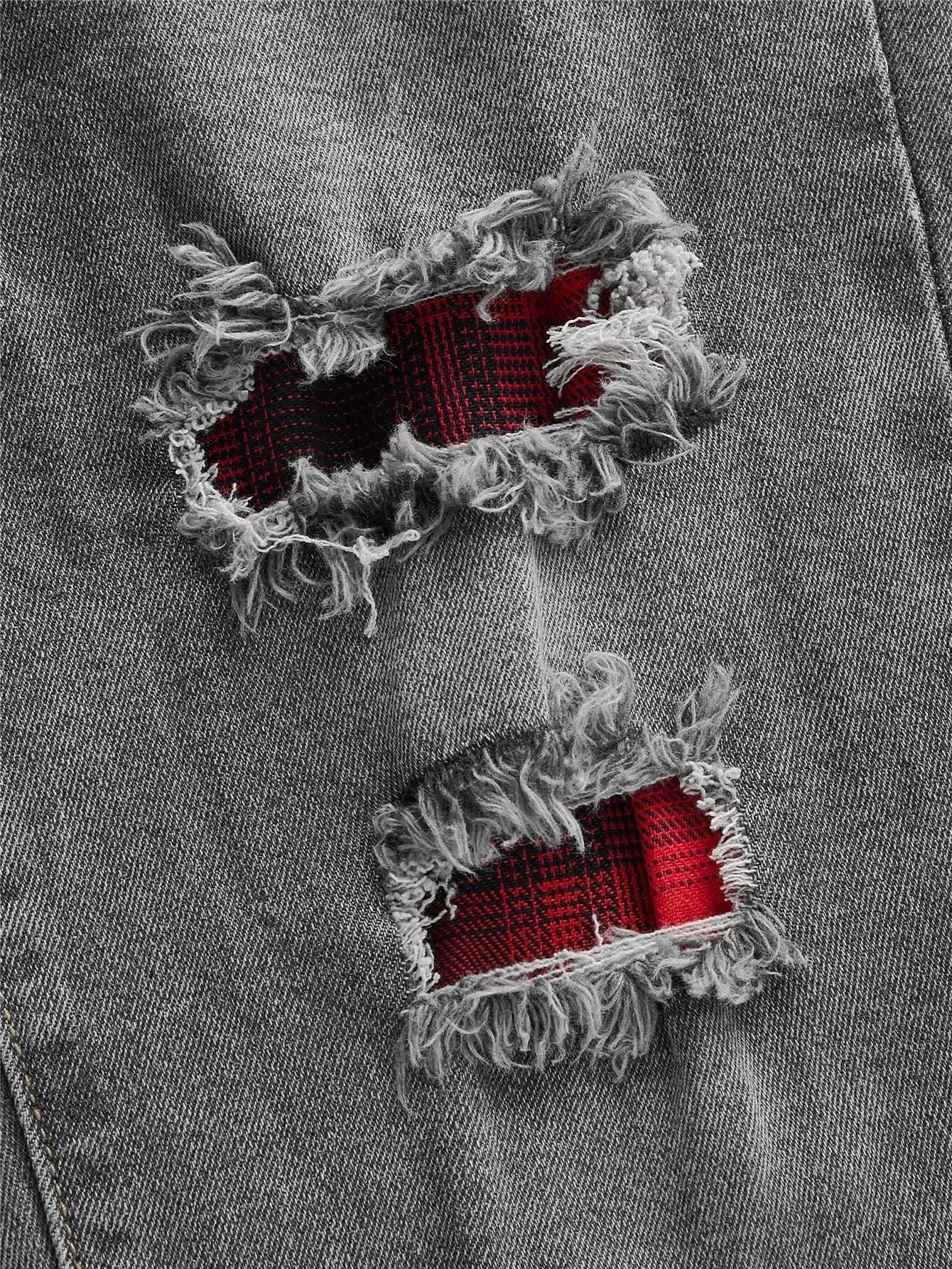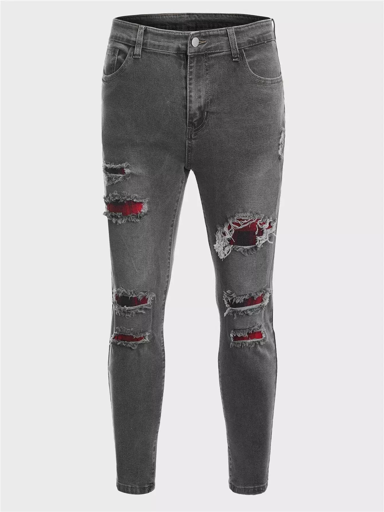 Men Zipper Fly Plaid Panel Ripped Jeans