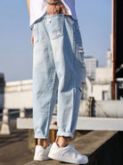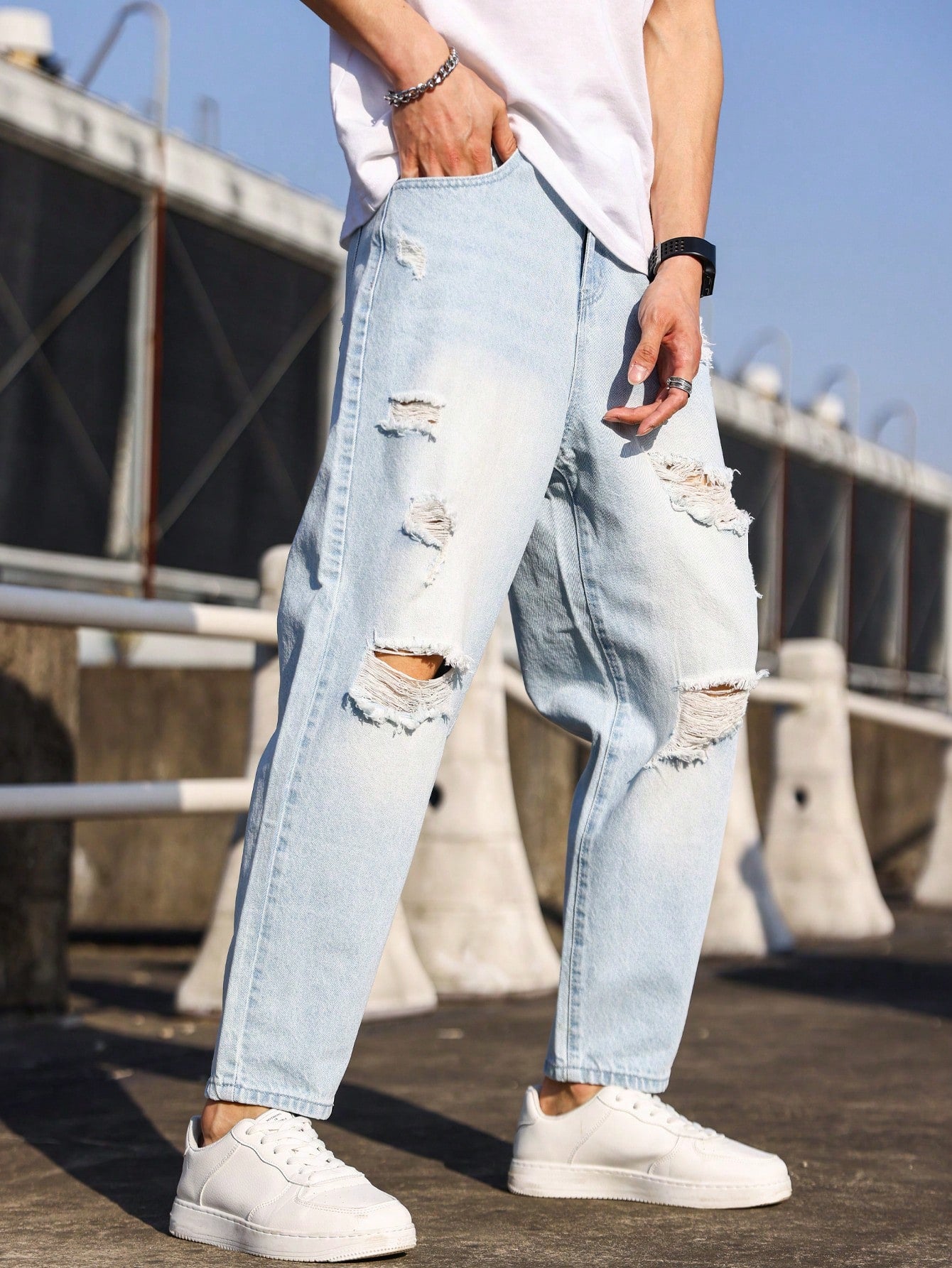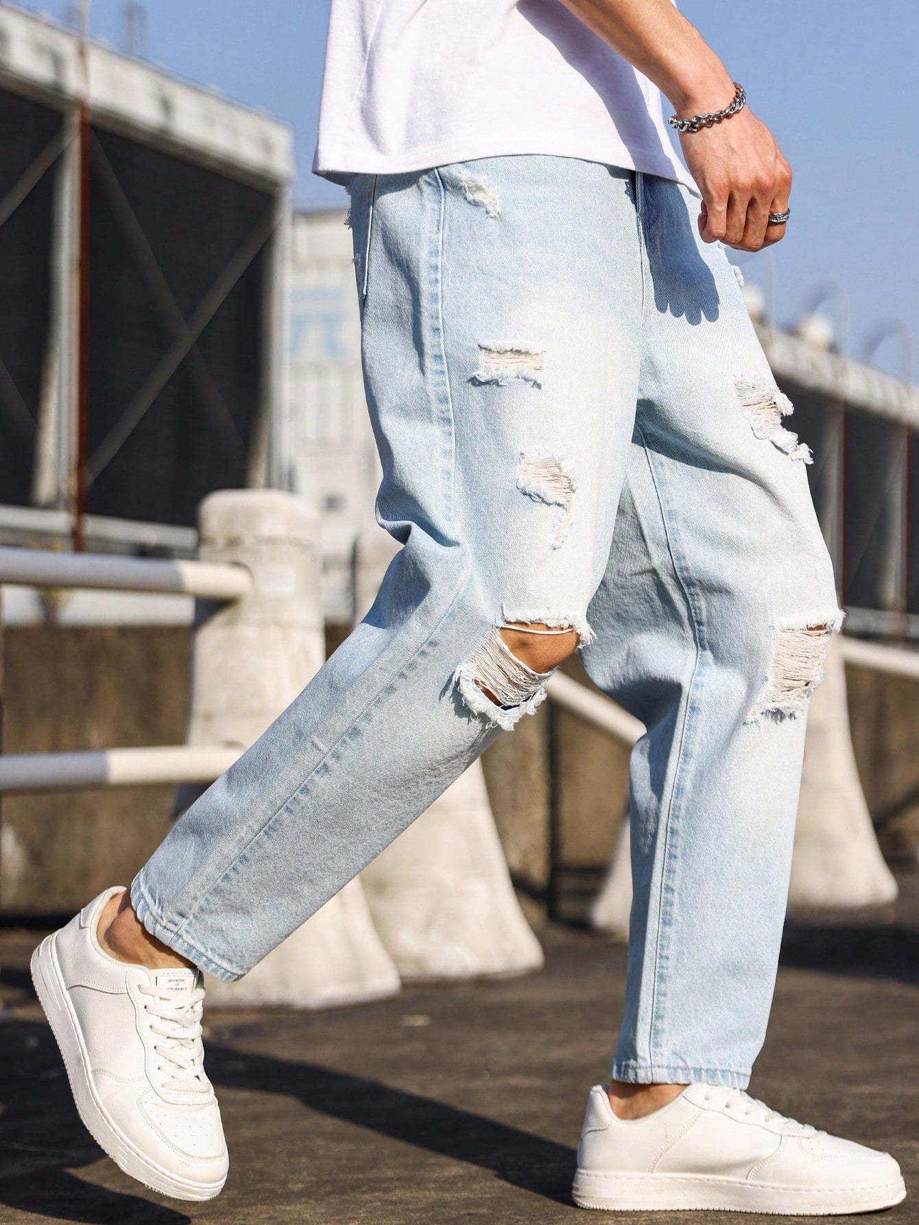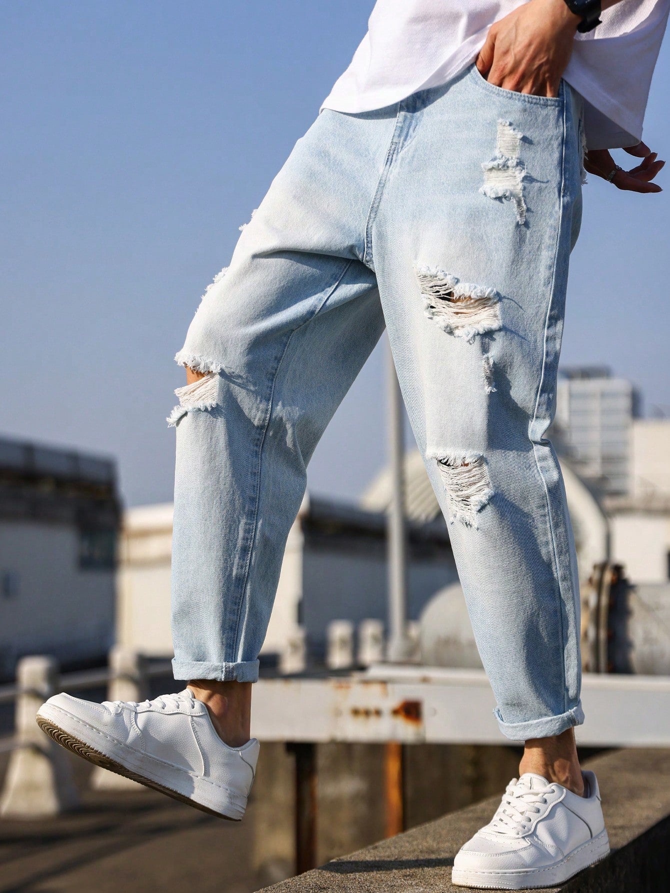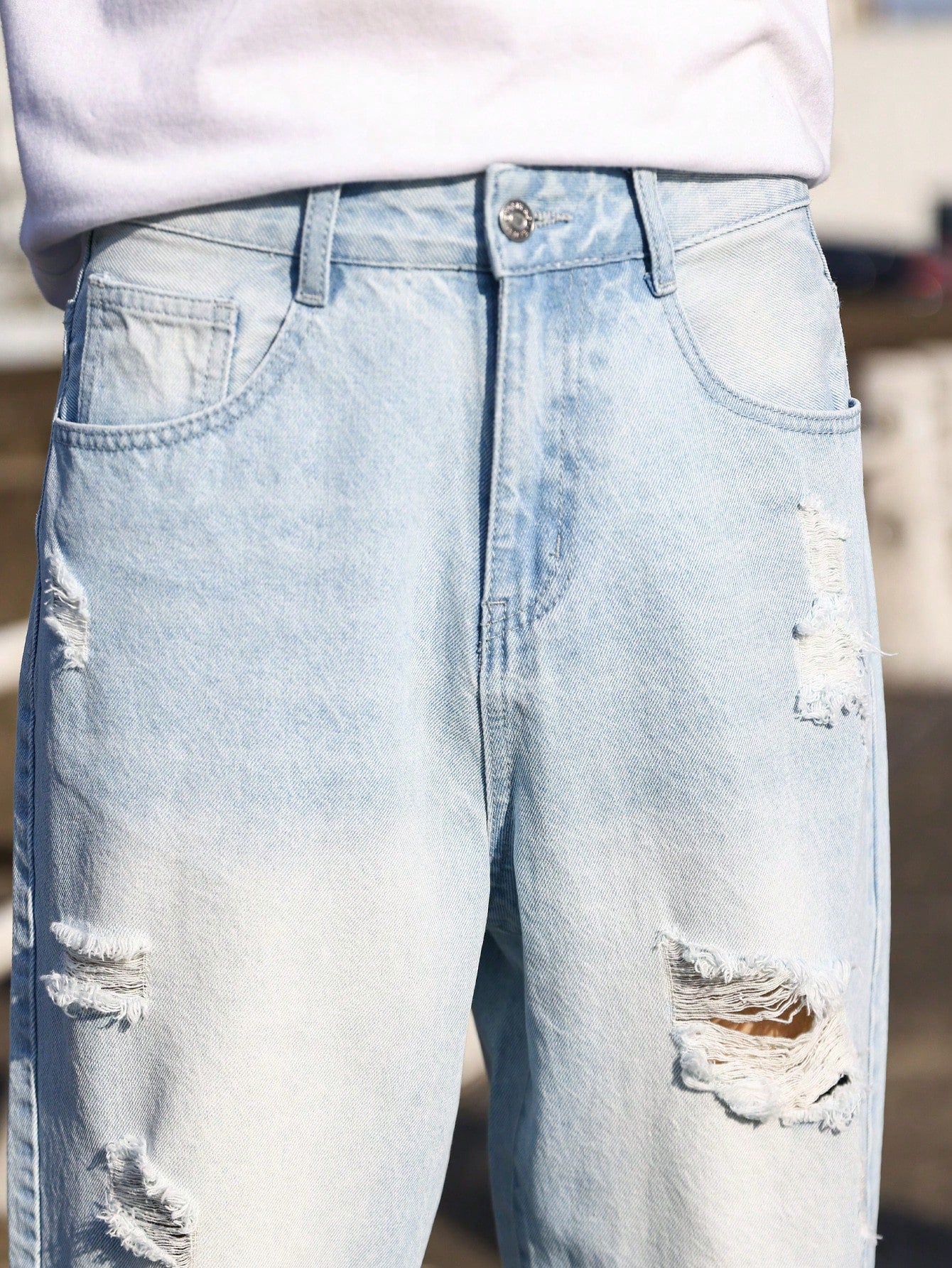 Manfinity Roghcode Men's Ripped And Washed Loose Fit Jeans Baggy Long Frayed Jean Cargo Plain Light Blue