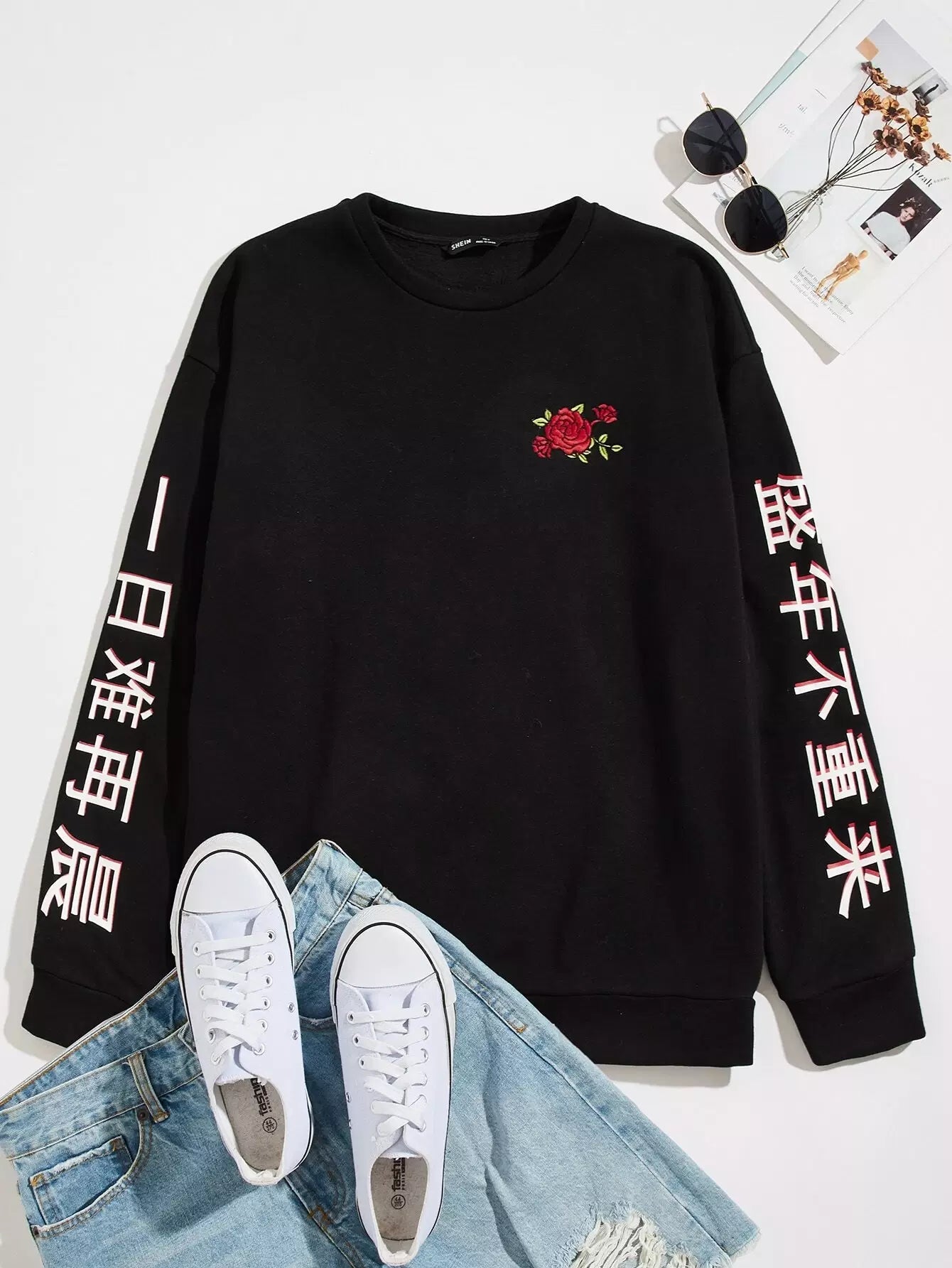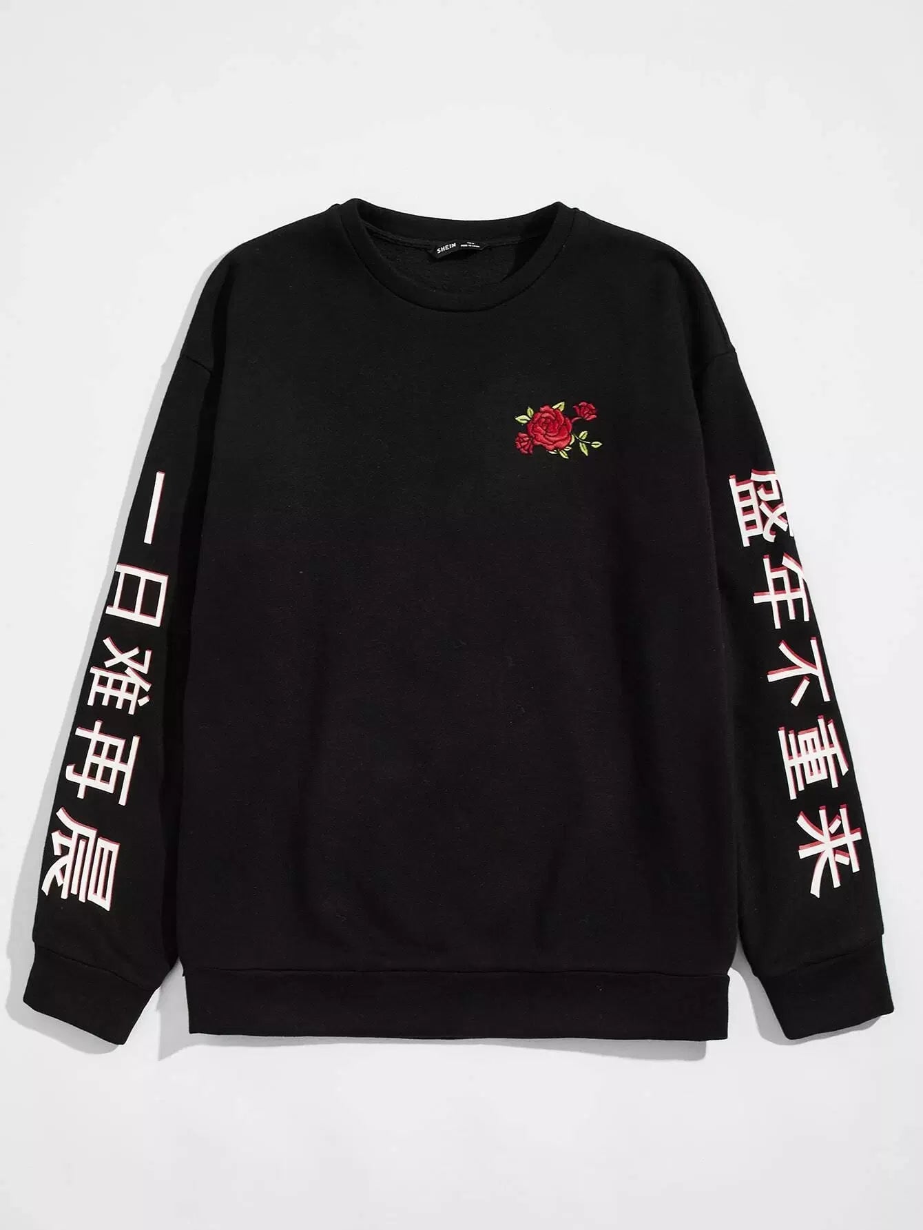 Men Chinese Letter Graphic Floral Embroidery Pullover