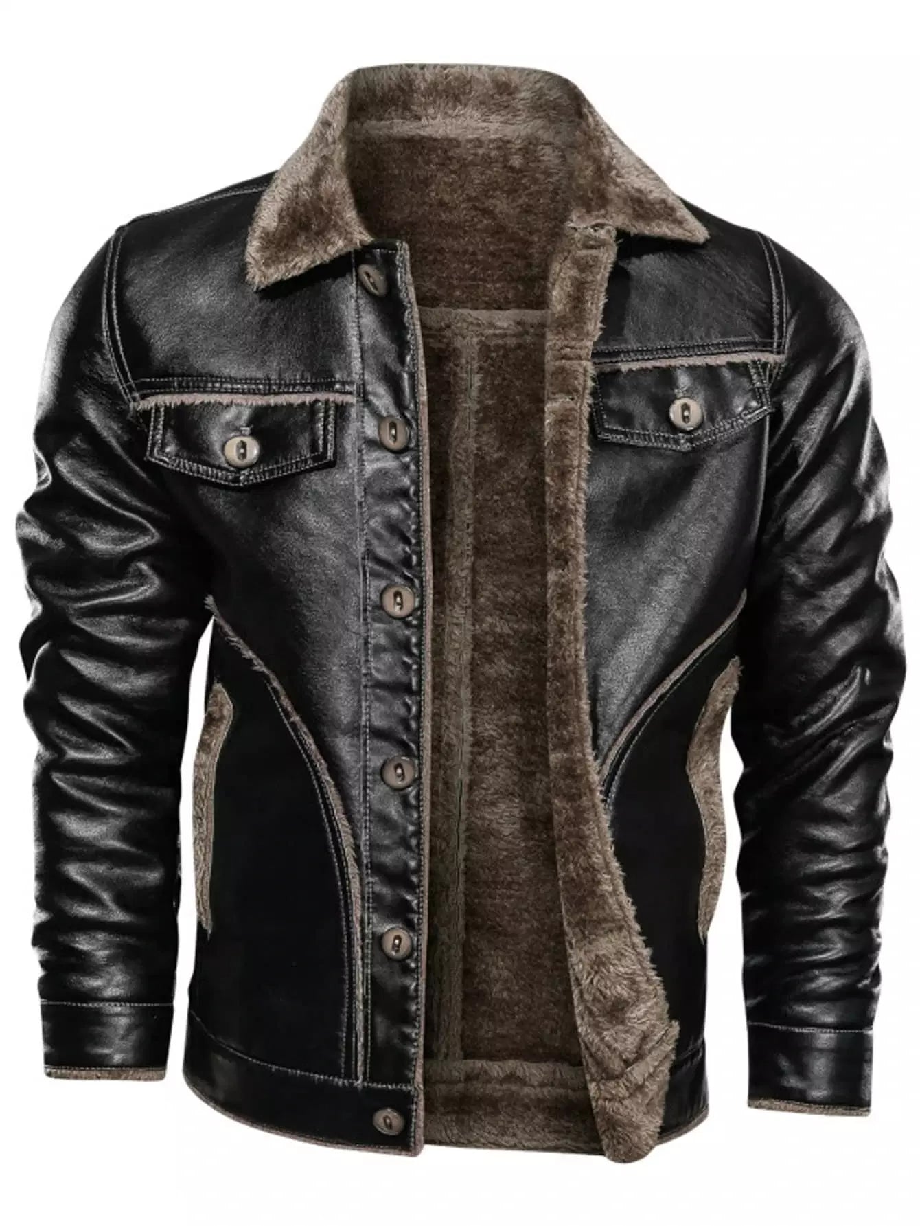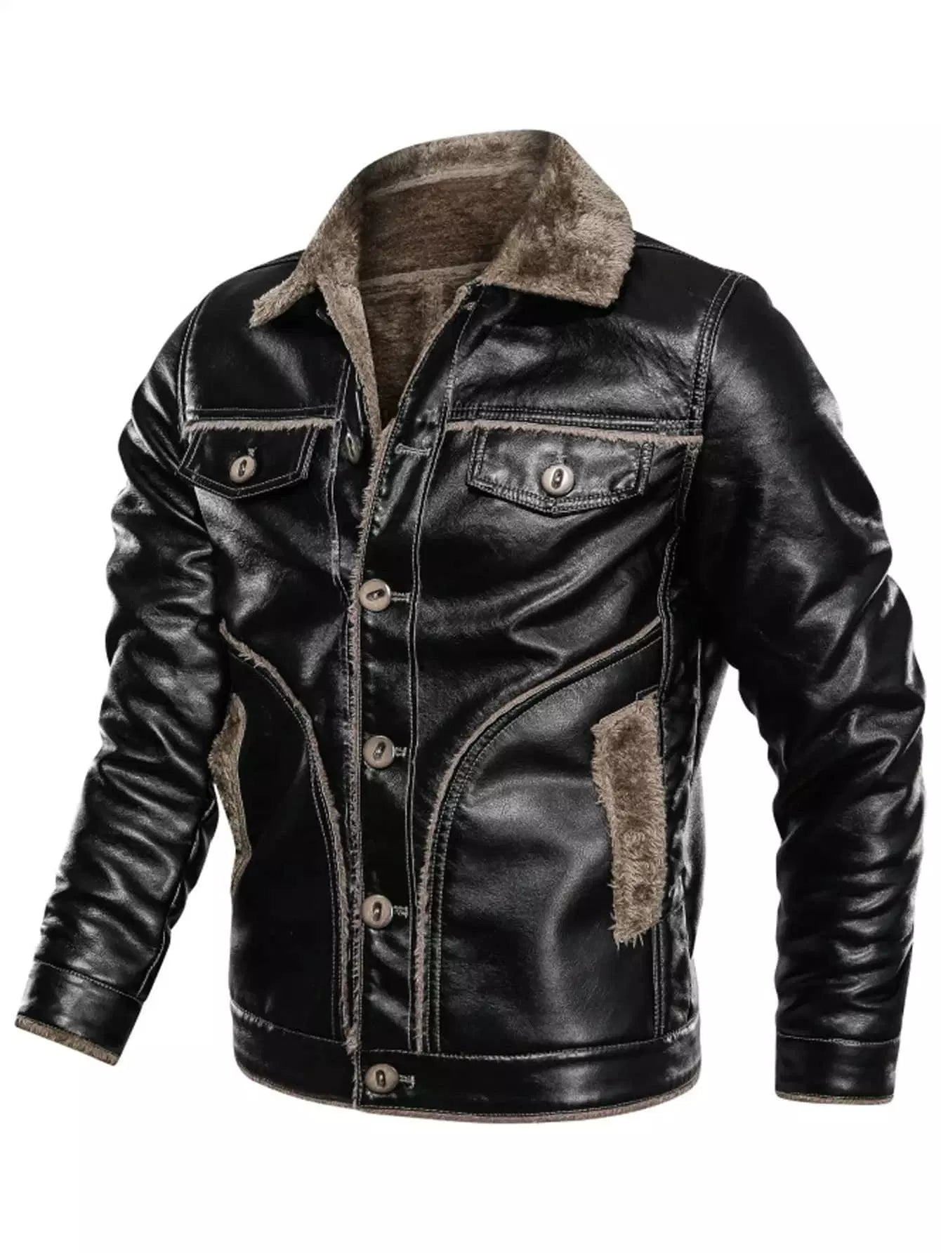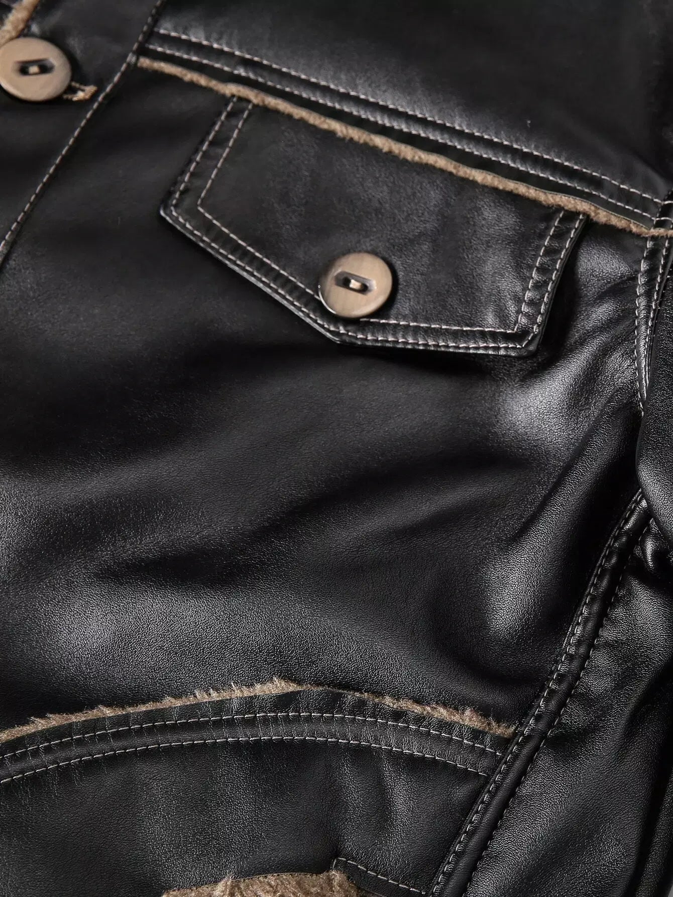 Men Slant Pockets Teddy Lined PU Leather Jacket