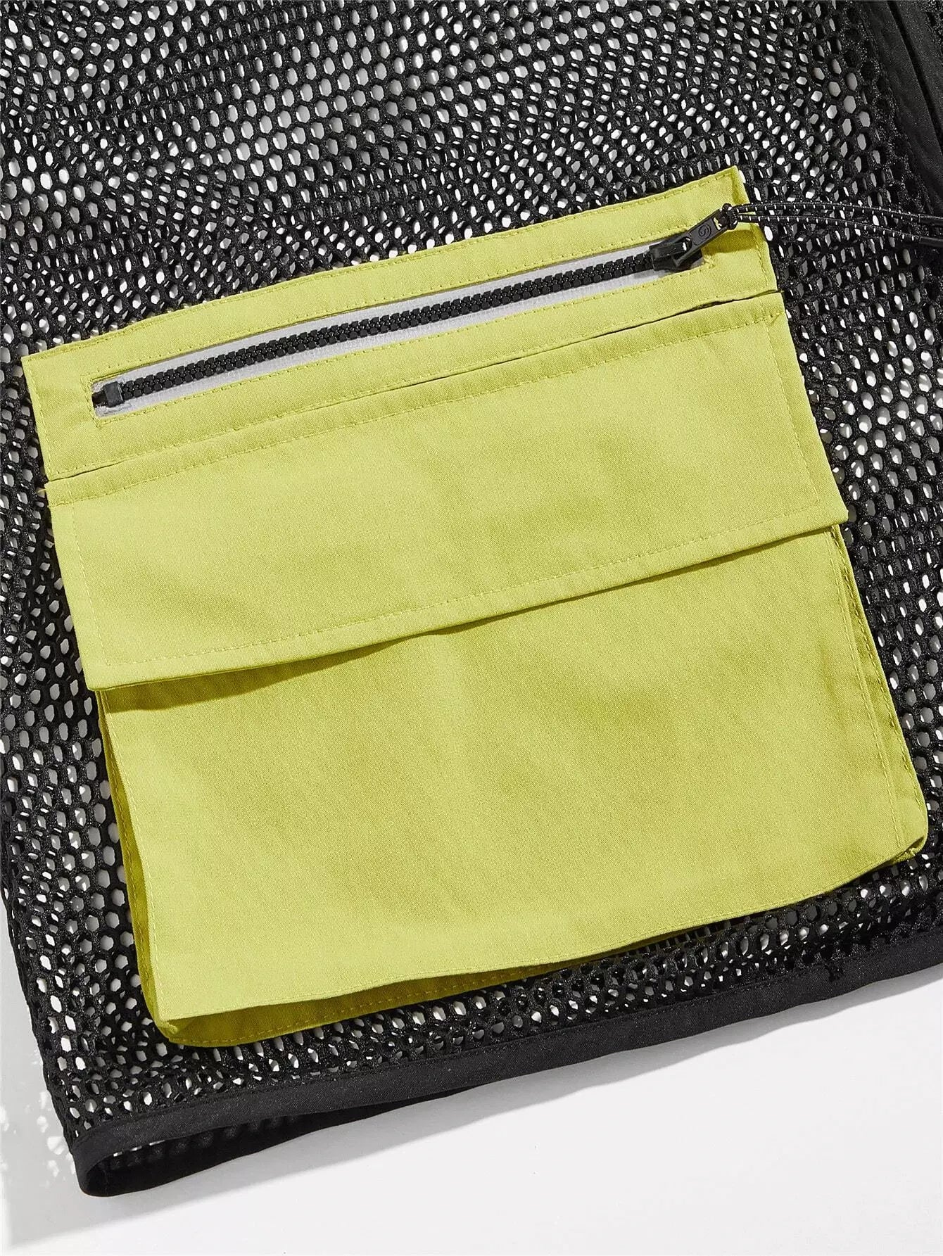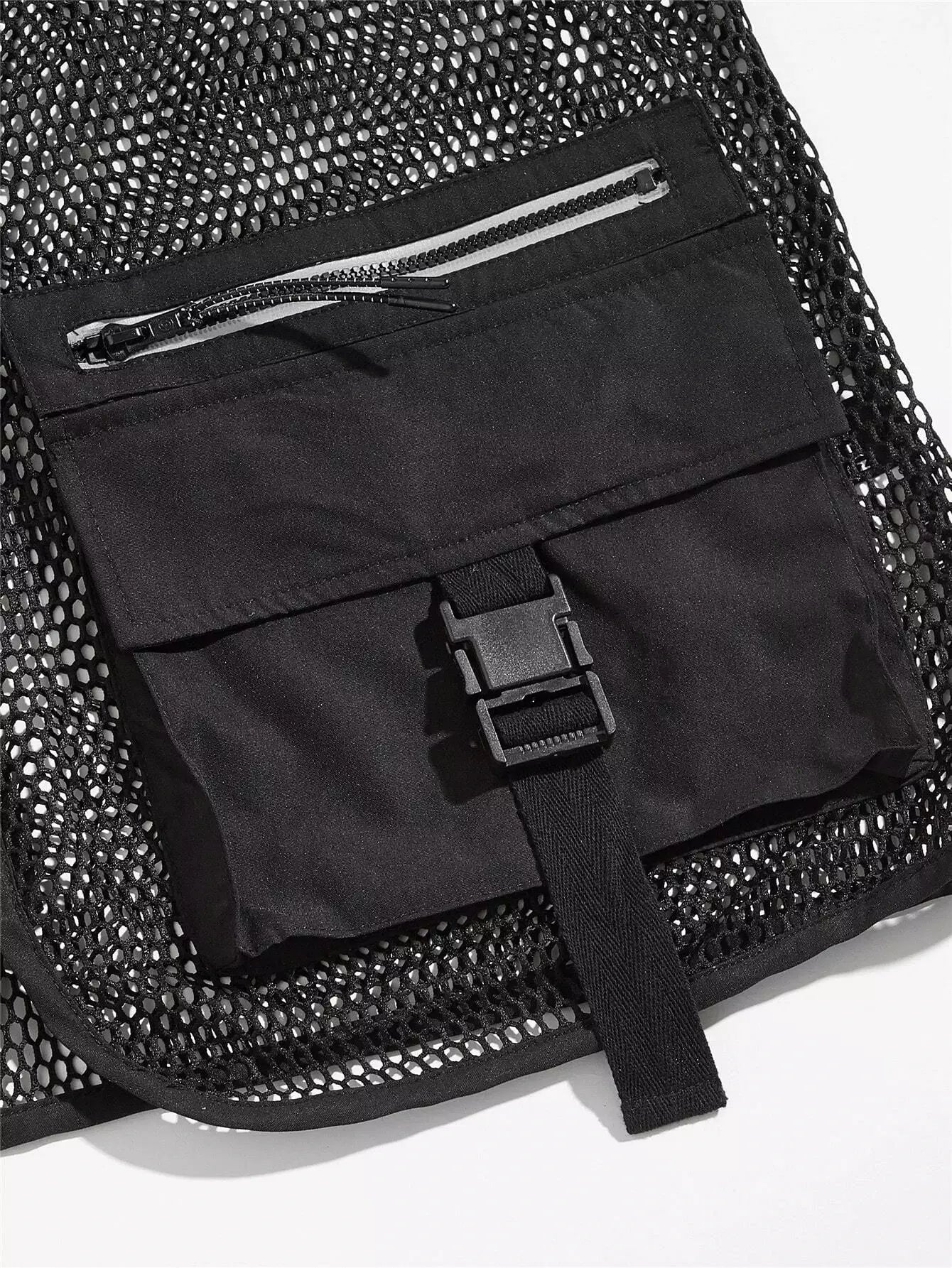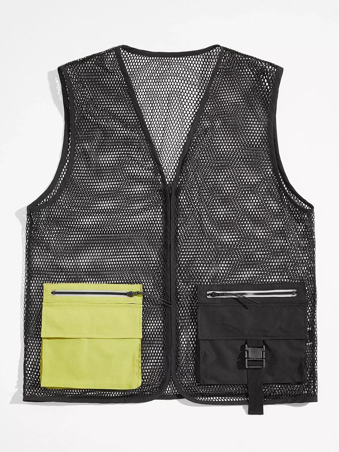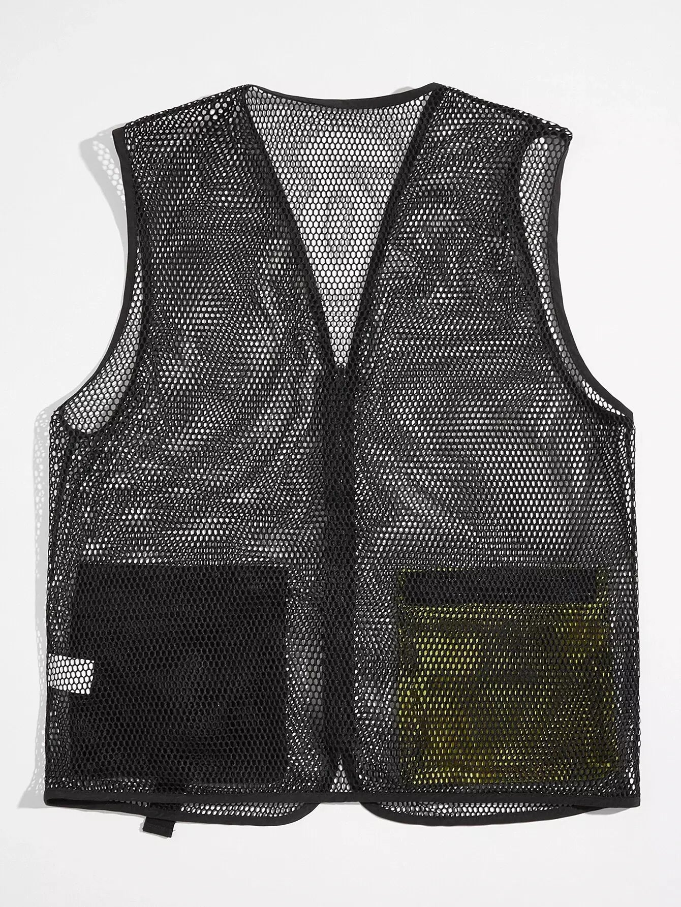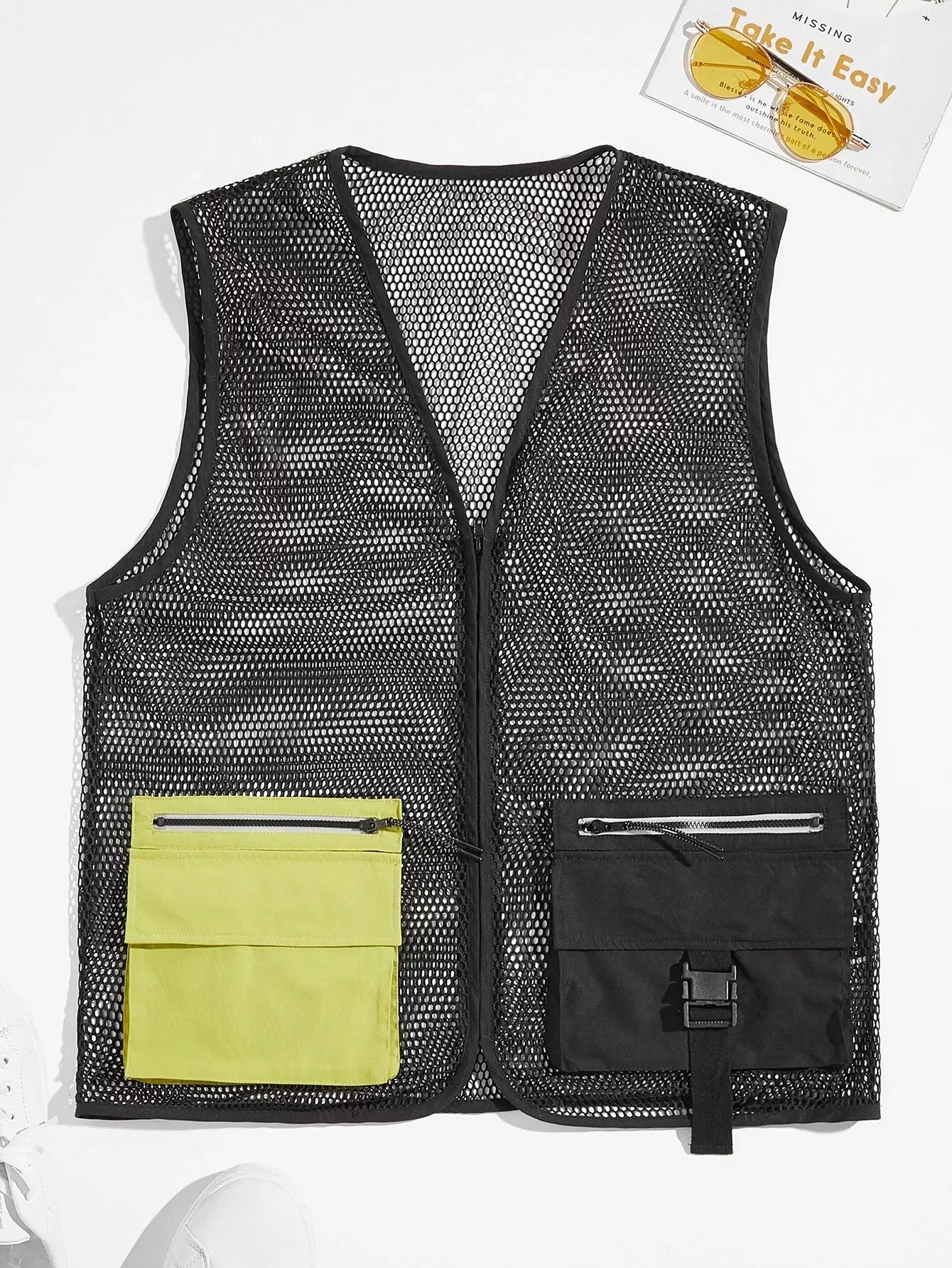 Men Zip-Front Dual Flap Pocket Fishnet Mesh Vest Jacket