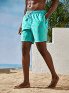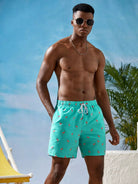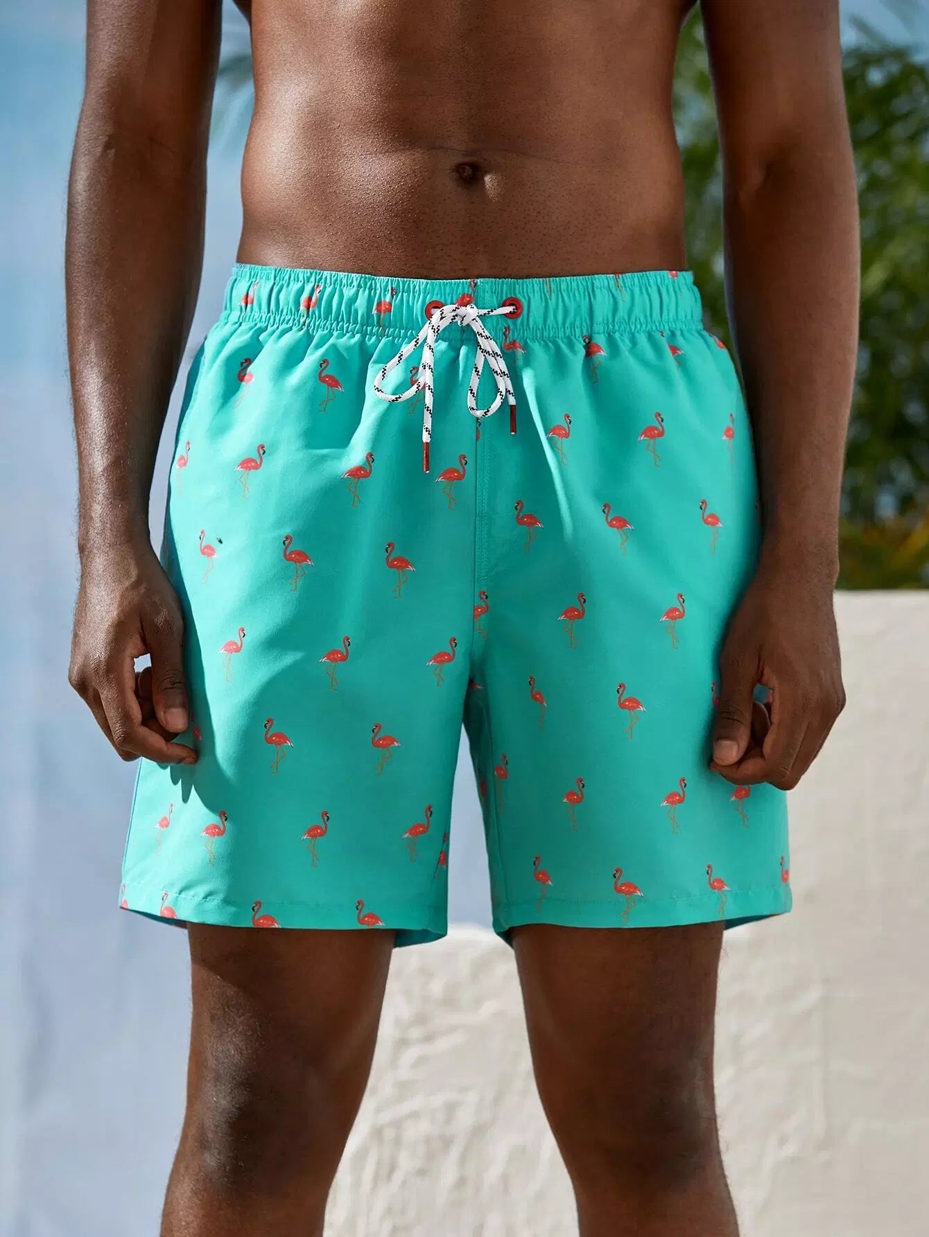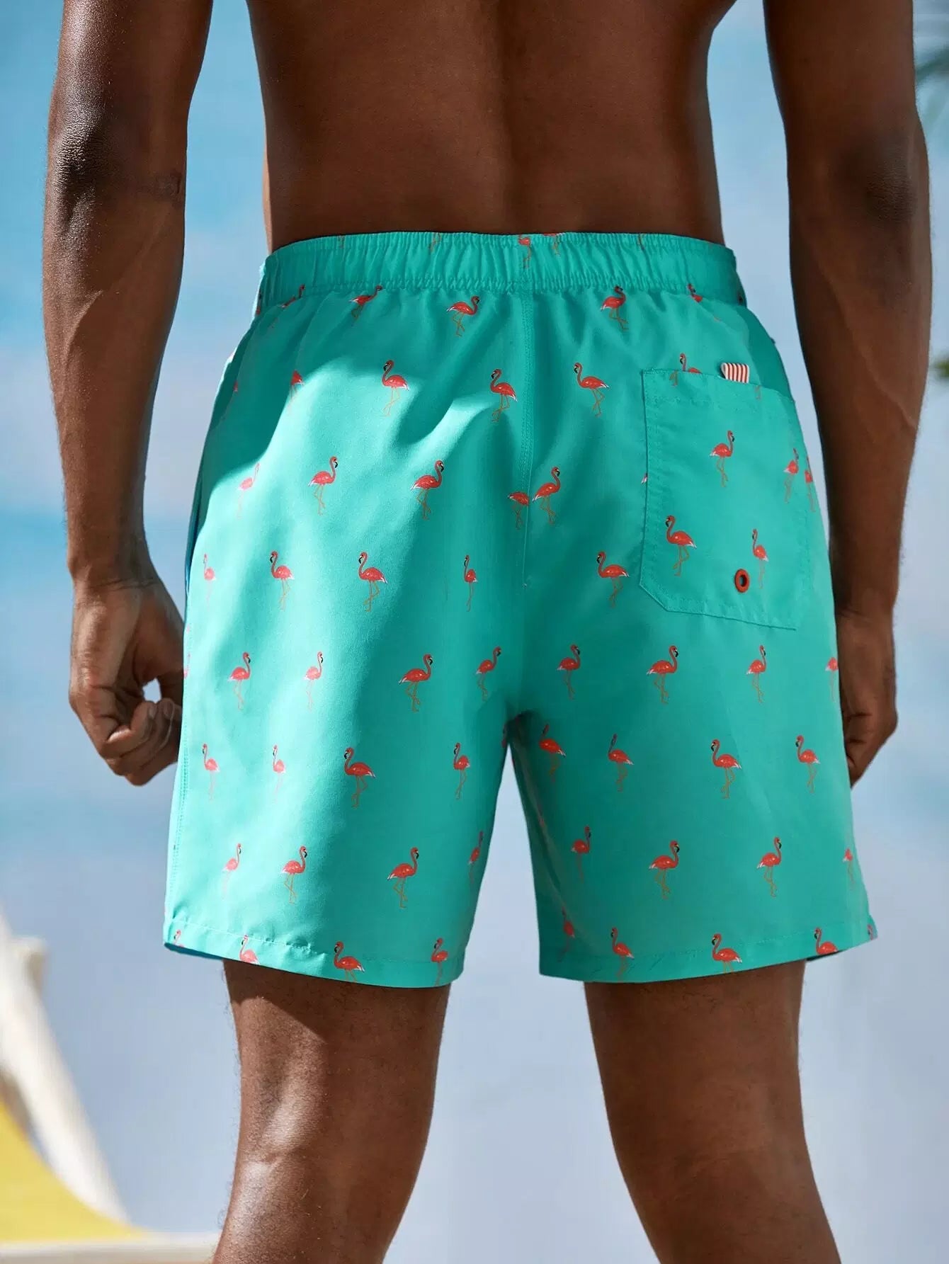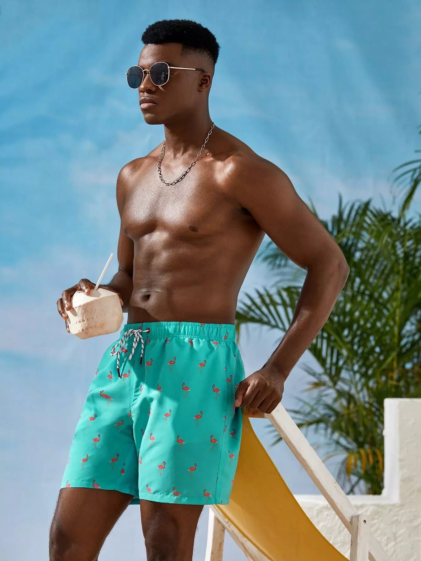Men Flamingo Print Drawstring Waist Swim Trunks