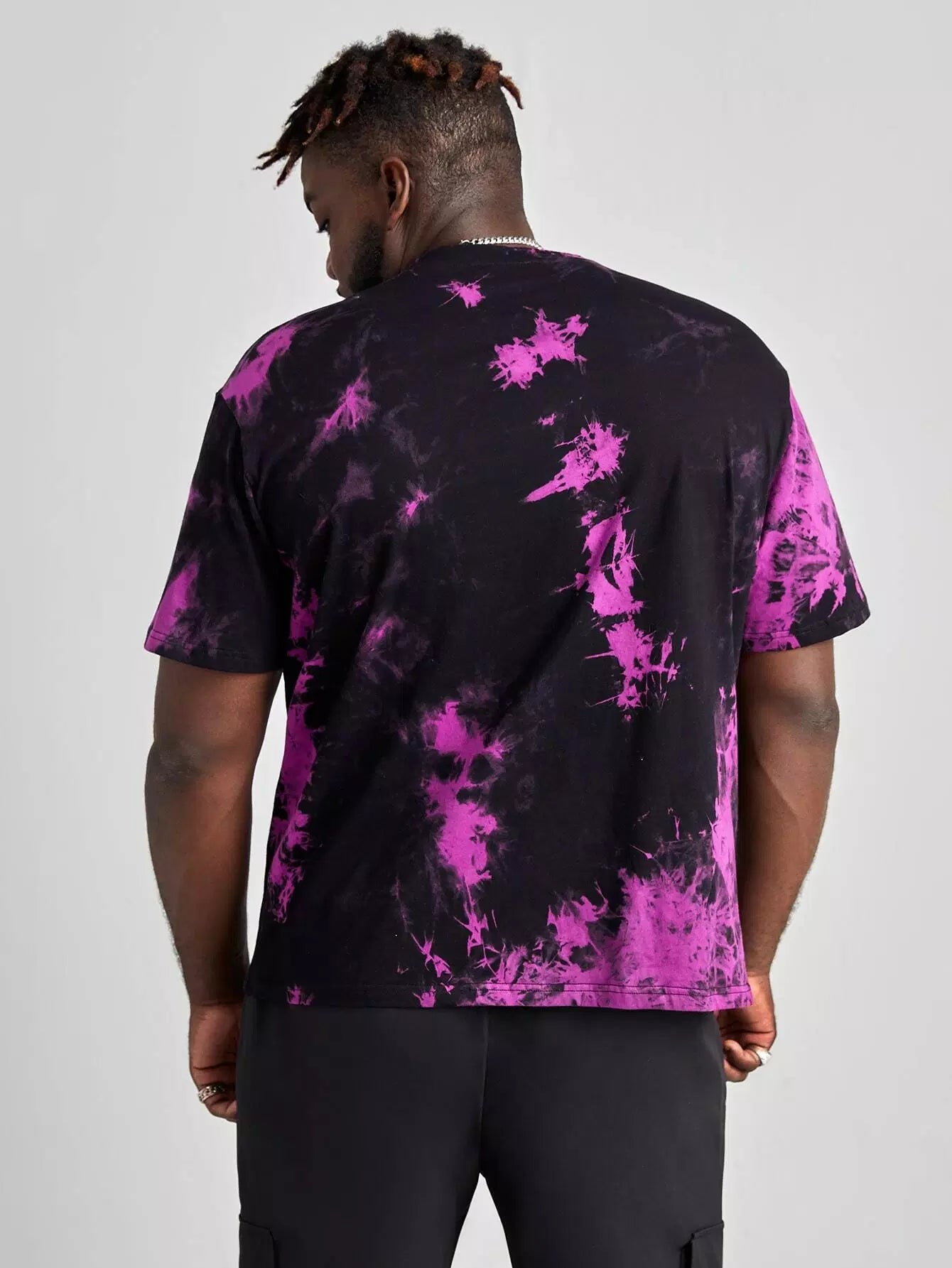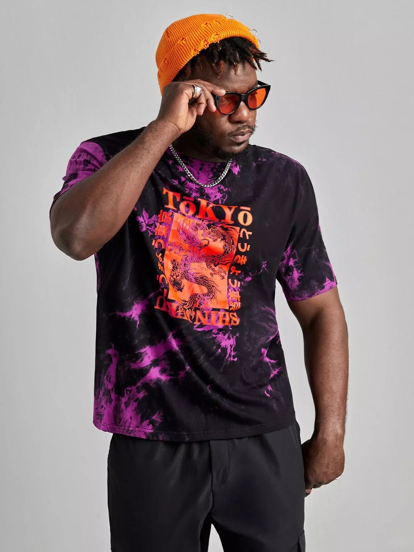 Men Tie Dye Japanese Letter & Chinese Dragon Graphic Tee