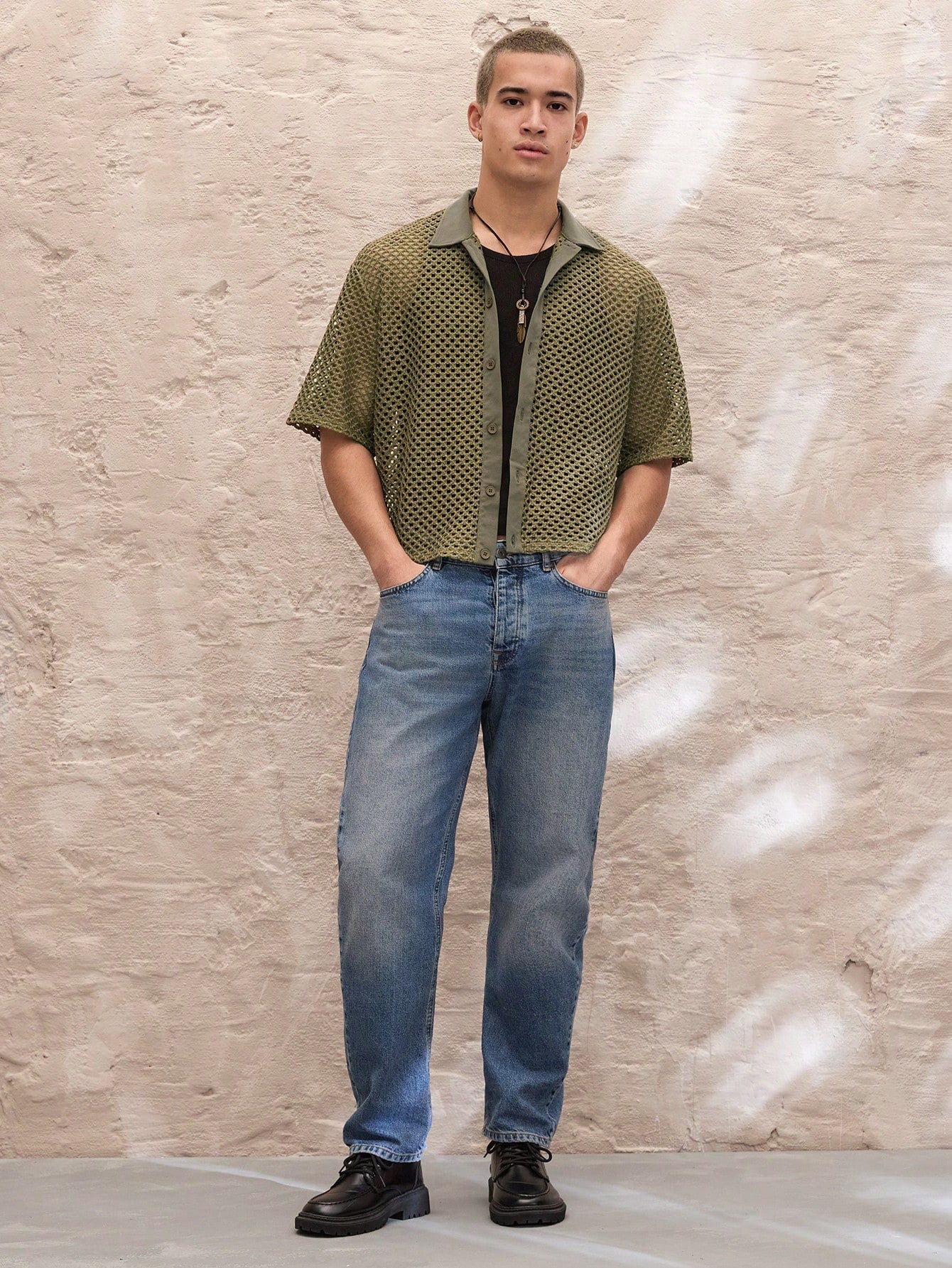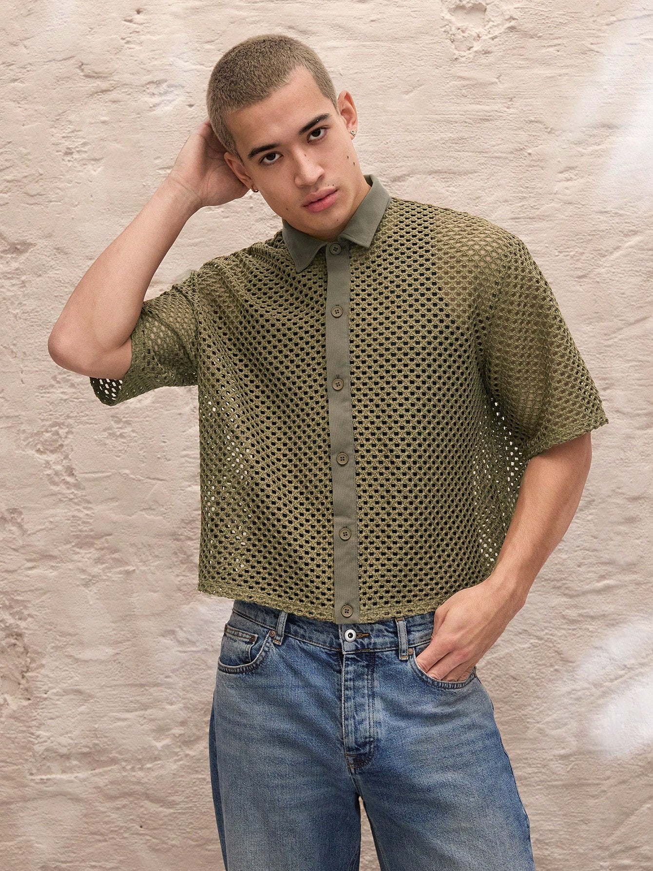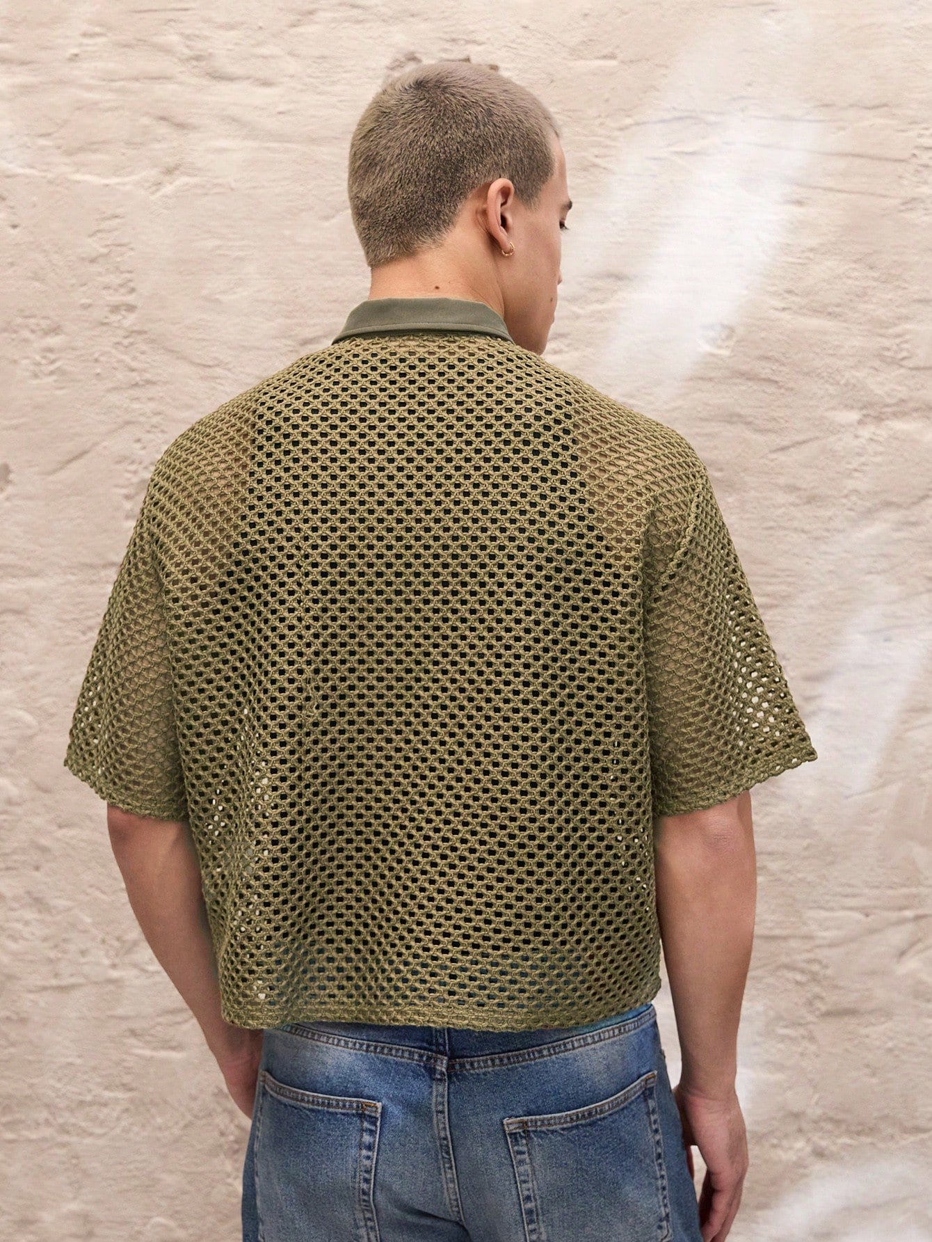 SWAVVY Regular Fit Men's Casual Knit Jacquard Hollow-Out Texture Green Loose Short Boxy Shirt