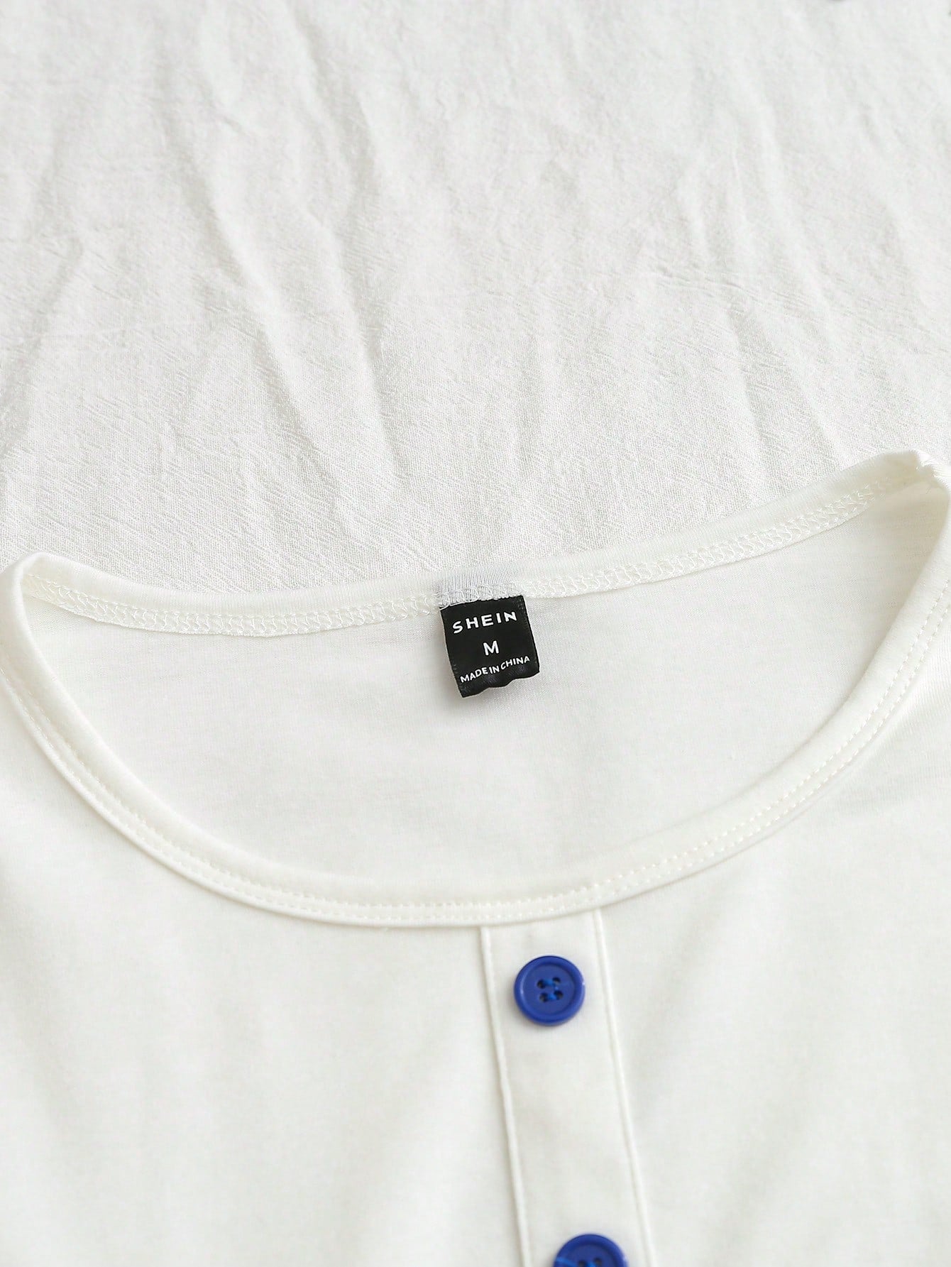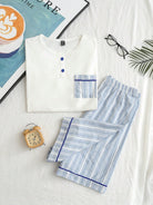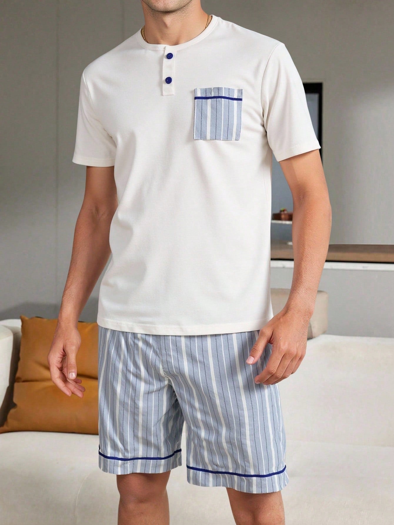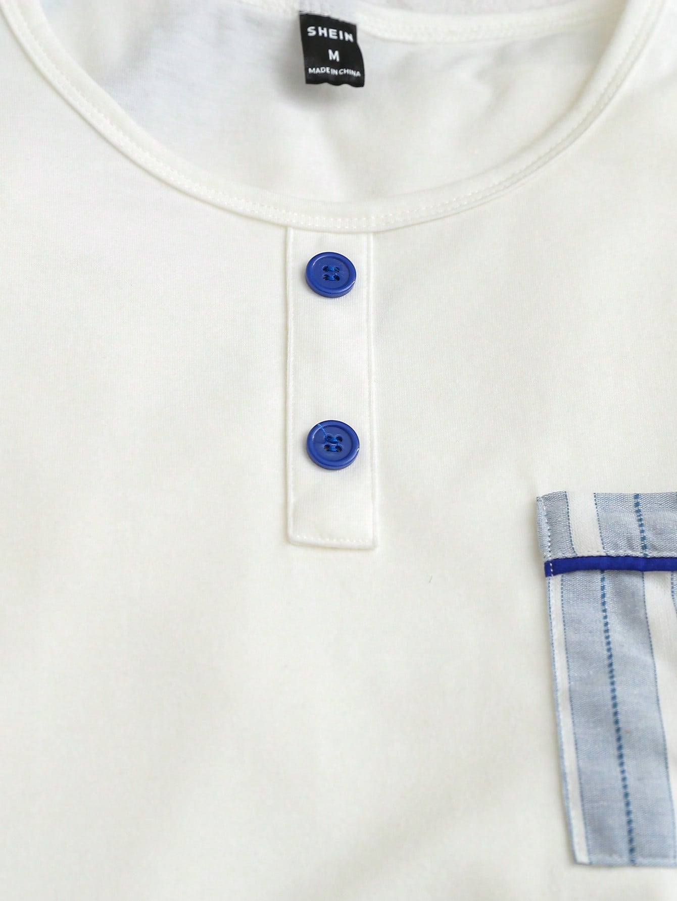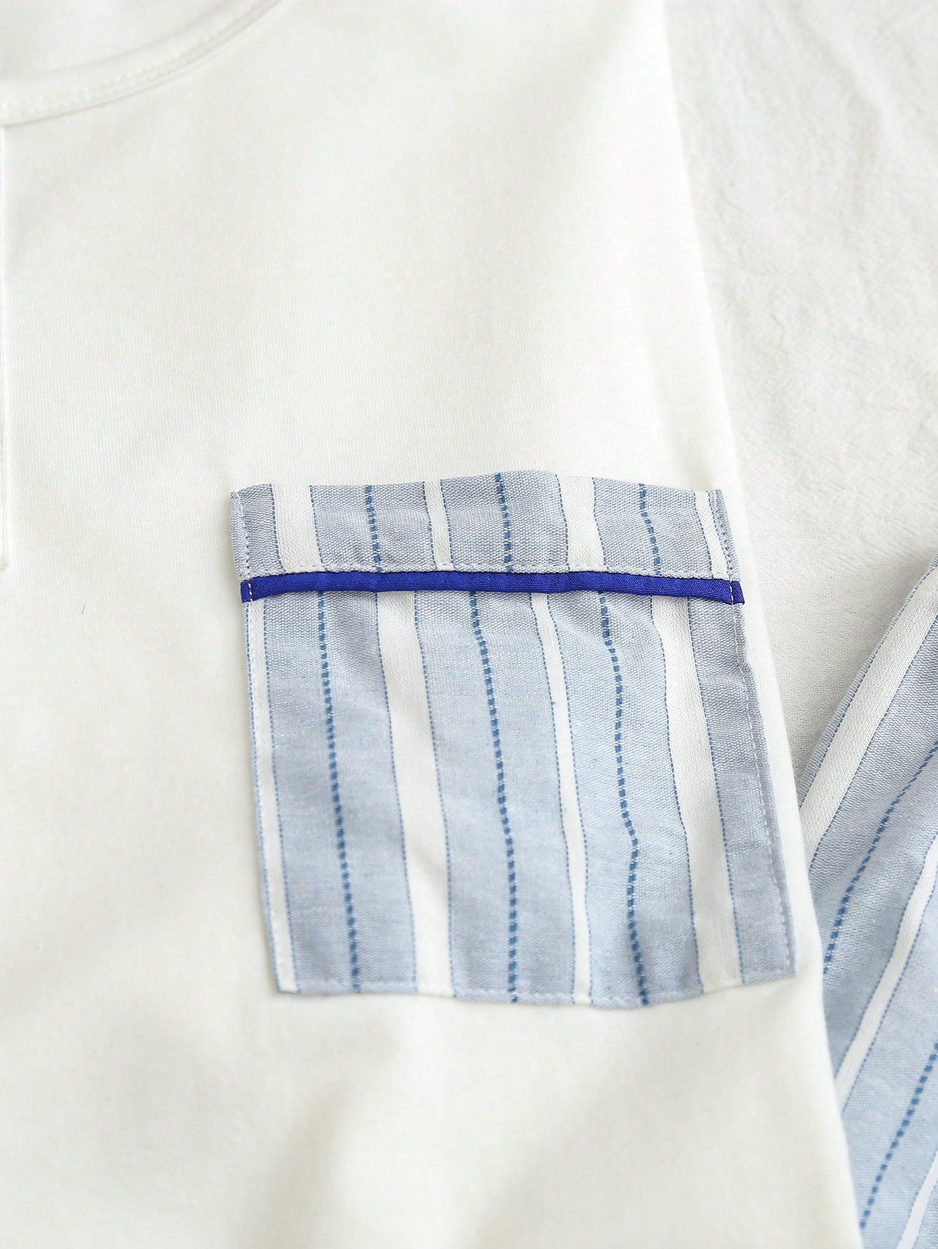 Men Soft Comfortable Minimalist White Short Sleeve Top With Fake Placket Design And Blue Striped Pocket,