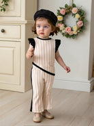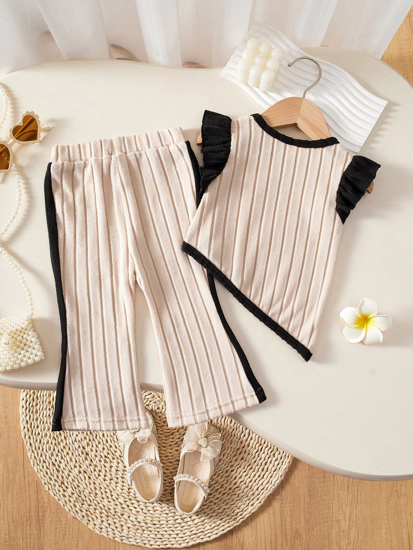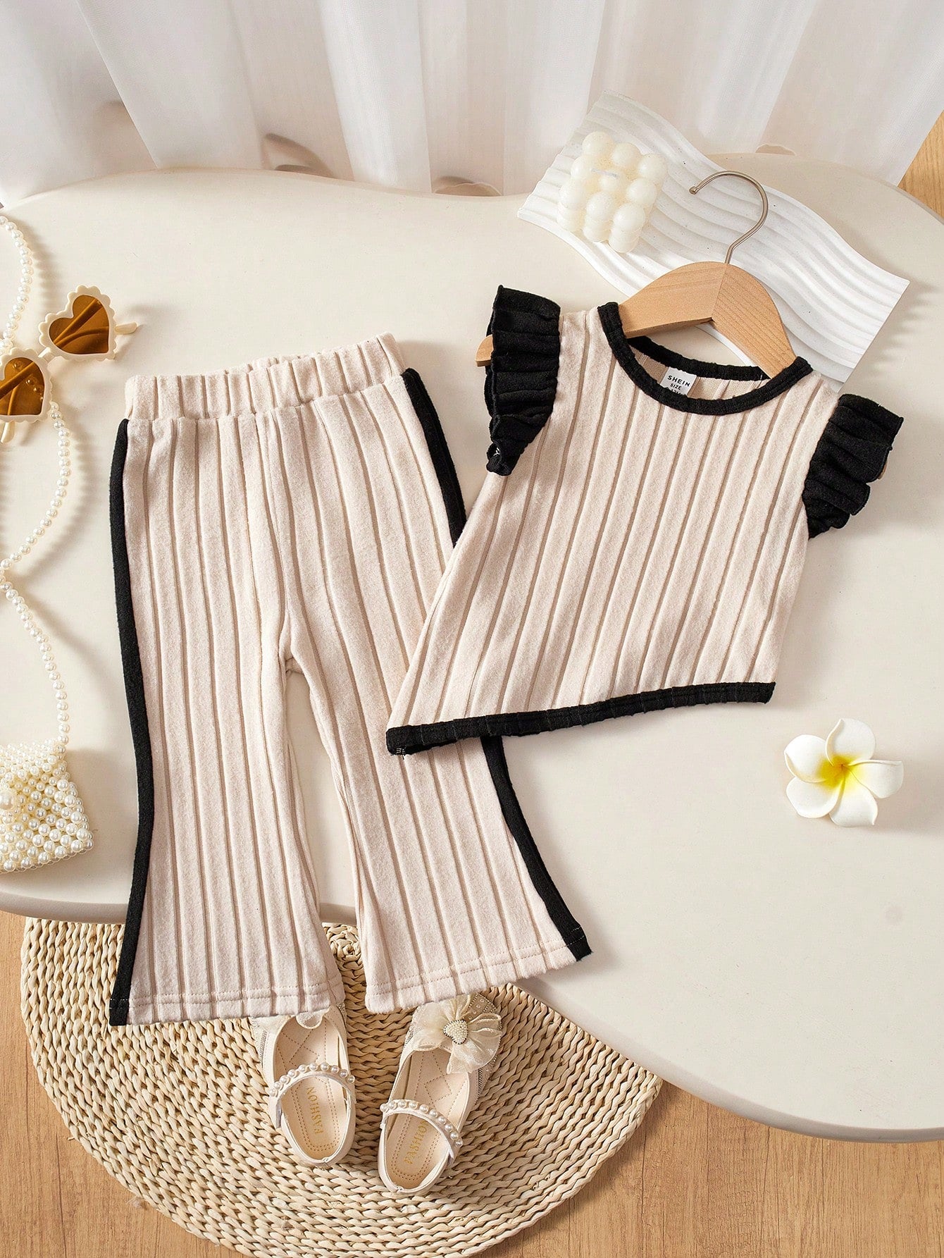 kids 2pcs Baby Girls Spring/Summer Casual Fashion Color Block Ribbed Flare Sleeve Top And Pants Set