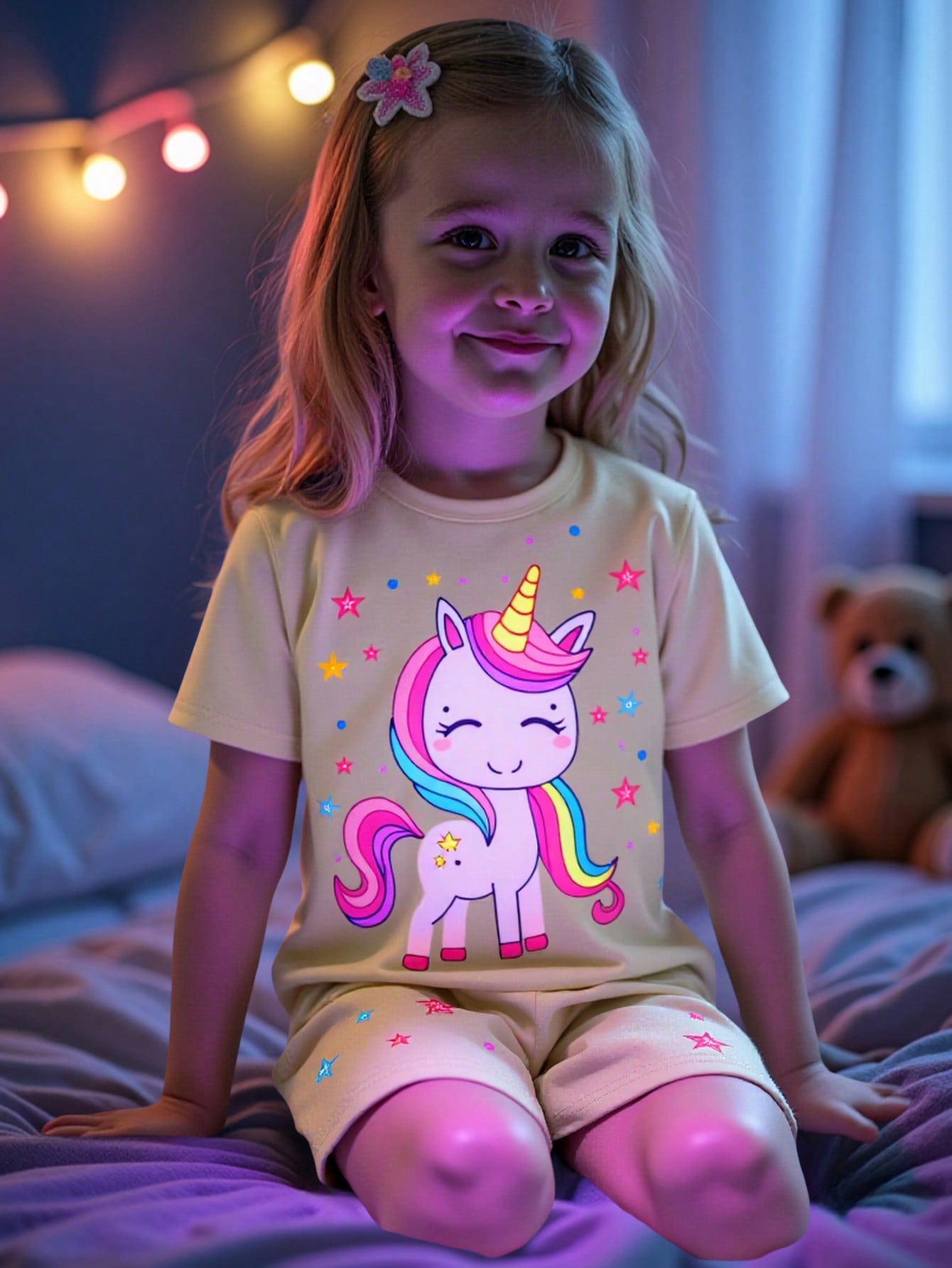 2pcs/Set Young Girl Lovely Unicorn Pattern Navy Blue Short Sleeve Top And Shorts Comfy Sleepwear Set
