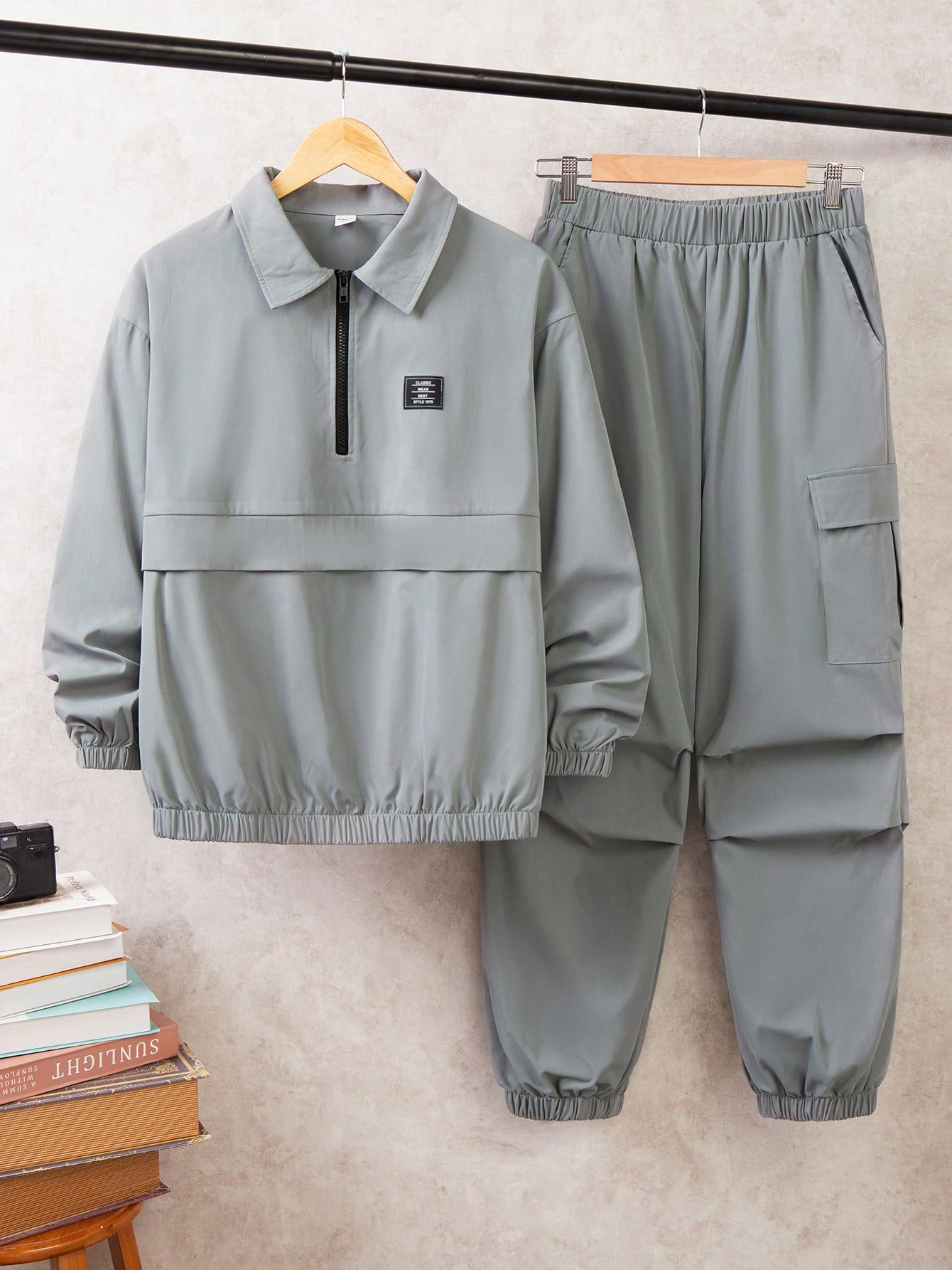 2pcs Teen Boy Loose Fit Solid Color Letter Print Half-Zip Jacket And Pants Set