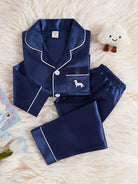 2pcs Young Boys Solid Blue Color Cute Puppy Embroidery Long Sleeve Cardigan And Long Pants Sleepwear