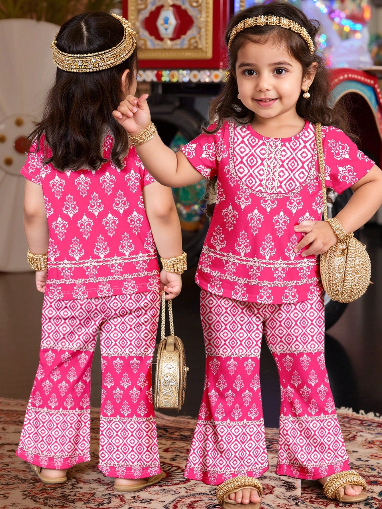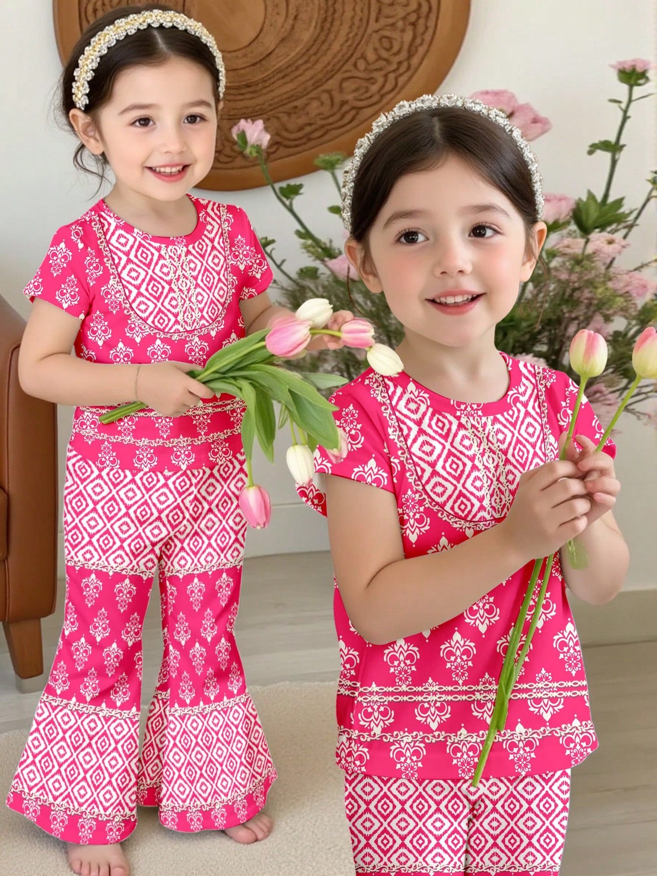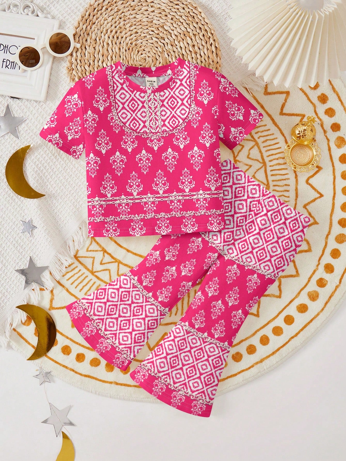 kids Baby Girls Cute Geometric Print Princess Style Pink Baby Girl Casual Minimalist Short Sleeve Tee And Pants Set