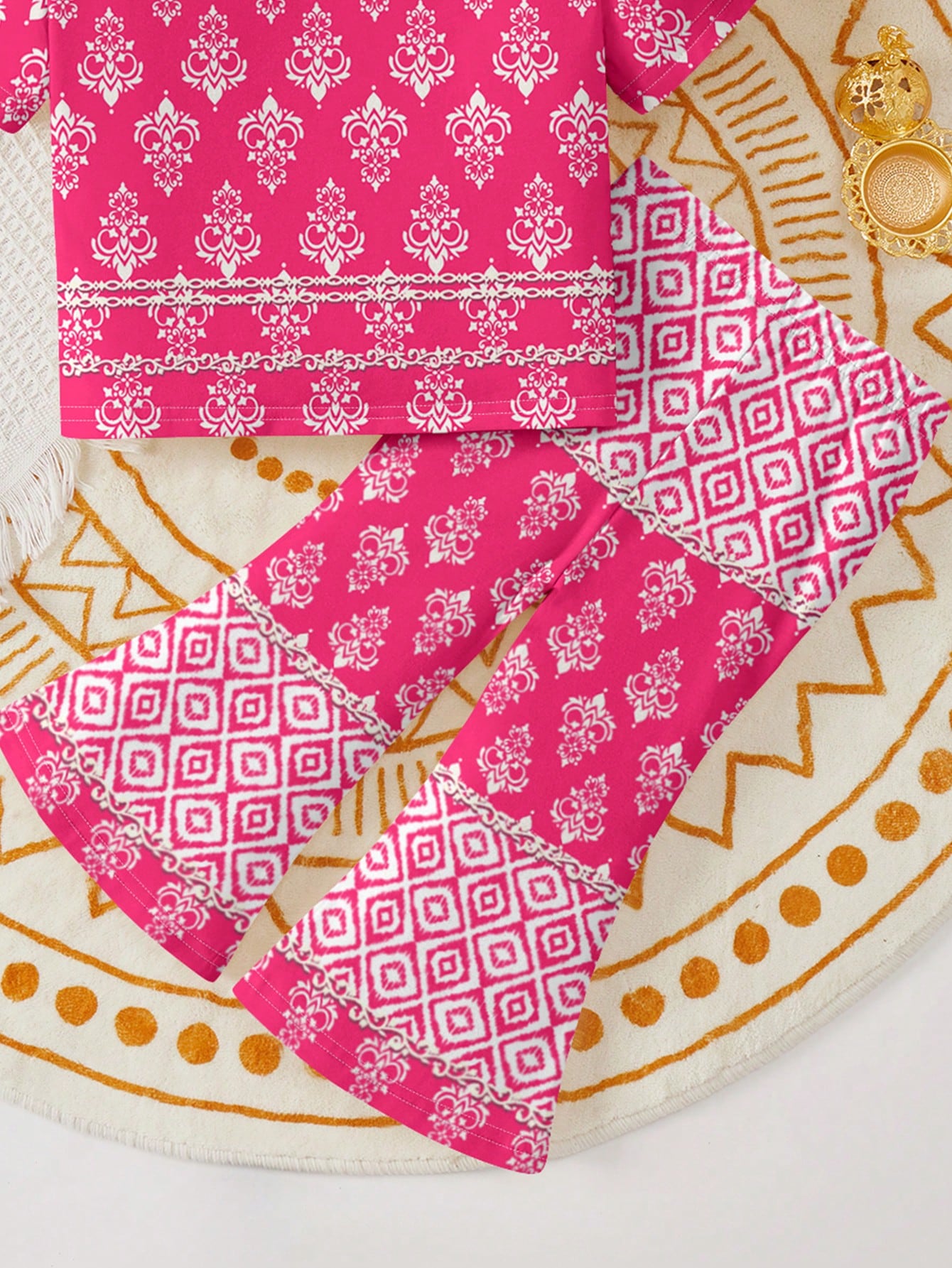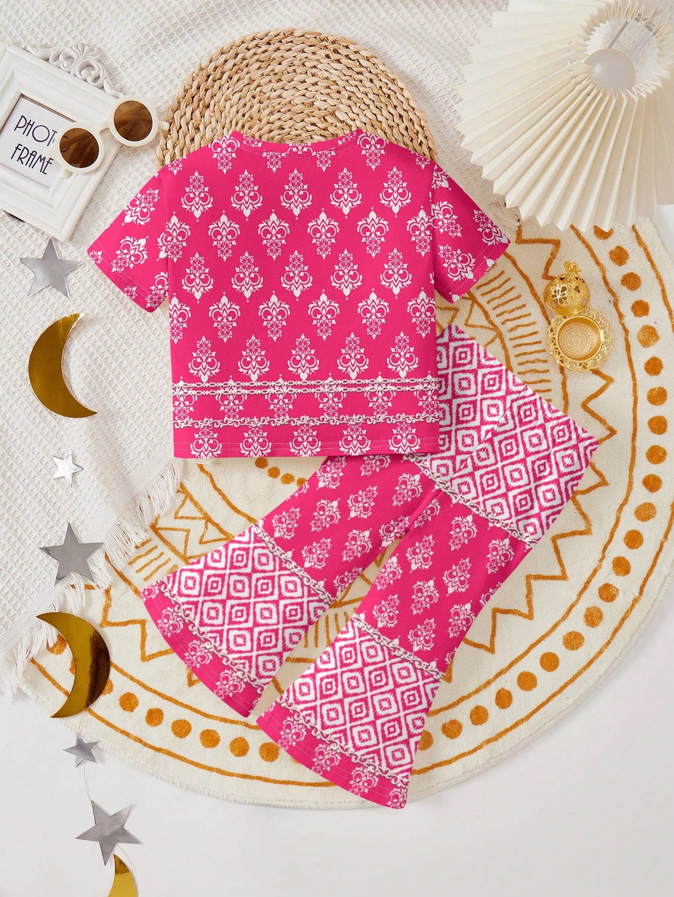 Baby Girls Cute Geometric Print Princess Style Pink Baby Girl Casual Minimalist Short Sleeve Tee And Pants Set