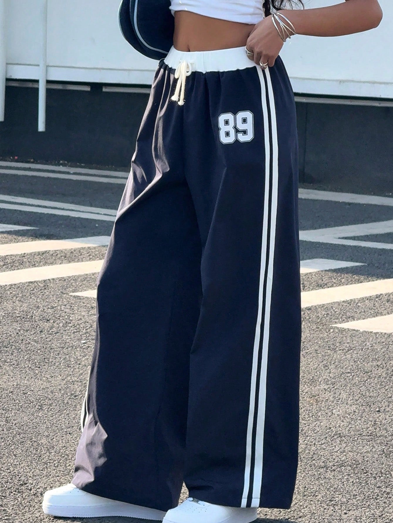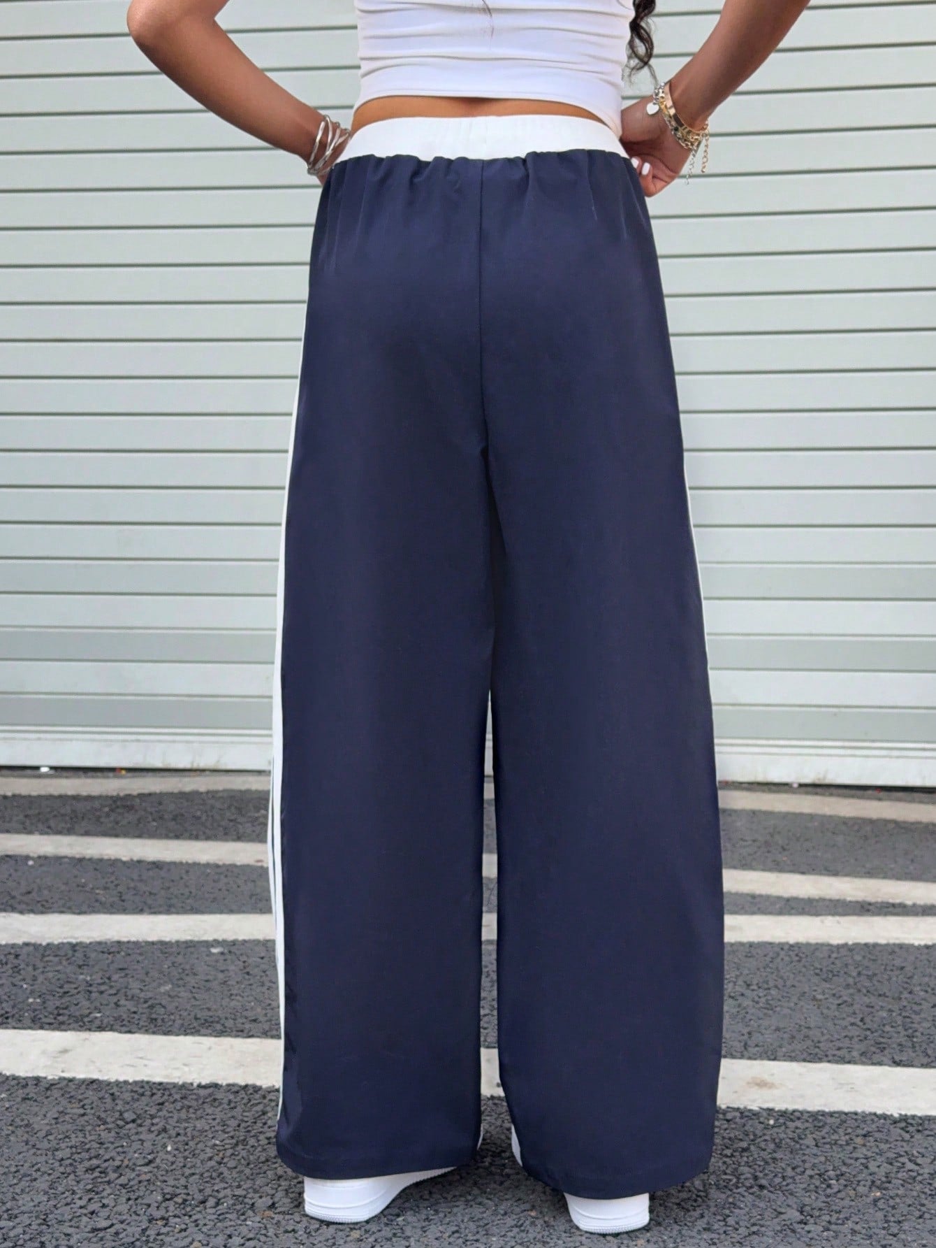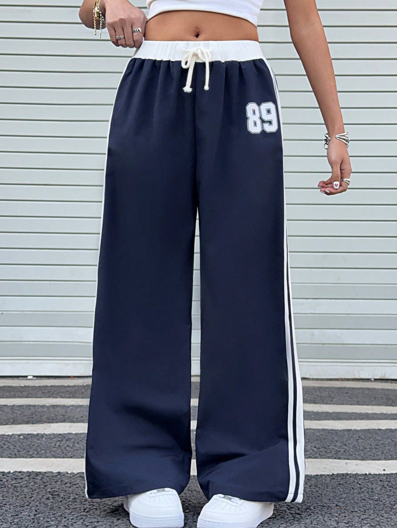 kids SHEIN Teen Girl Blue & White Print Waist Contrast Color Loose Casual Vacation Wide Leg Pants