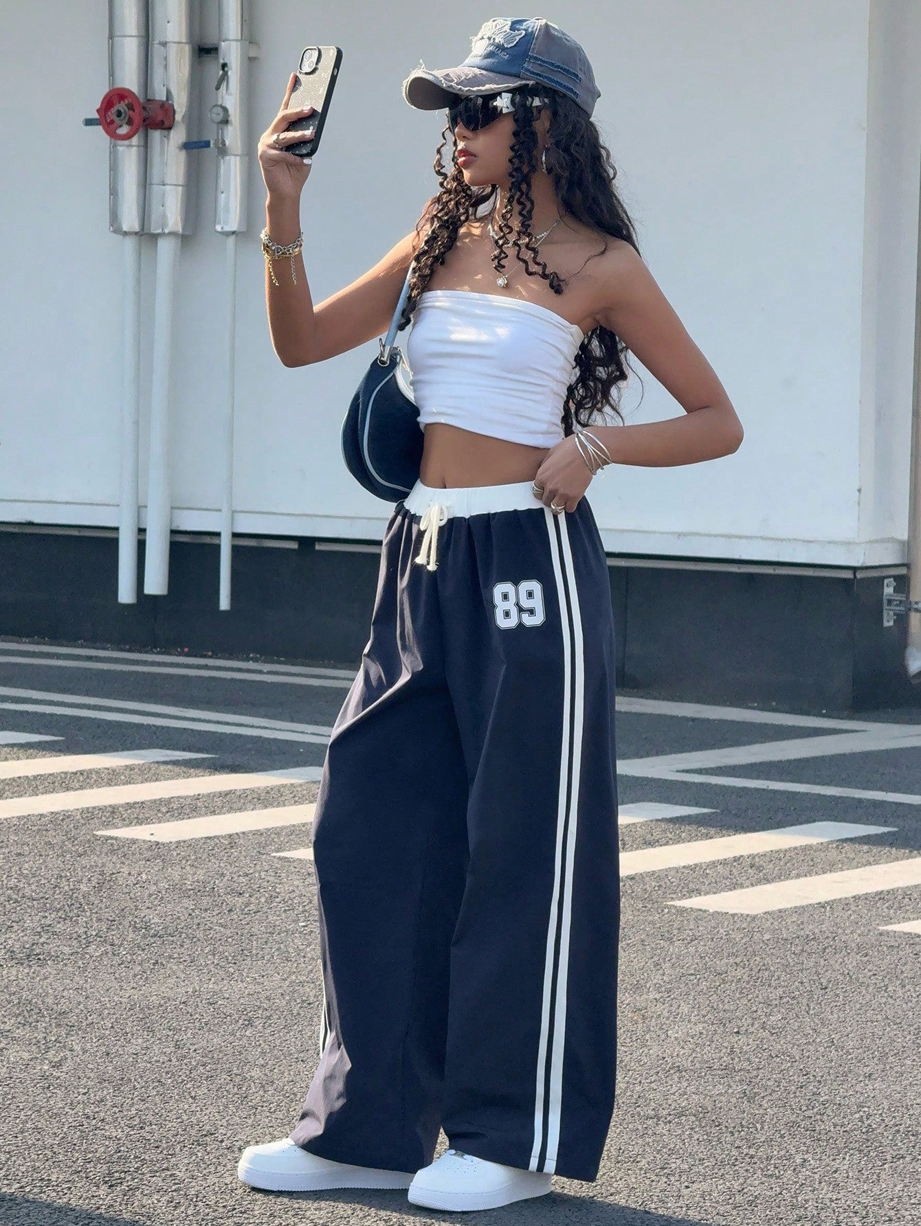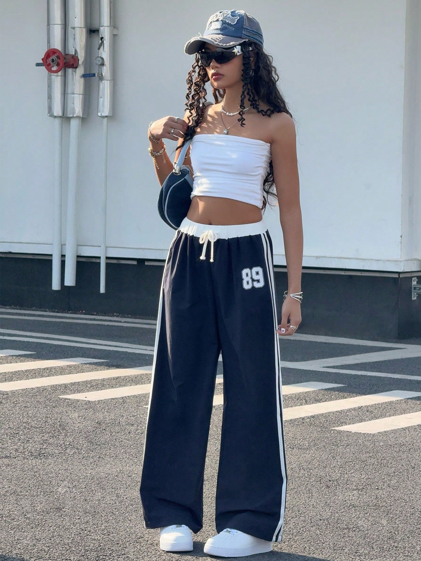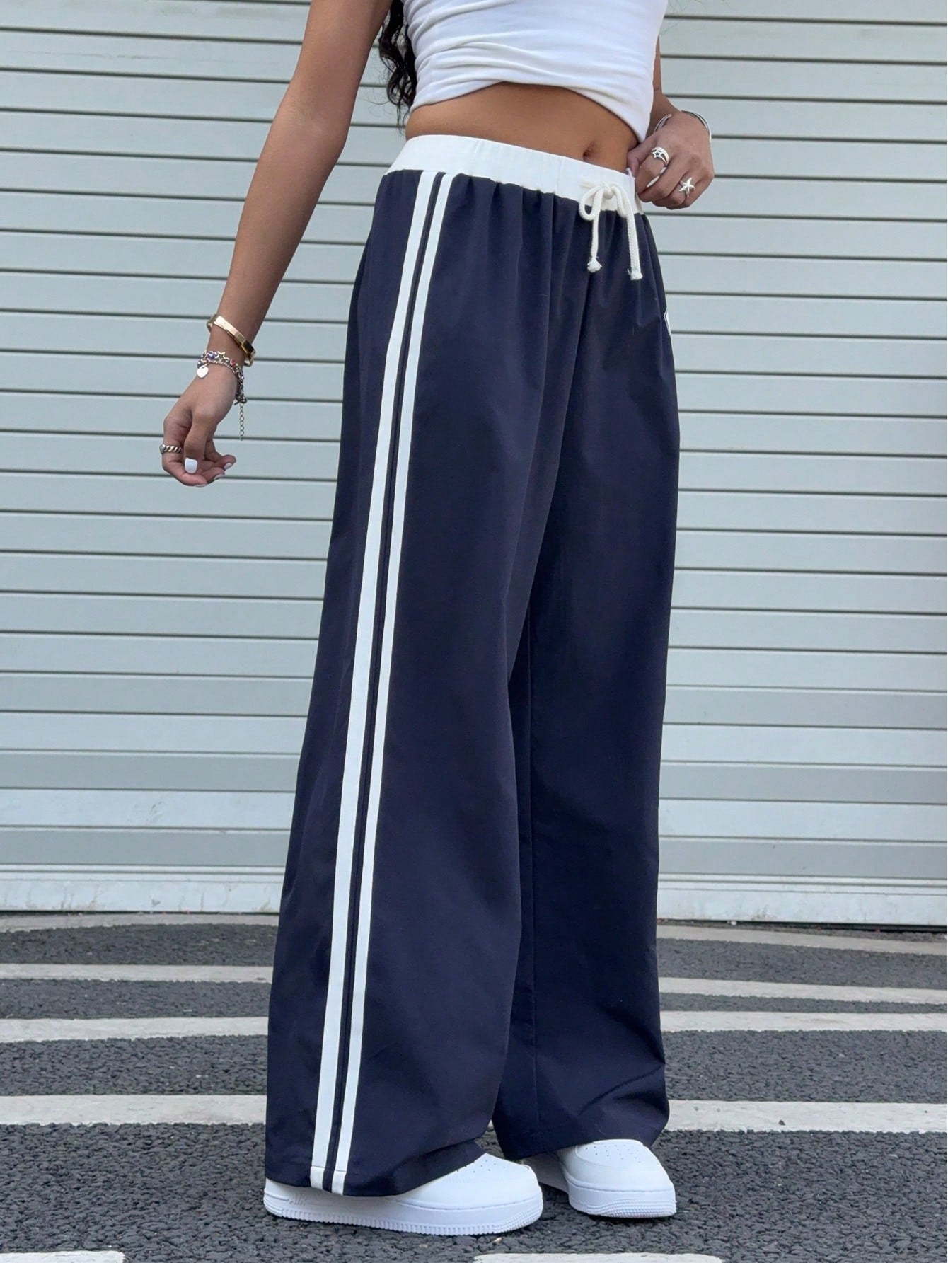 kids SHEIN Teen Girl Blue & White Print Waist Contrast Color Loose Casual Vacation Wide Leg Pants