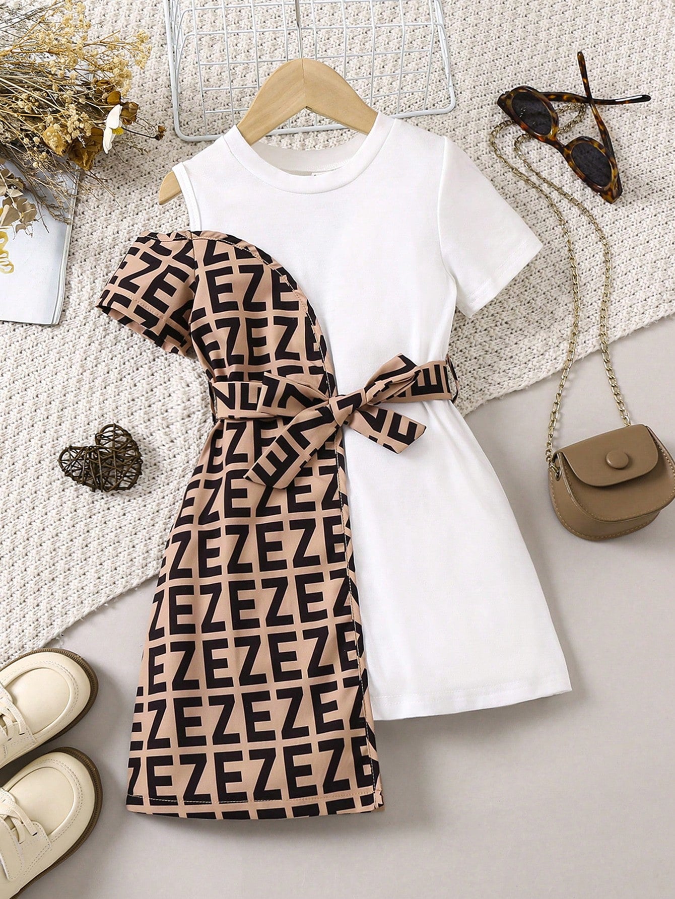 kids SHEIN Young Girl's Color Block Letter Paneled Belted Dress