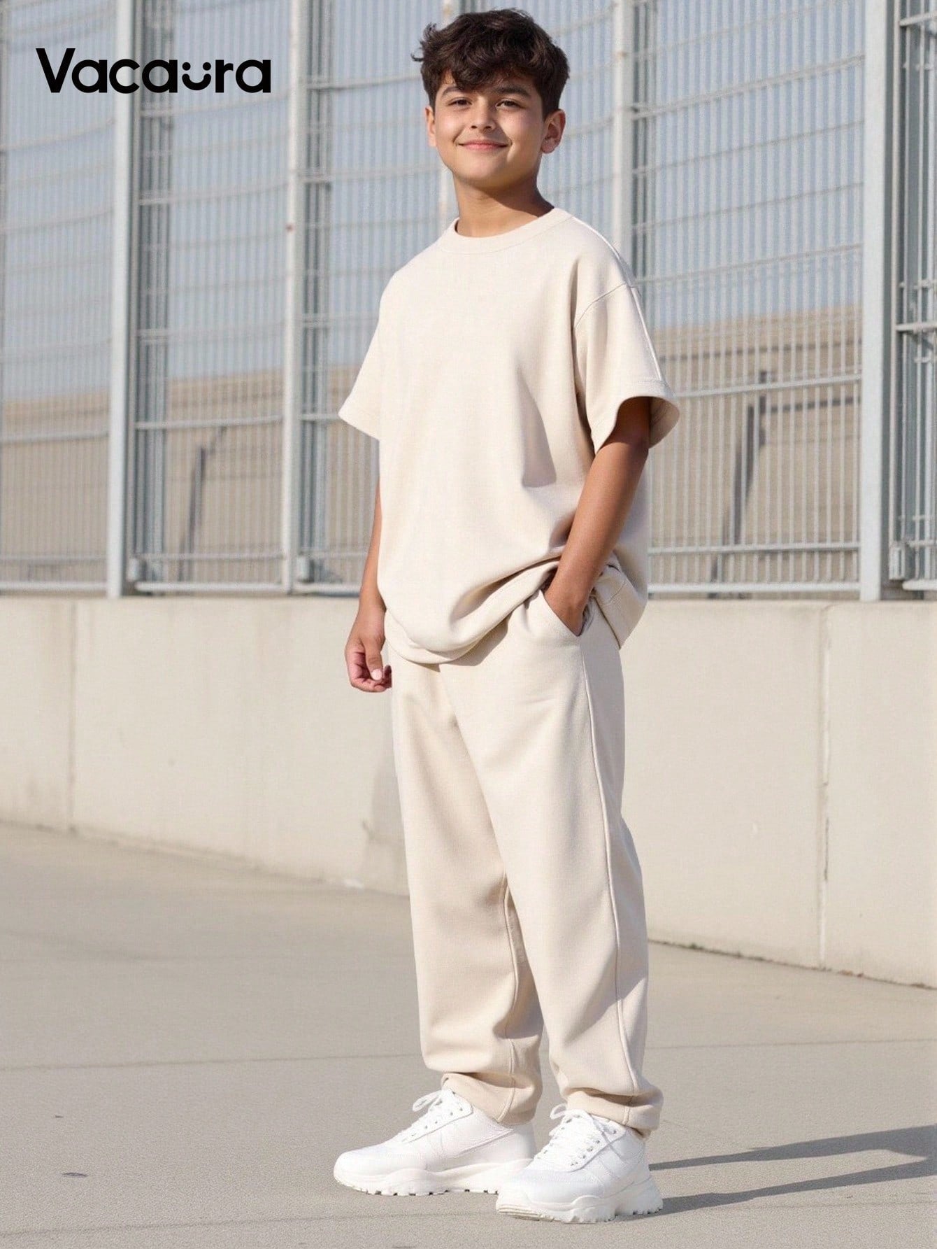Vacaura 2pcs/Set Boys Casual Set - Oversize Round Neck Pullover Top With Dropped Shoulder & Wide Sleeve Cuffs