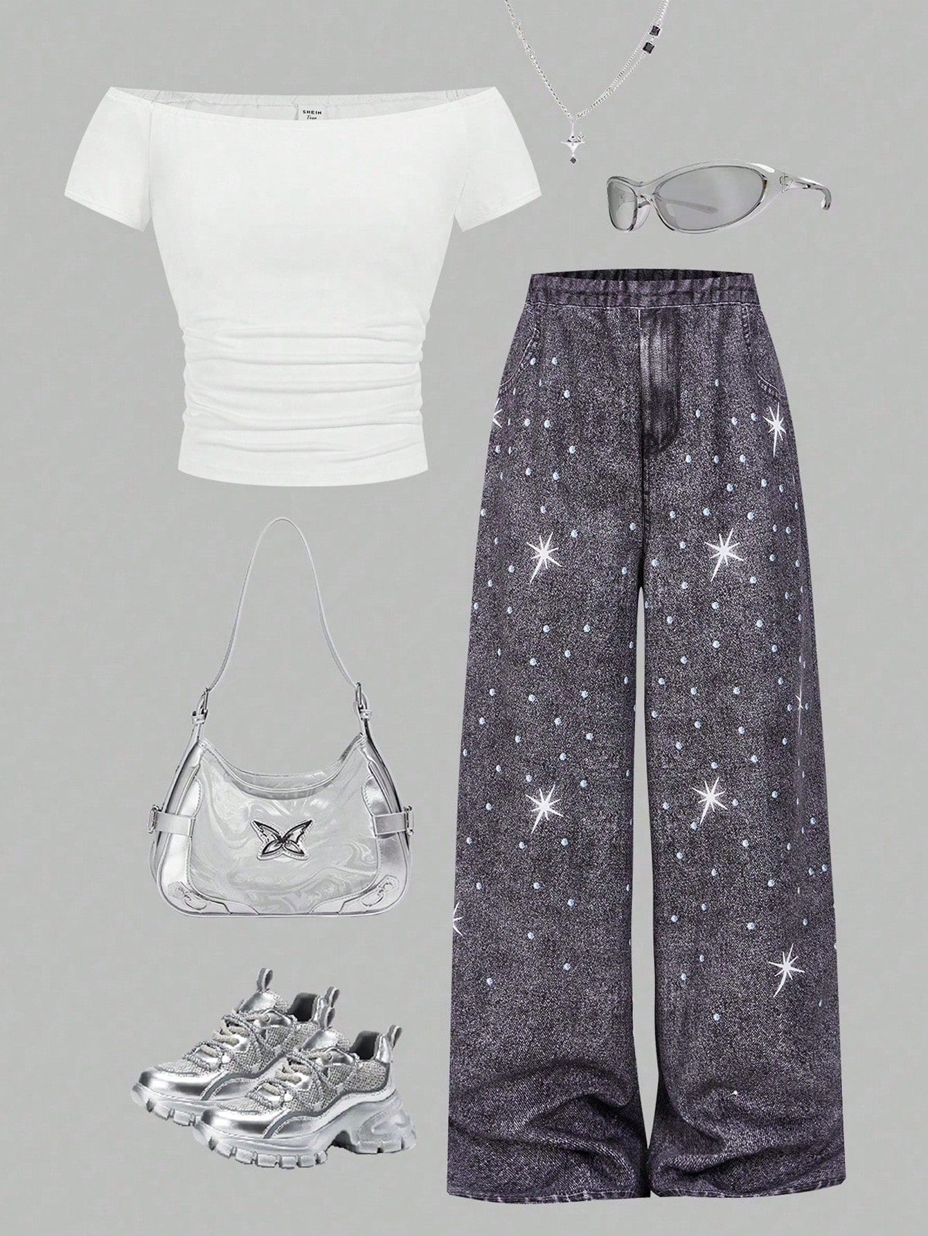 Y2K Style Teen Girl 1 Set: Solid Color Off Shoulder Knit Top + Denim Effect Rhinestone Loose Wide-Leg