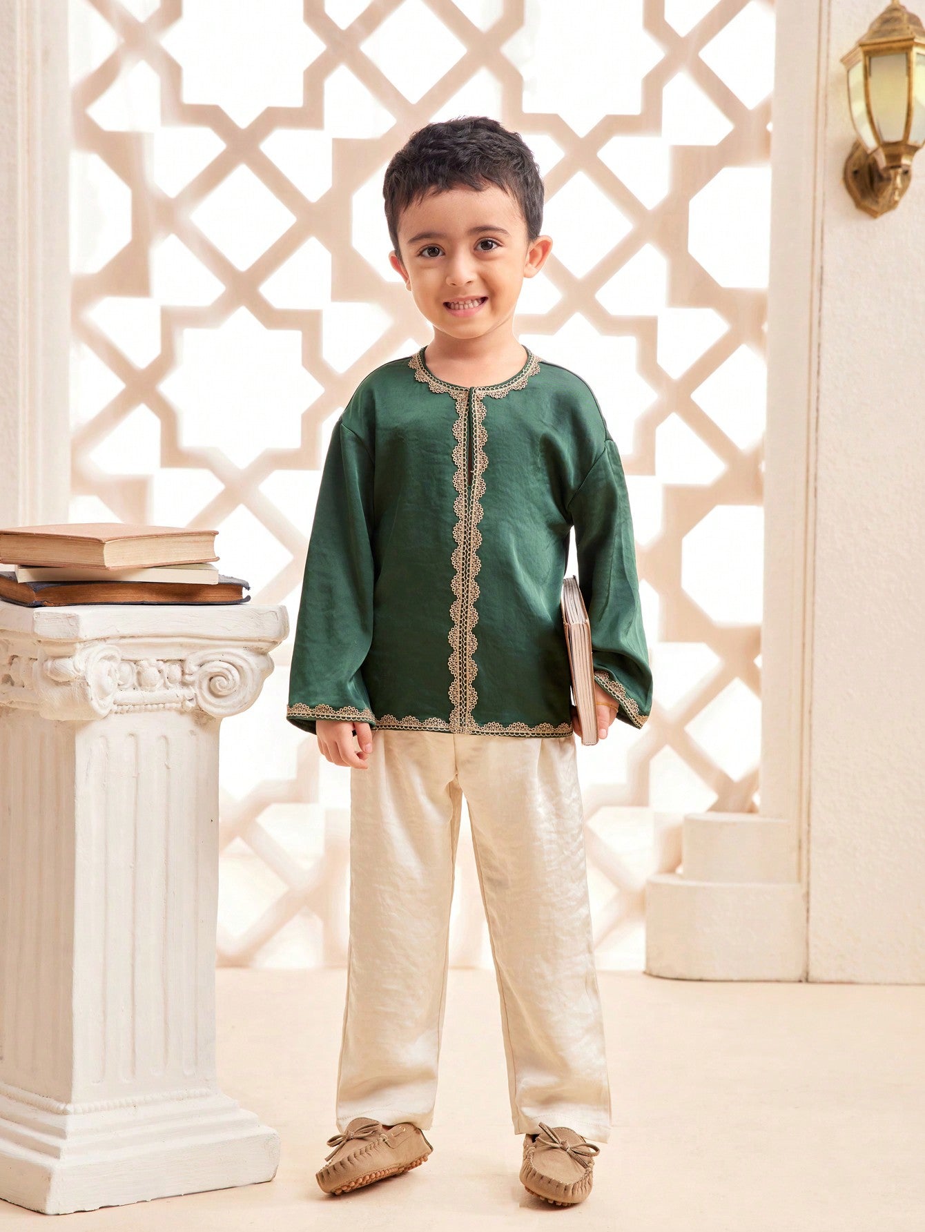 Young Boy Plain Color Block Long Sleeve Casual Top And Pants Set