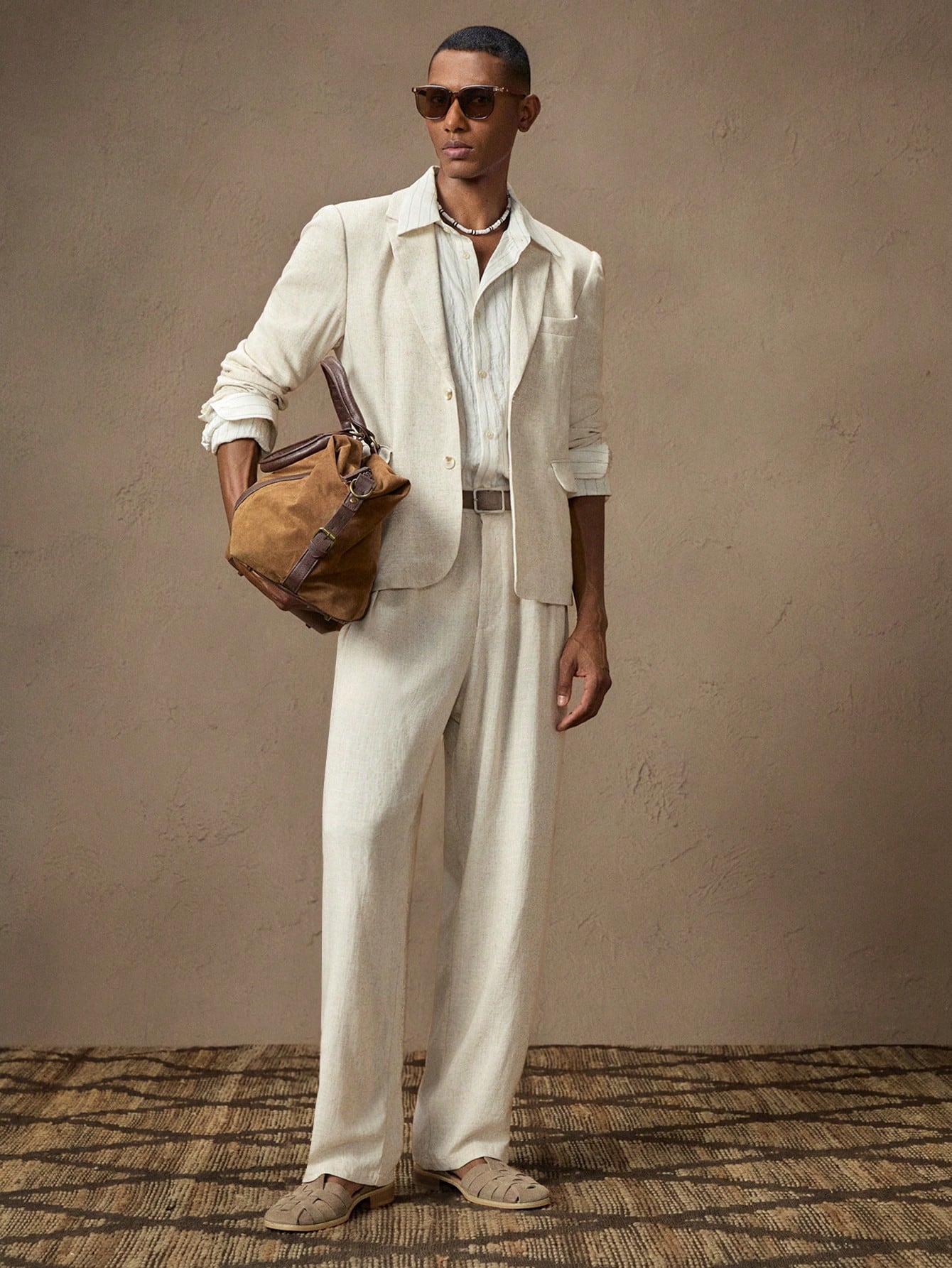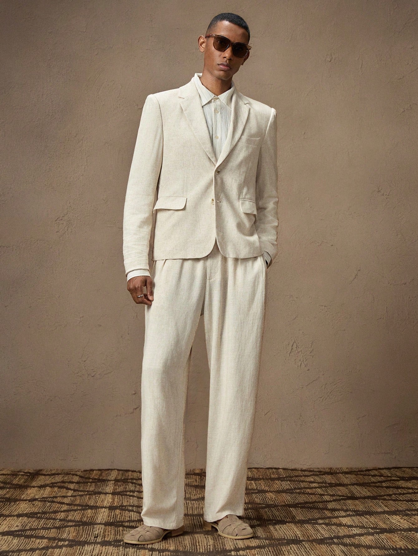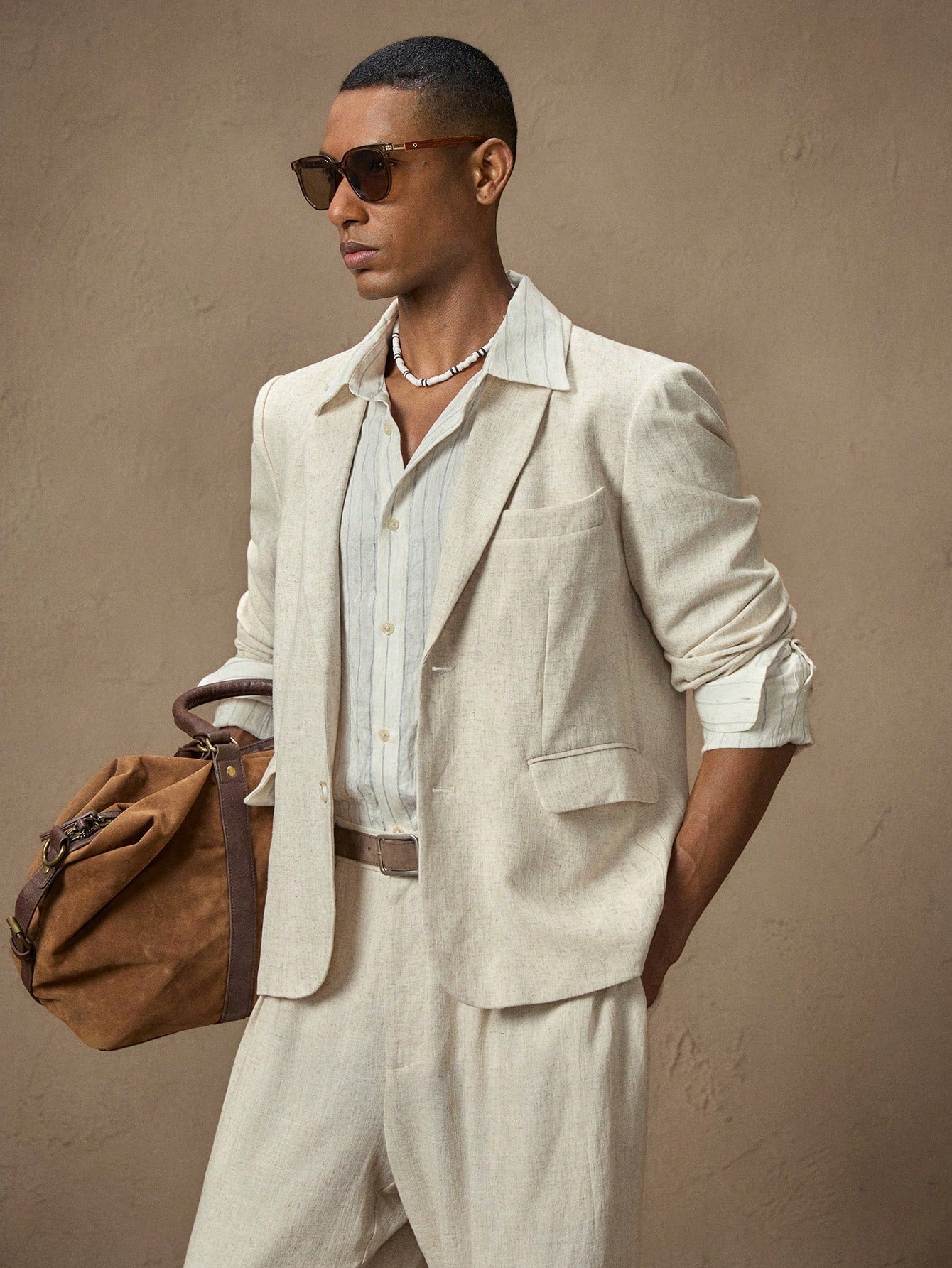 AKNOTIC 2pcs Men Linen Woven Fashion Casual Fitted Solid Color Long Sleeve Jacket And Elastic Waist Straight
