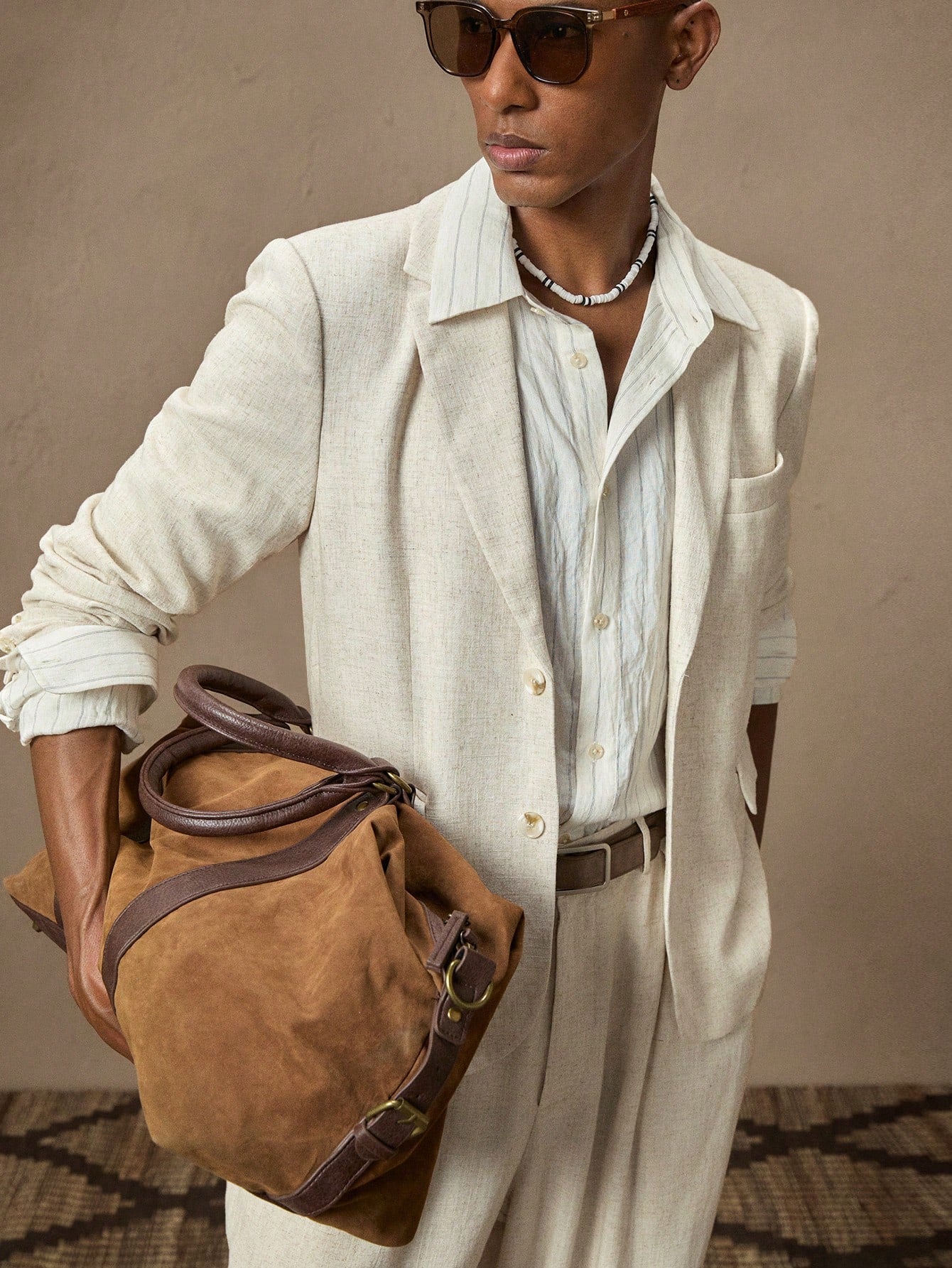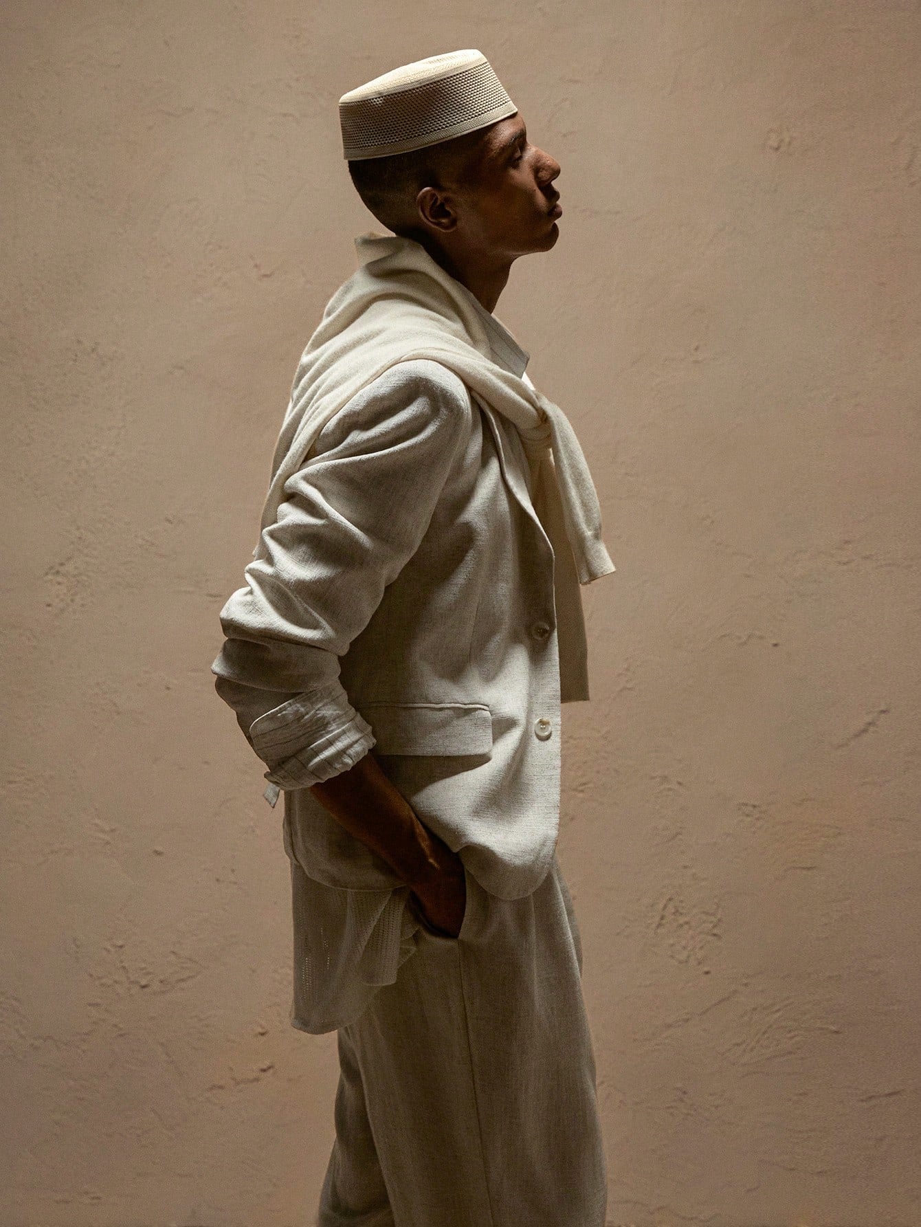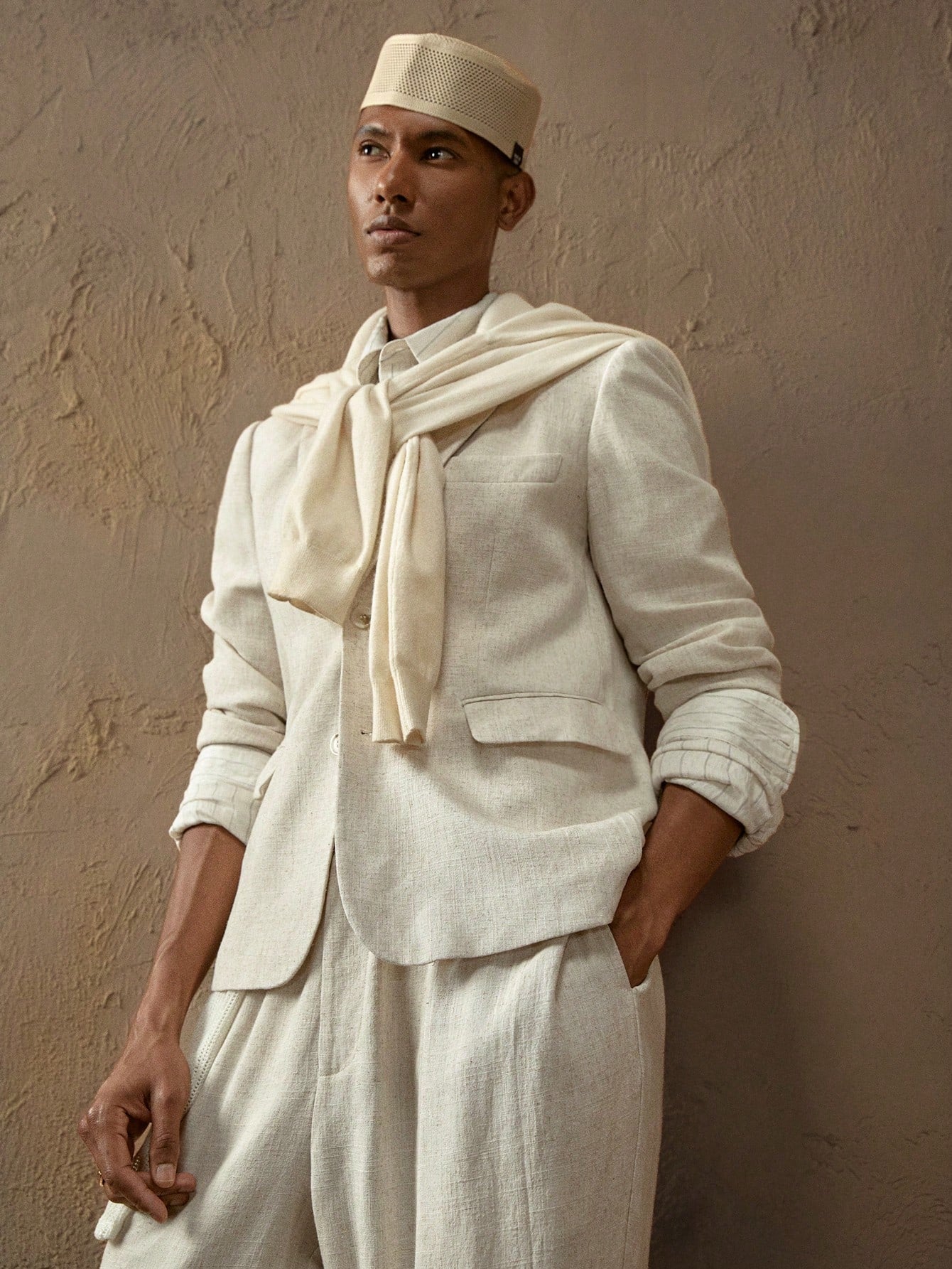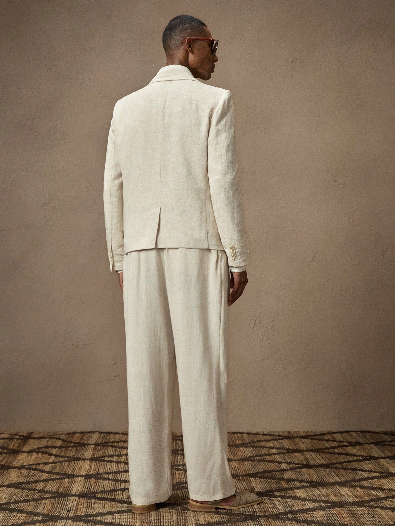 AKNOTIC 2pcs Men Linen Woven Fashion Casual Fitted Solid Color Long Sleeve Jacket And Elastic Waist Straight