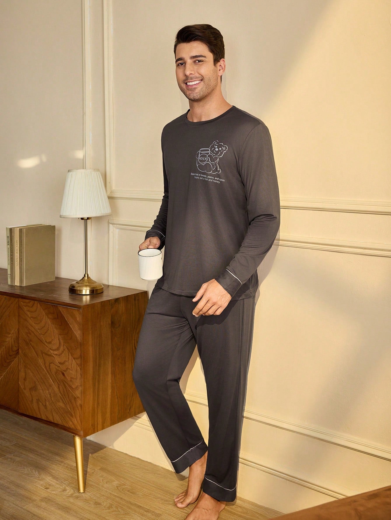 Men's Slogan Print Long Sleeve Top And Pants Pajama Set