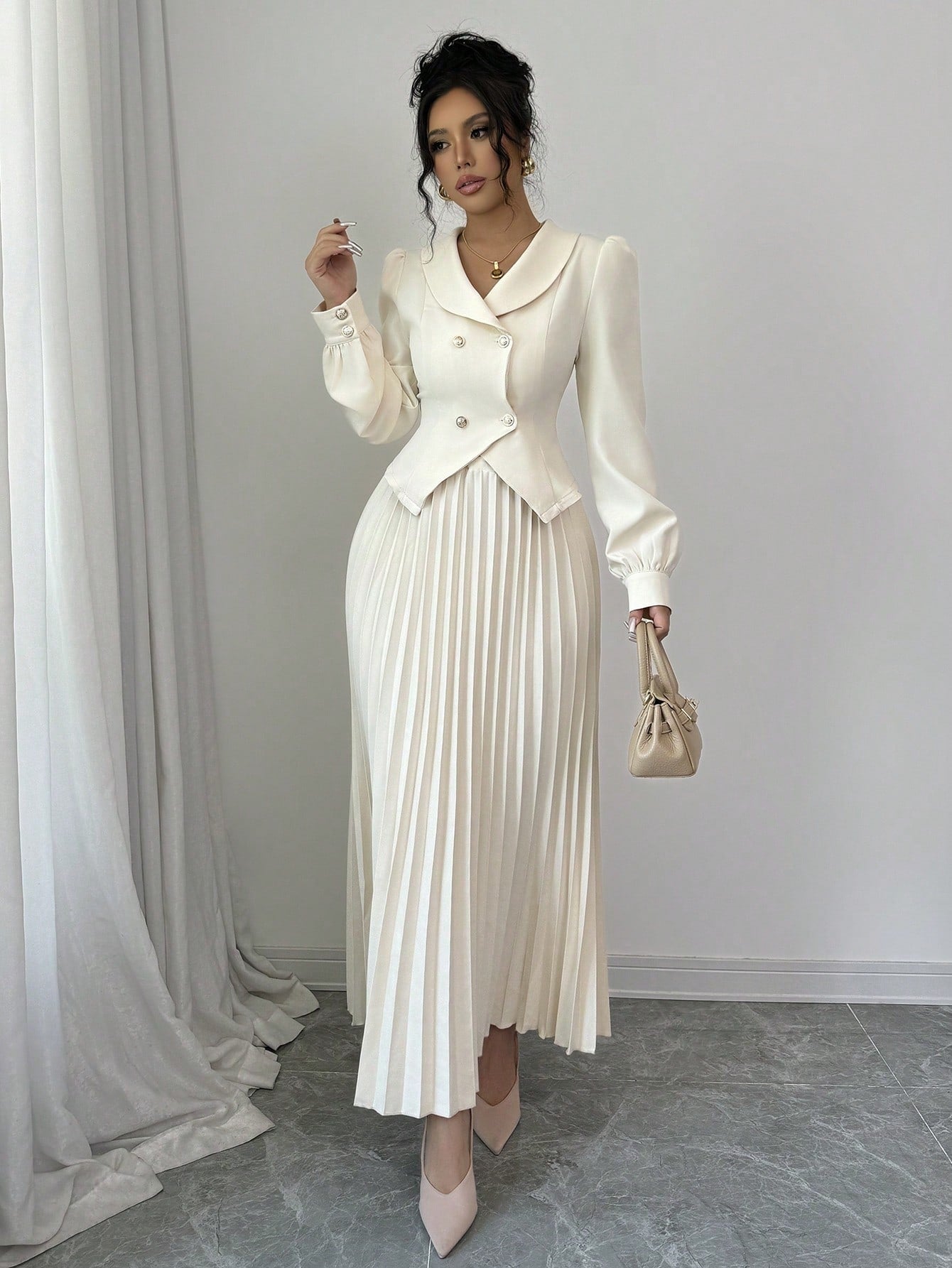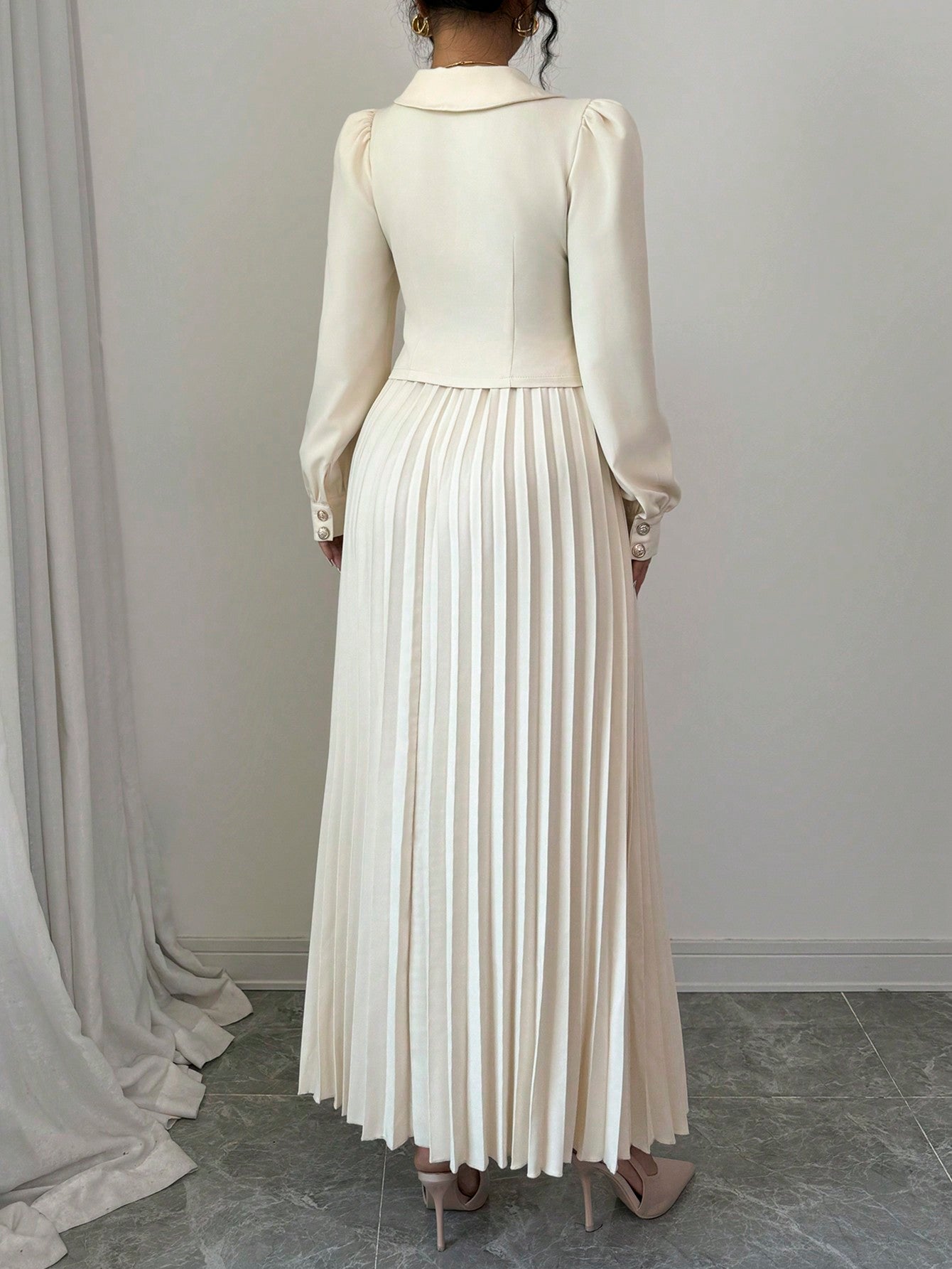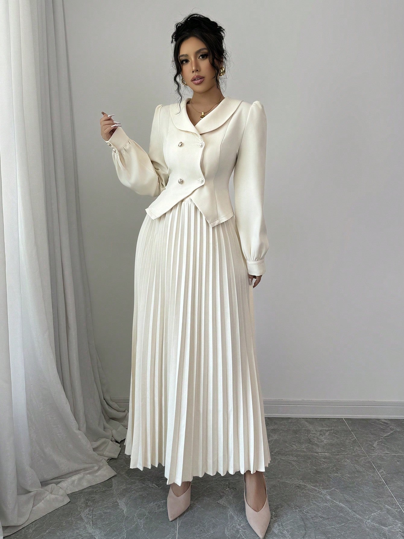 Elenzga Apricot High-End Women 2Pcs Set: Jacket + Pleated Maxi Skirt Fall Cloth For Women