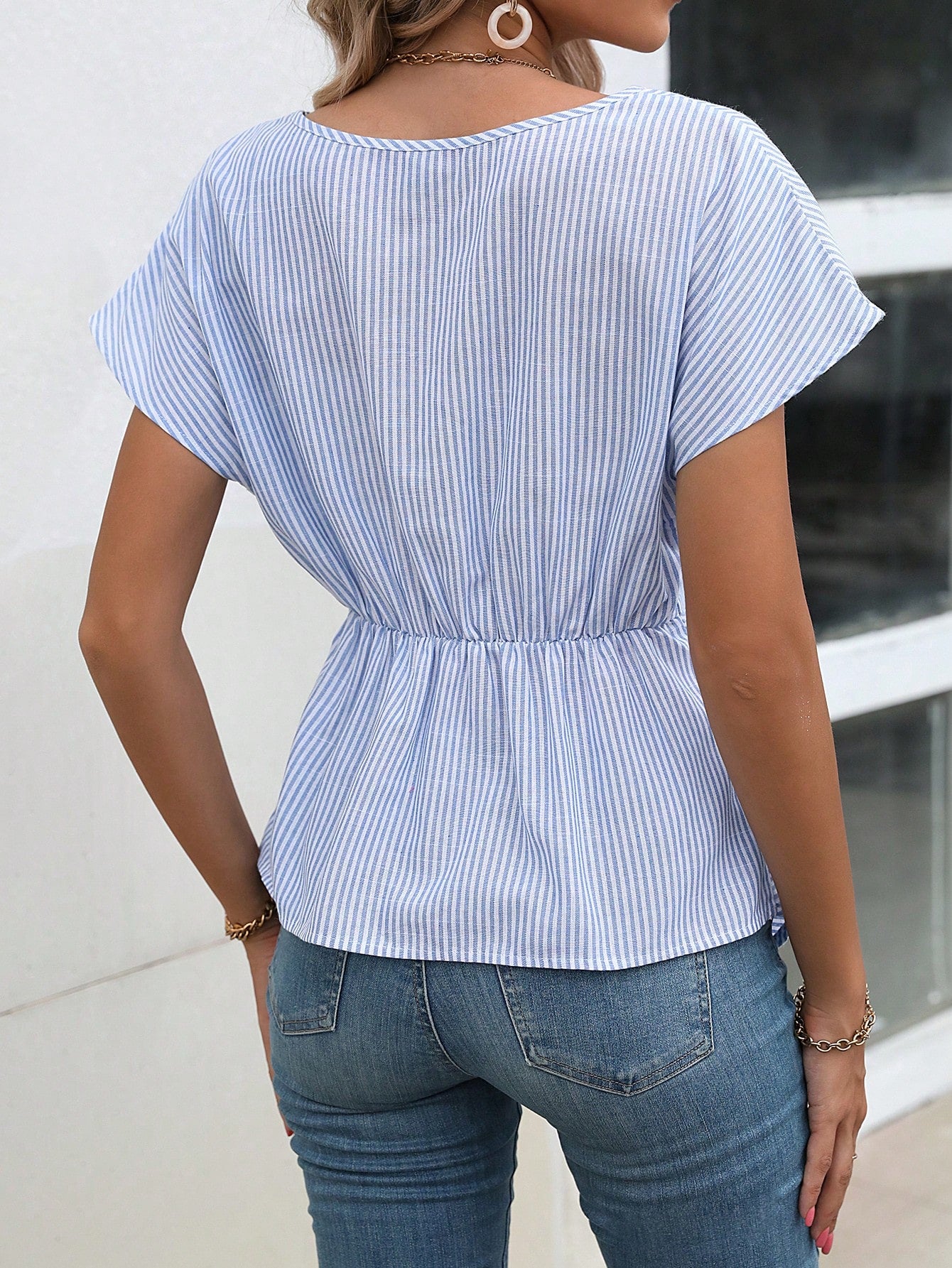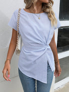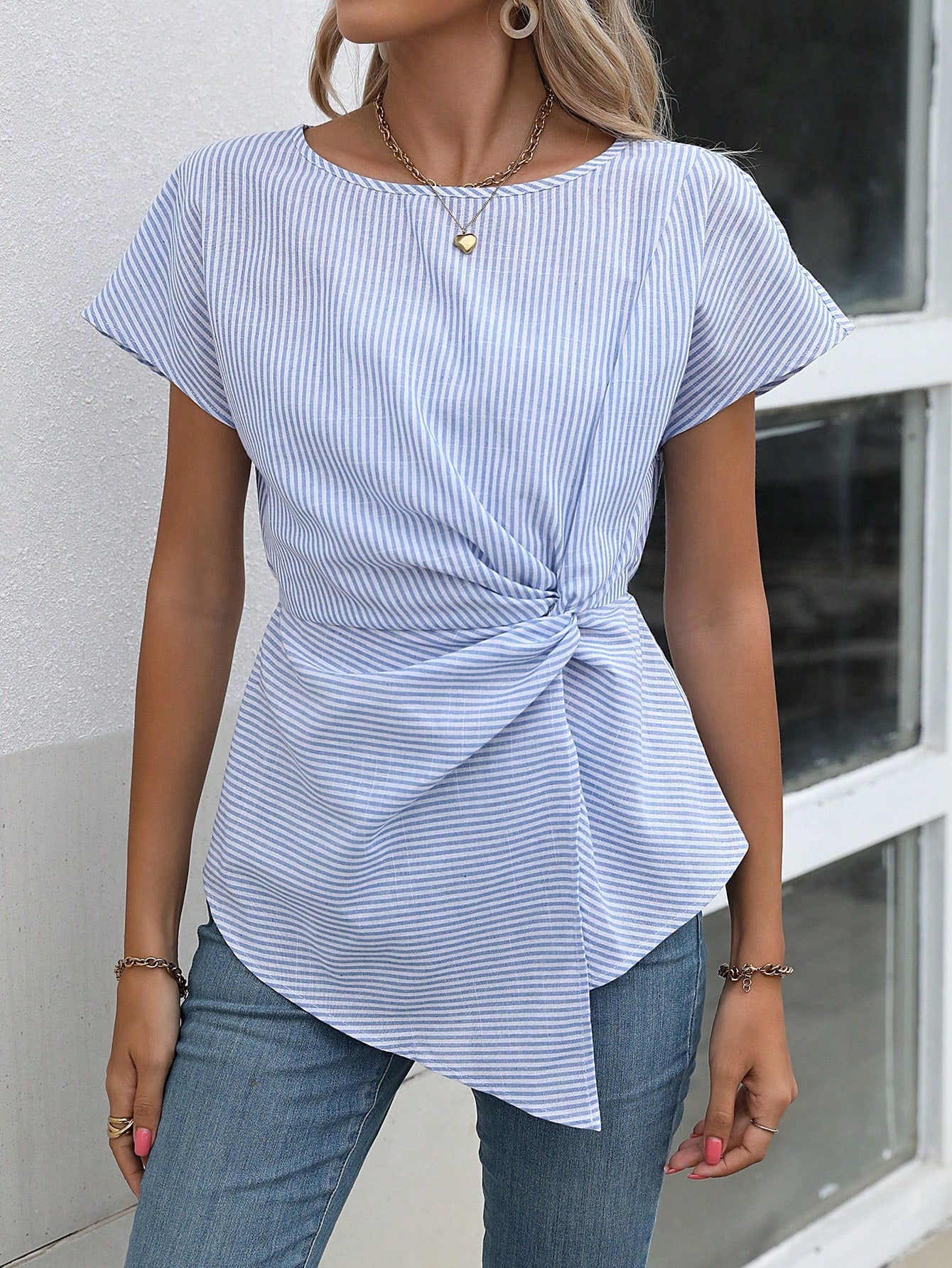 EMERY ROSE Striped Print Twist Front Asymmetrical Hem Blouse Peplum Top