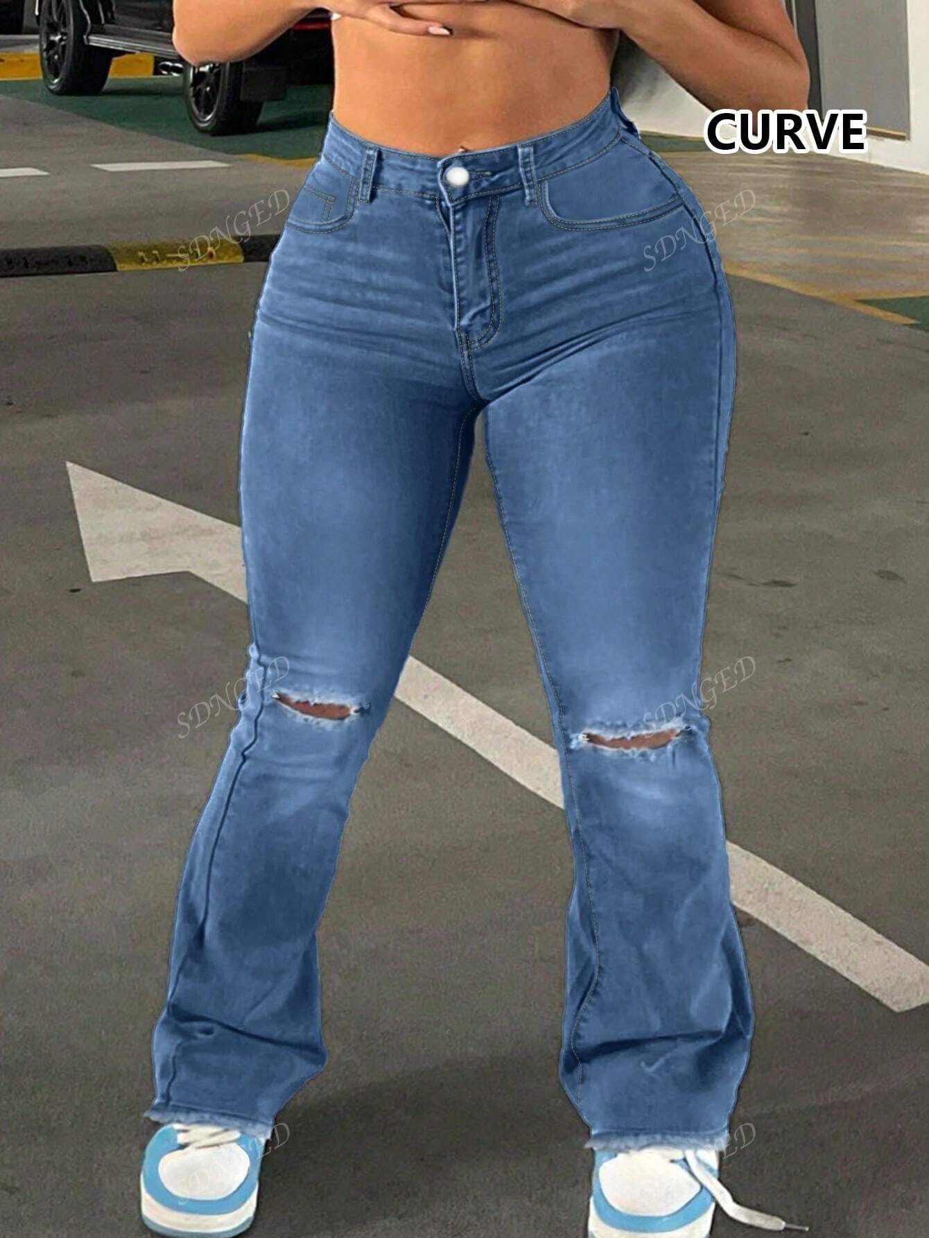 European And American New Style Simple Casual Basic Versatile Ripped Women's Plus Size Denim Stretch