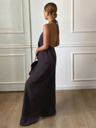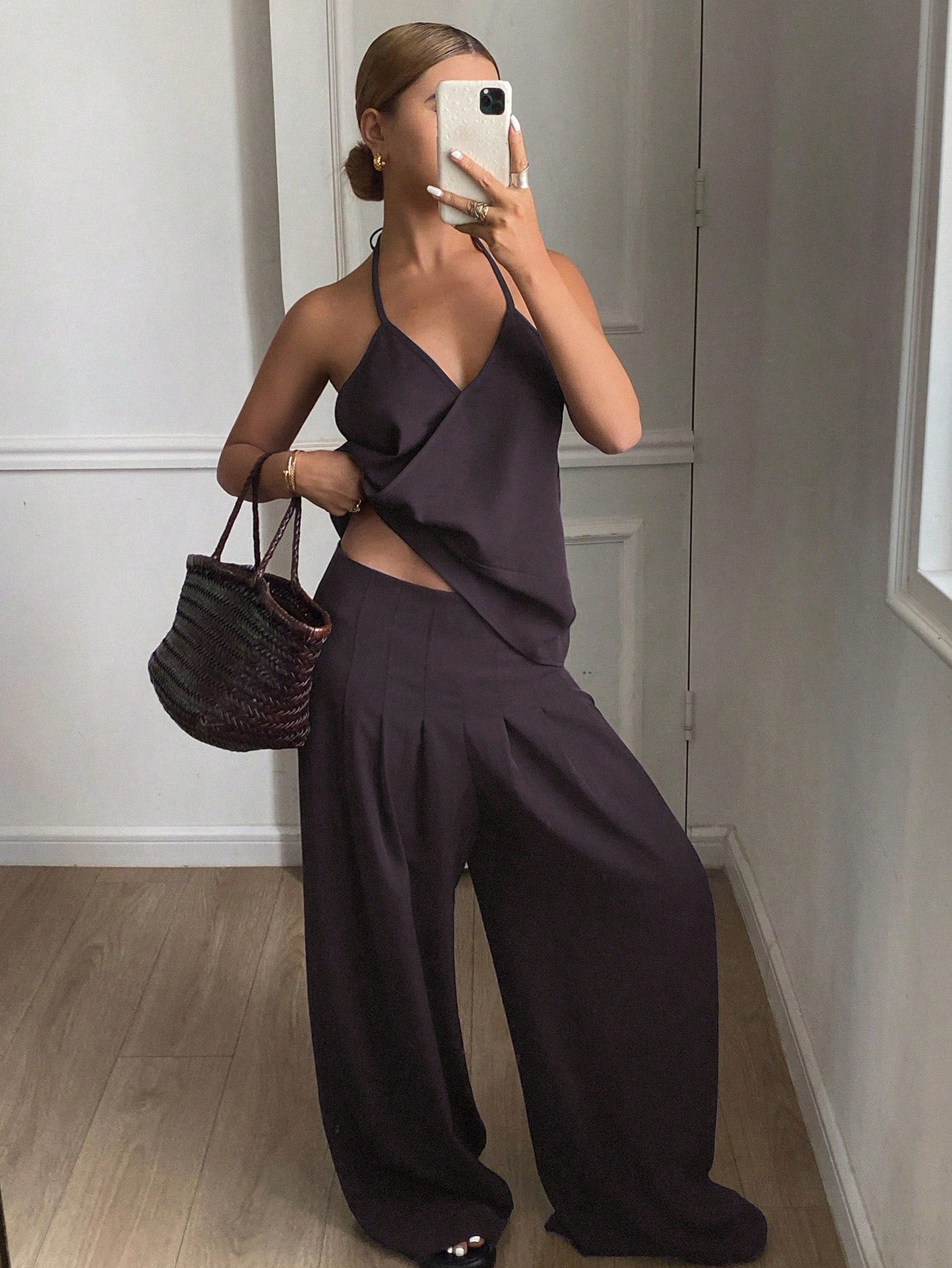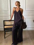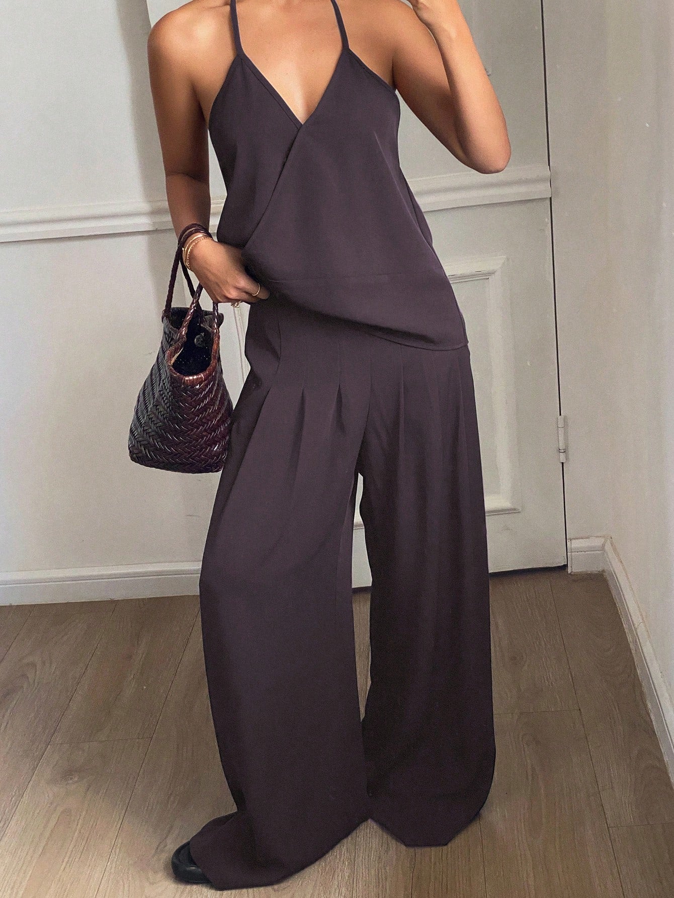 Livesso Women's Casual Summer 2 Pieces Set, Solid Color Spaghetti Strap Top And Wide Leg Pants