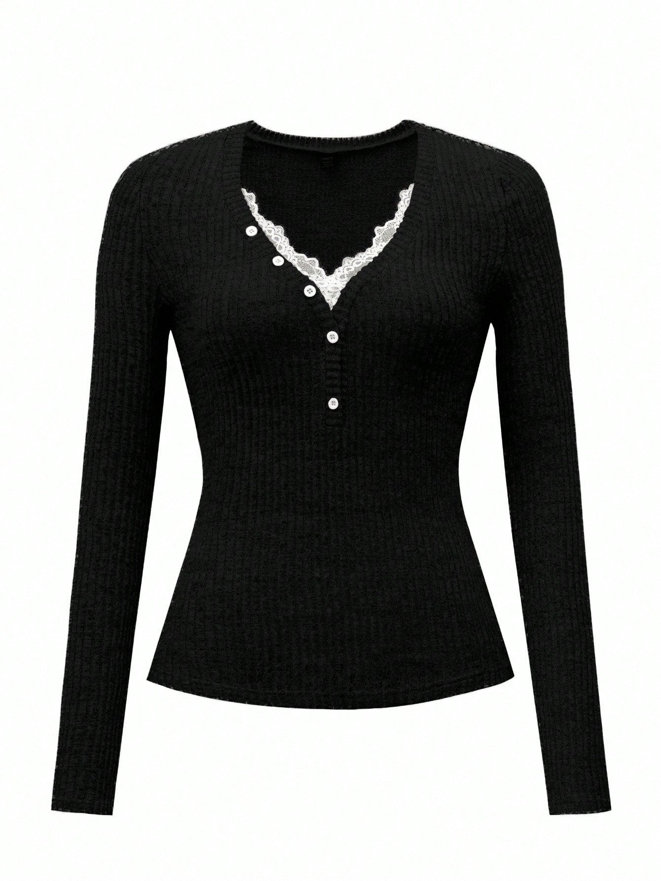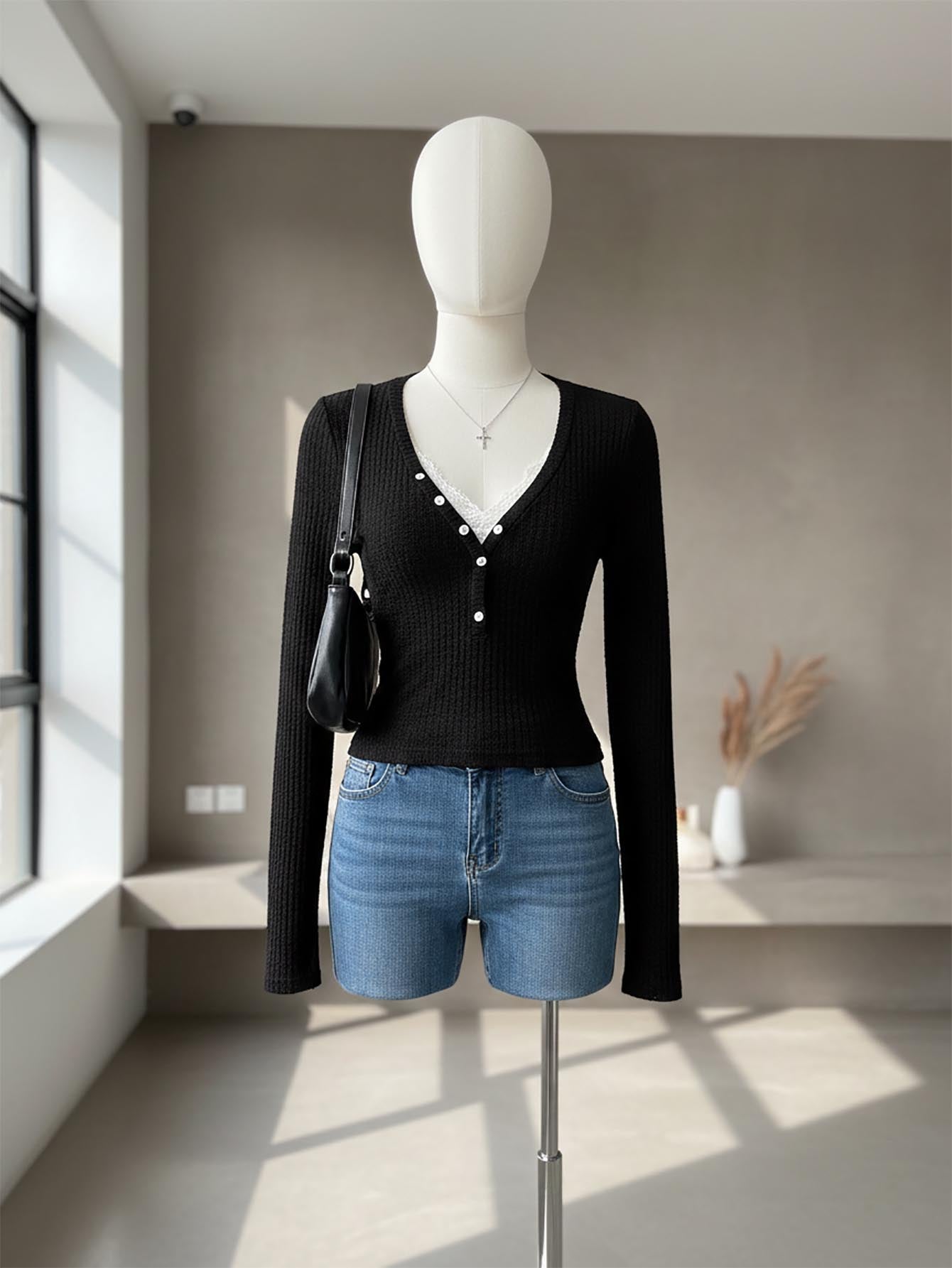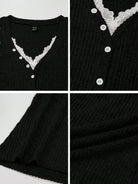 Zielony Women's Casual Knitted V-Neck Lace Patchwork Button Decorated Long-Sleeved Autumn And Winter