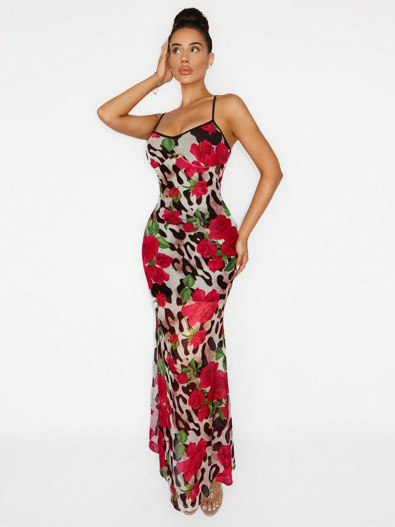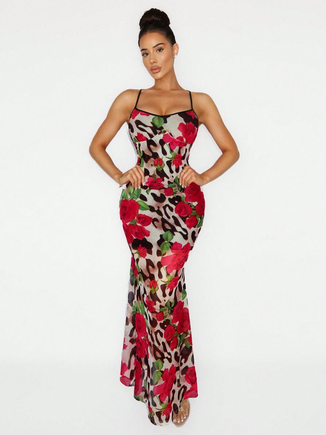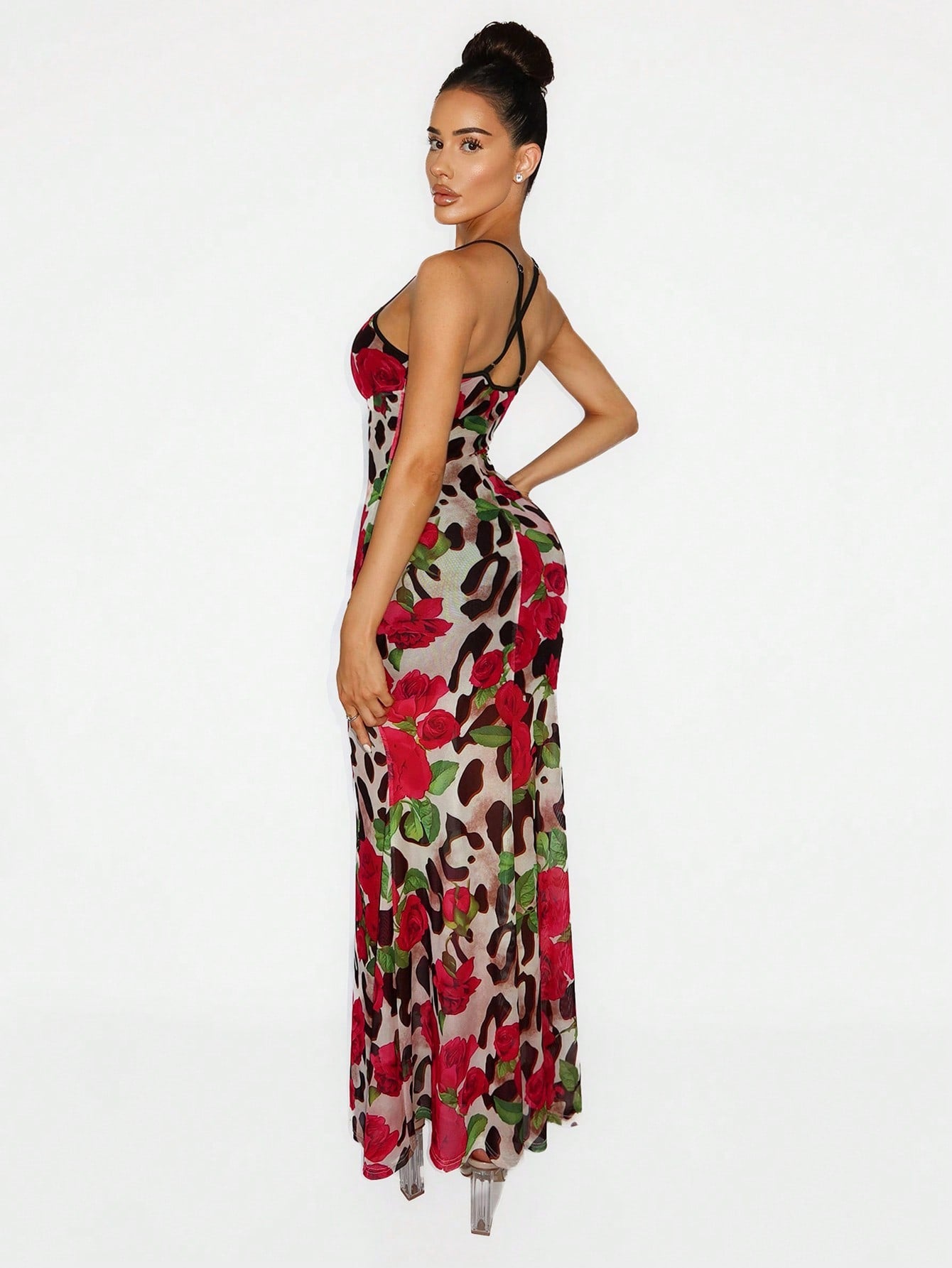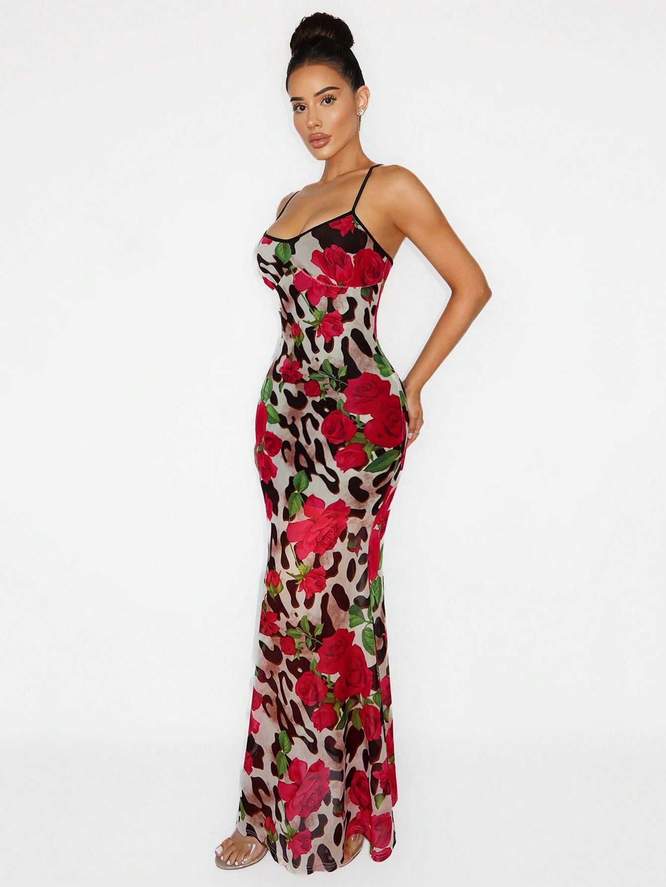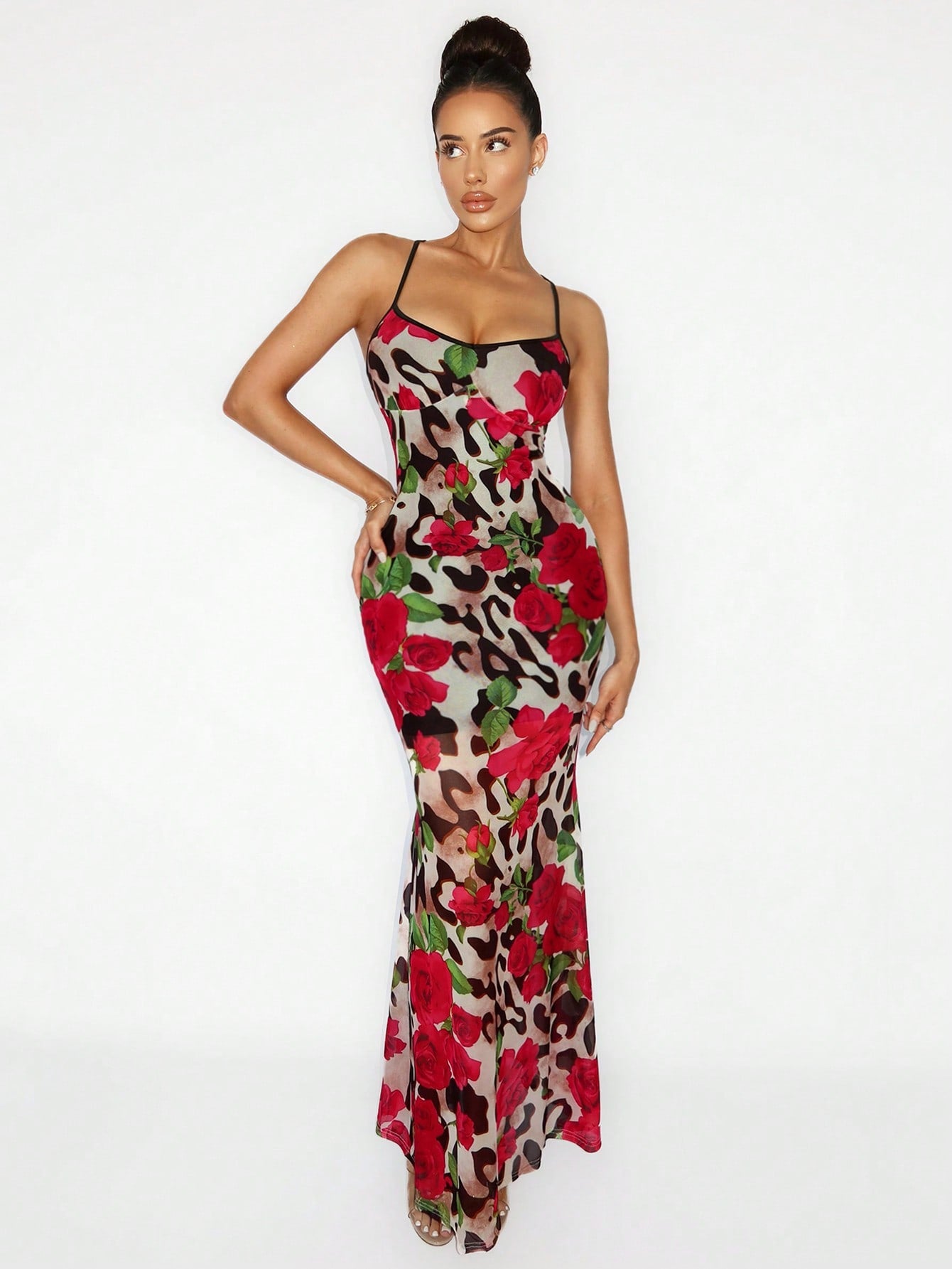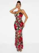 Zolique 2025 New Women's Sexy V-Neck Sleeveless Red Strap Rose Leopard Print Mesh See-Through Maxi Dress,