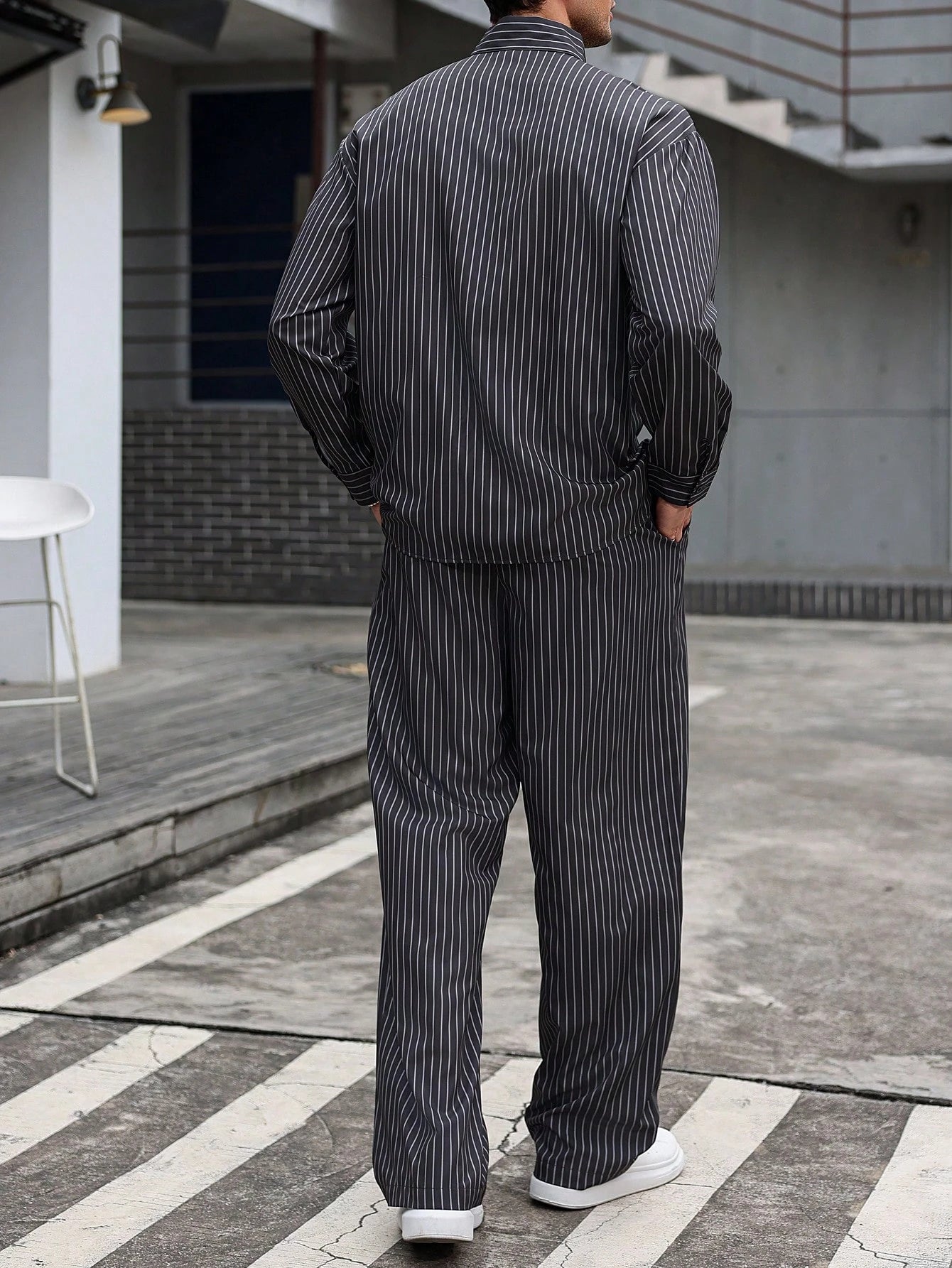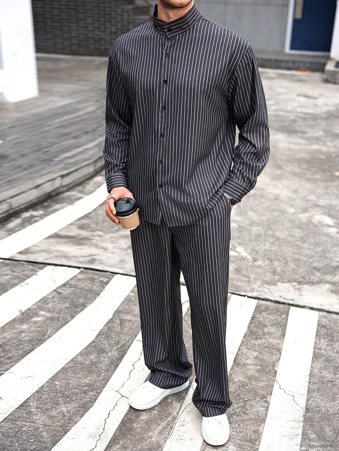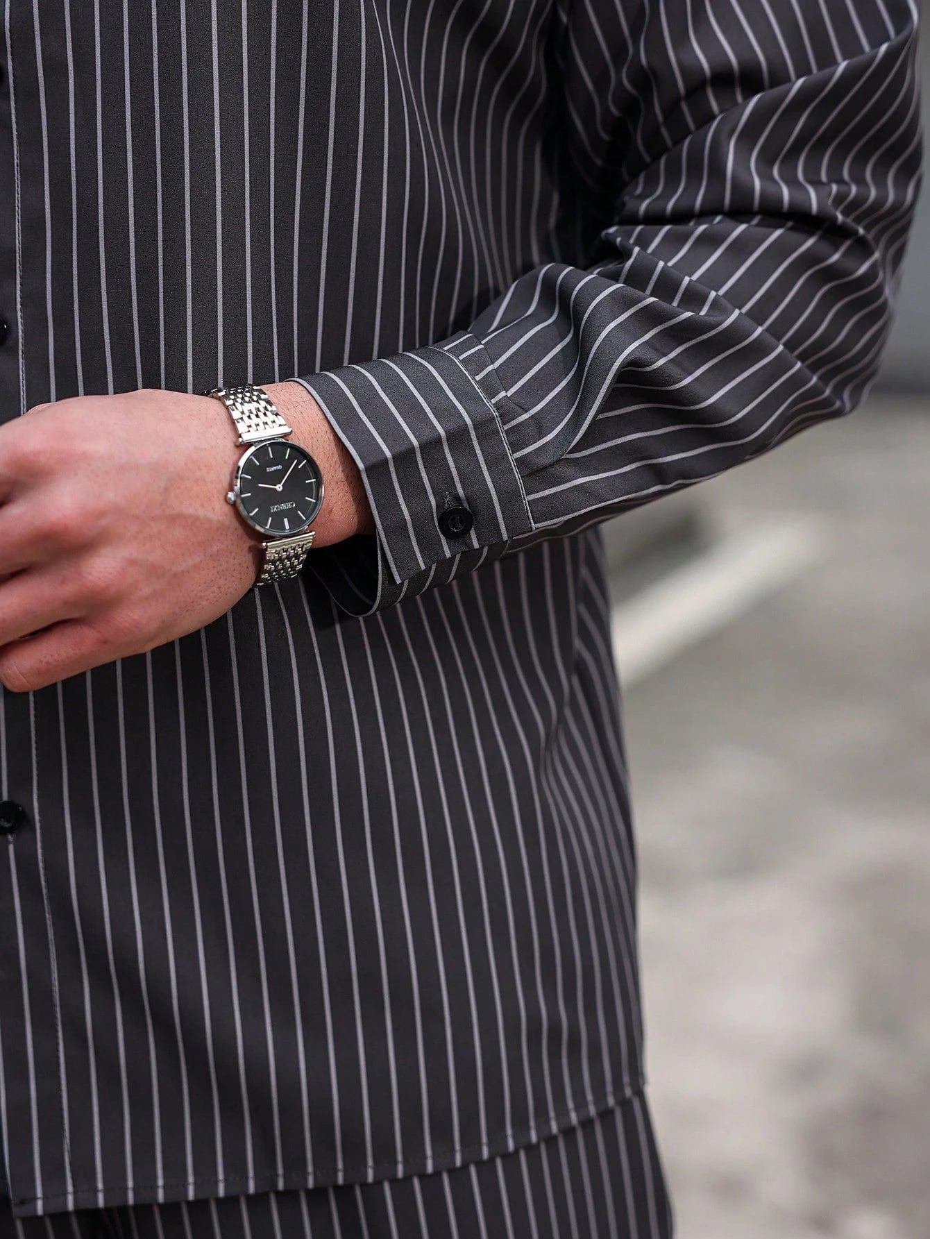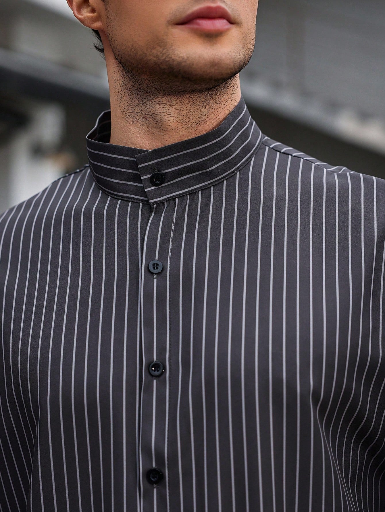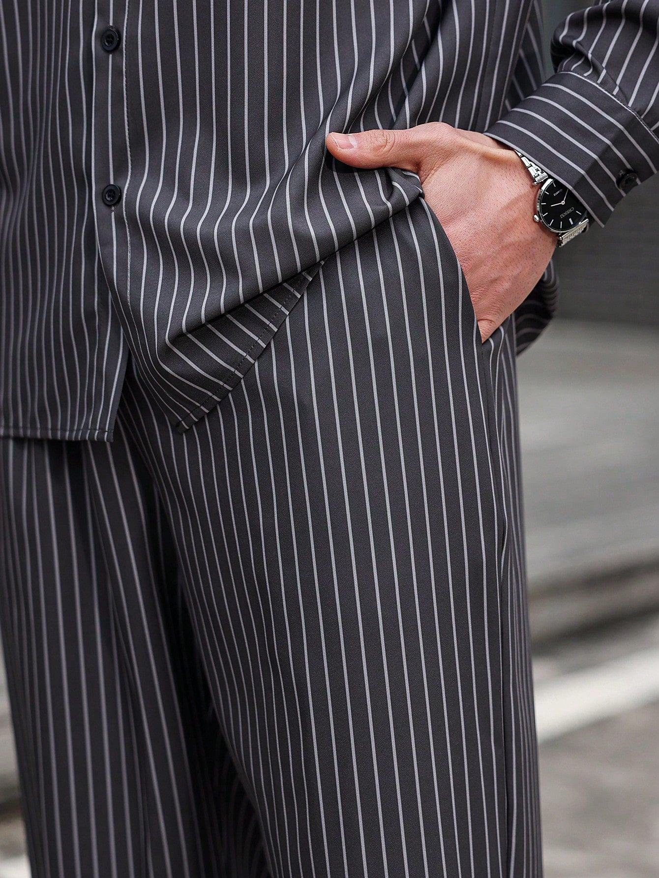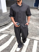 Manfinity CasualCool Men's Casual Daily Wear And Vacation Attire, Featuring A Gray Vertical Striped Long-Sleeve