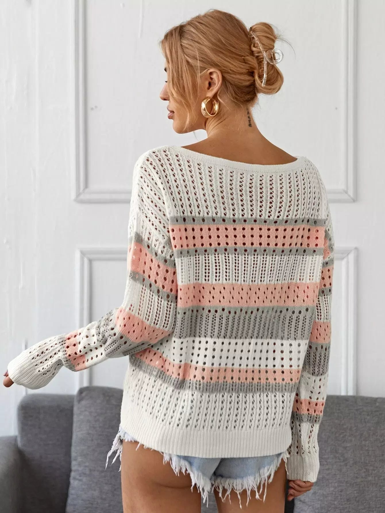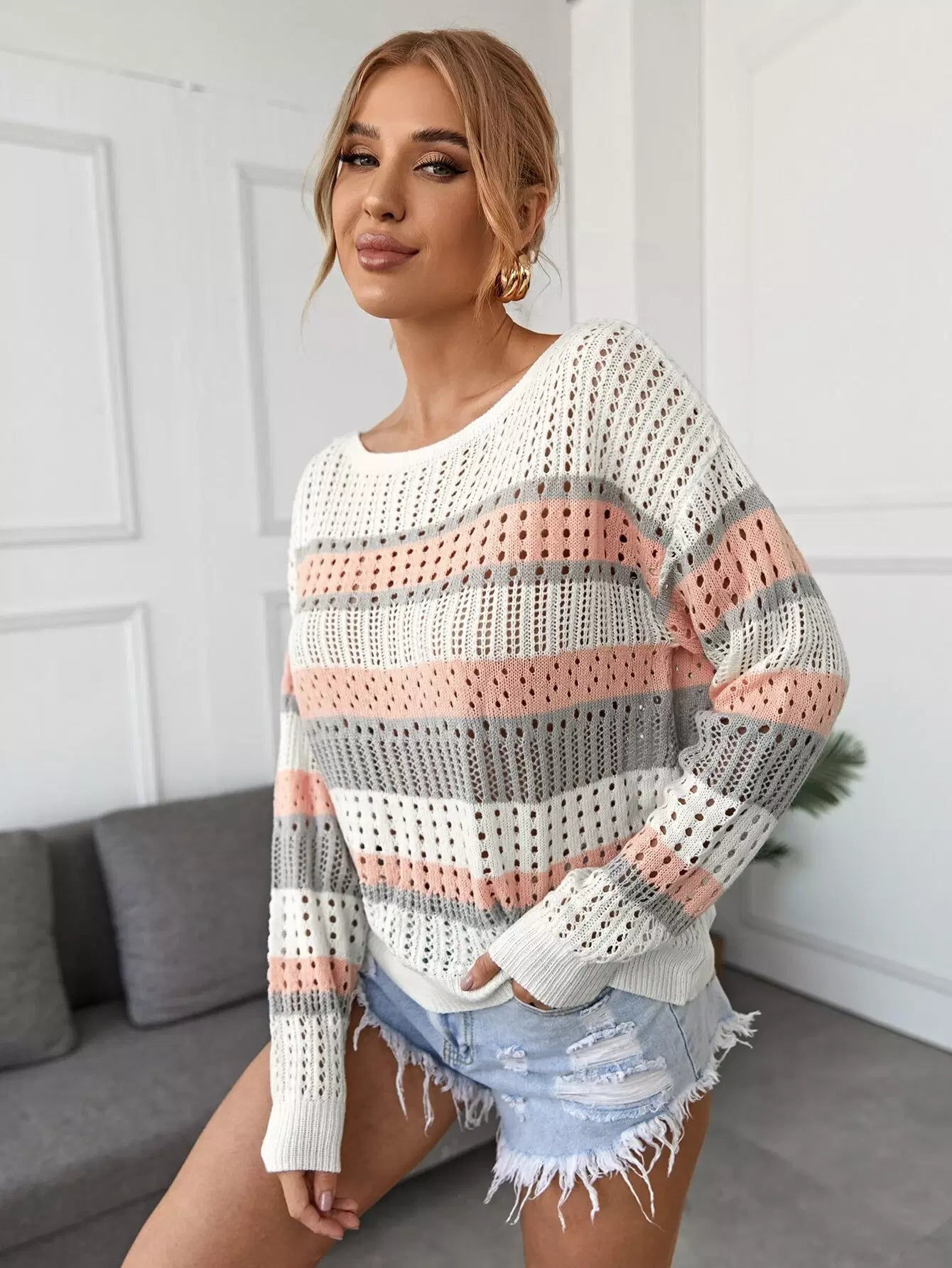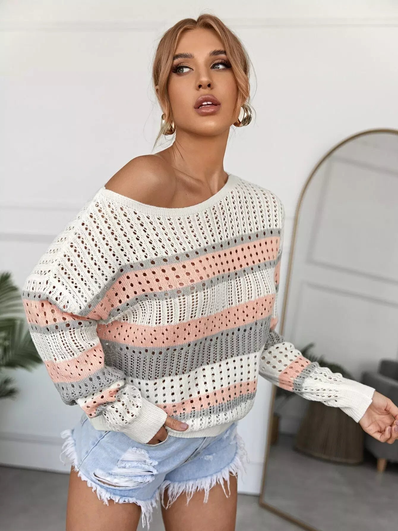 Colorblock Drop Shoulder Pointelle Knit Sweater