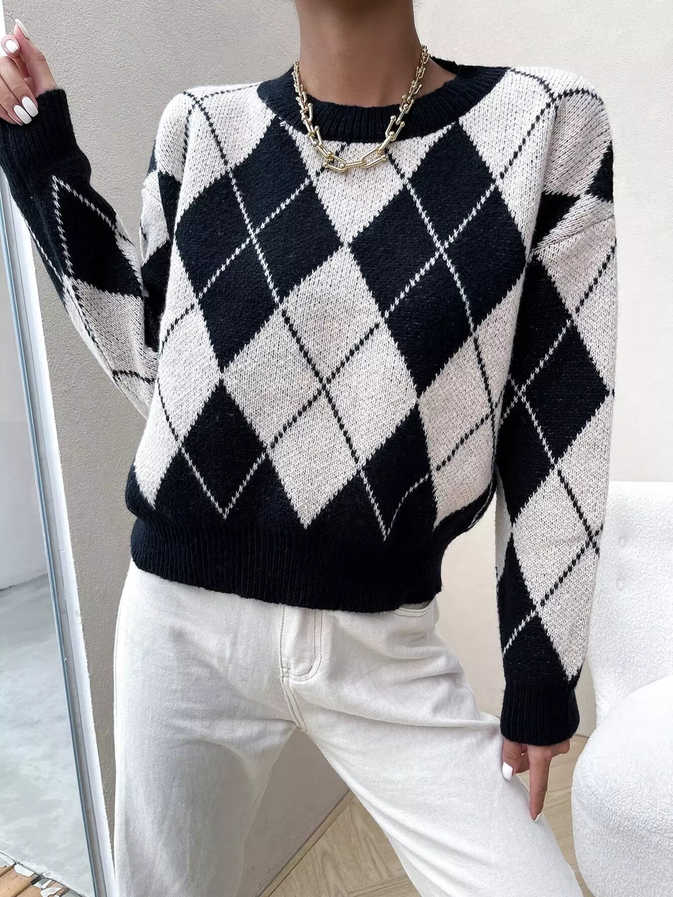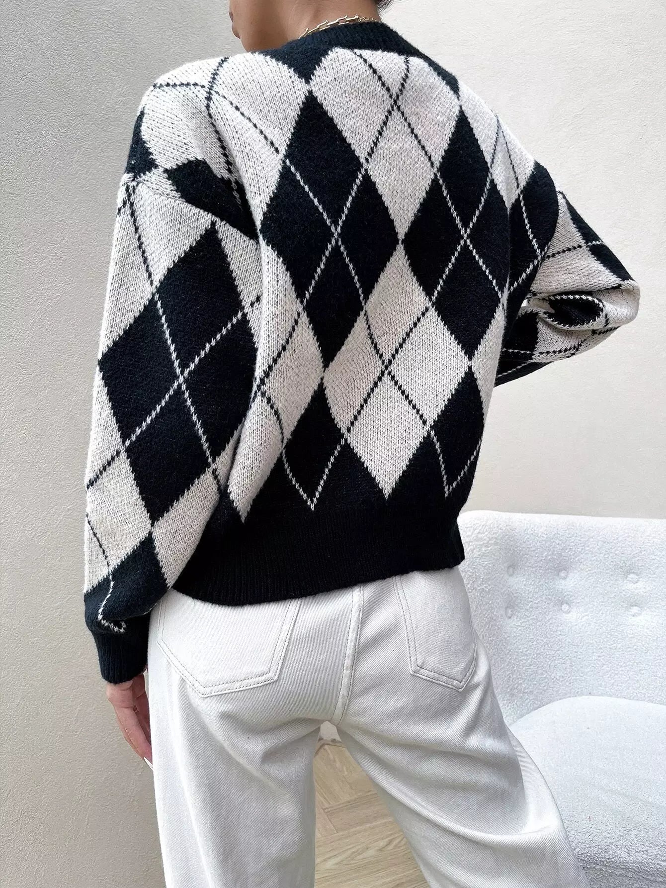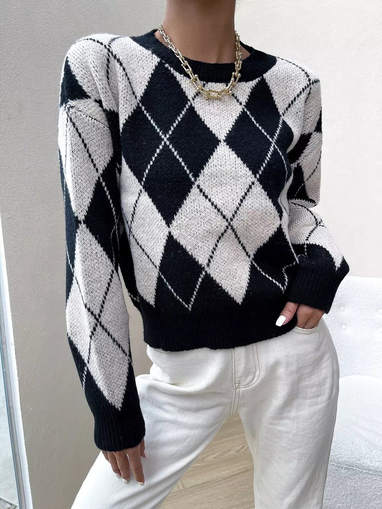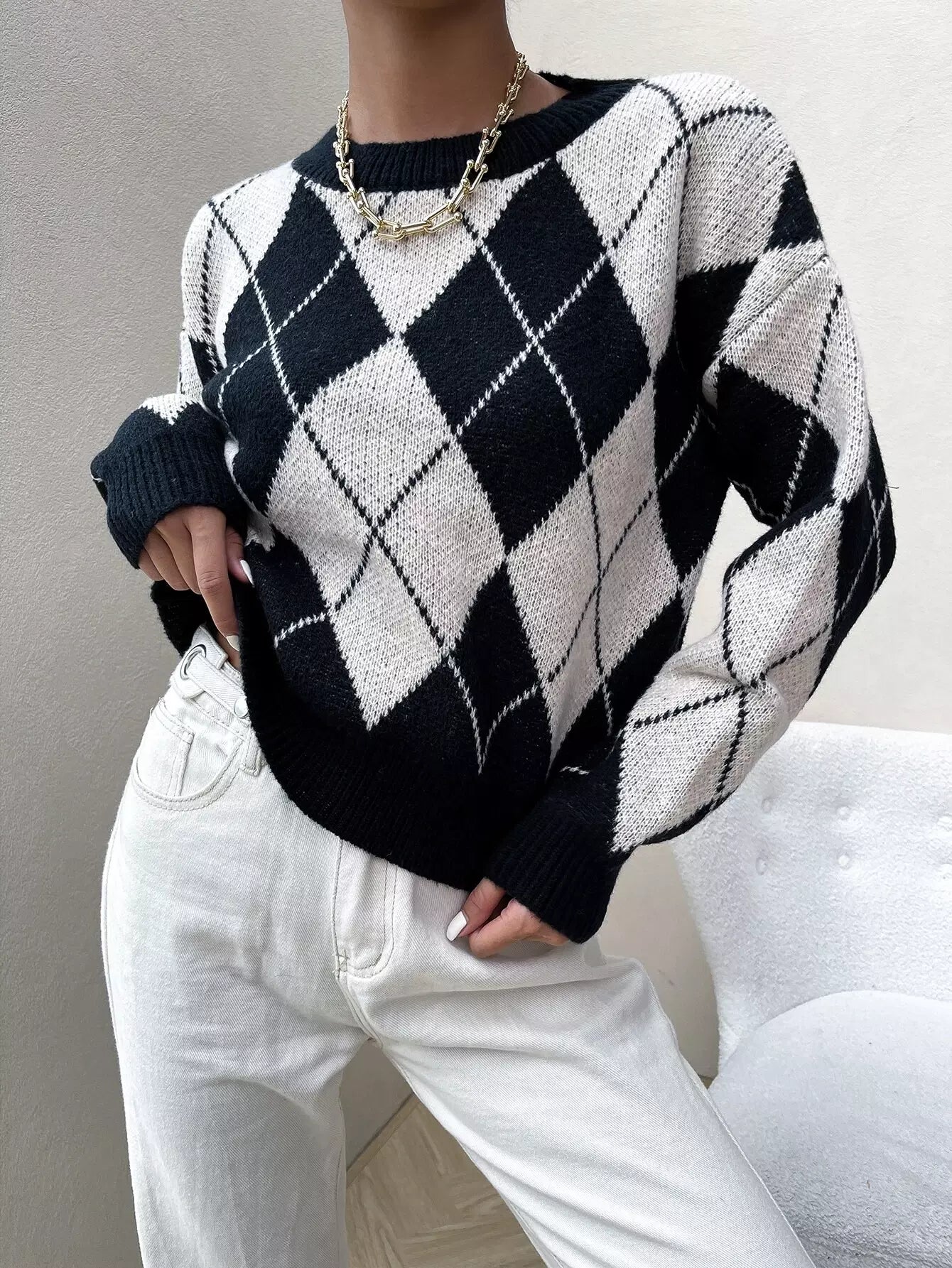 Drop Shoulder Argyle Pattern Colorblock Sweater