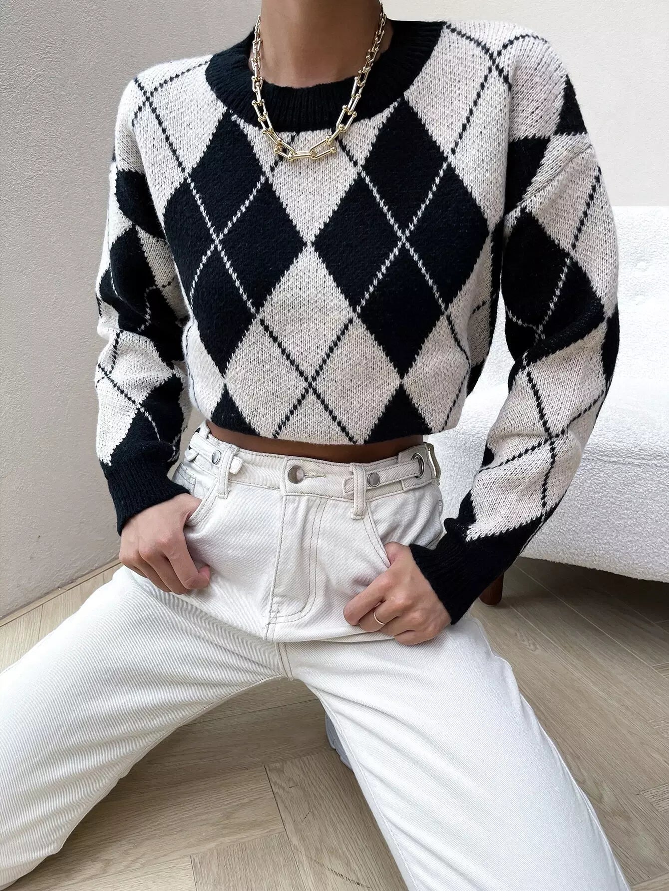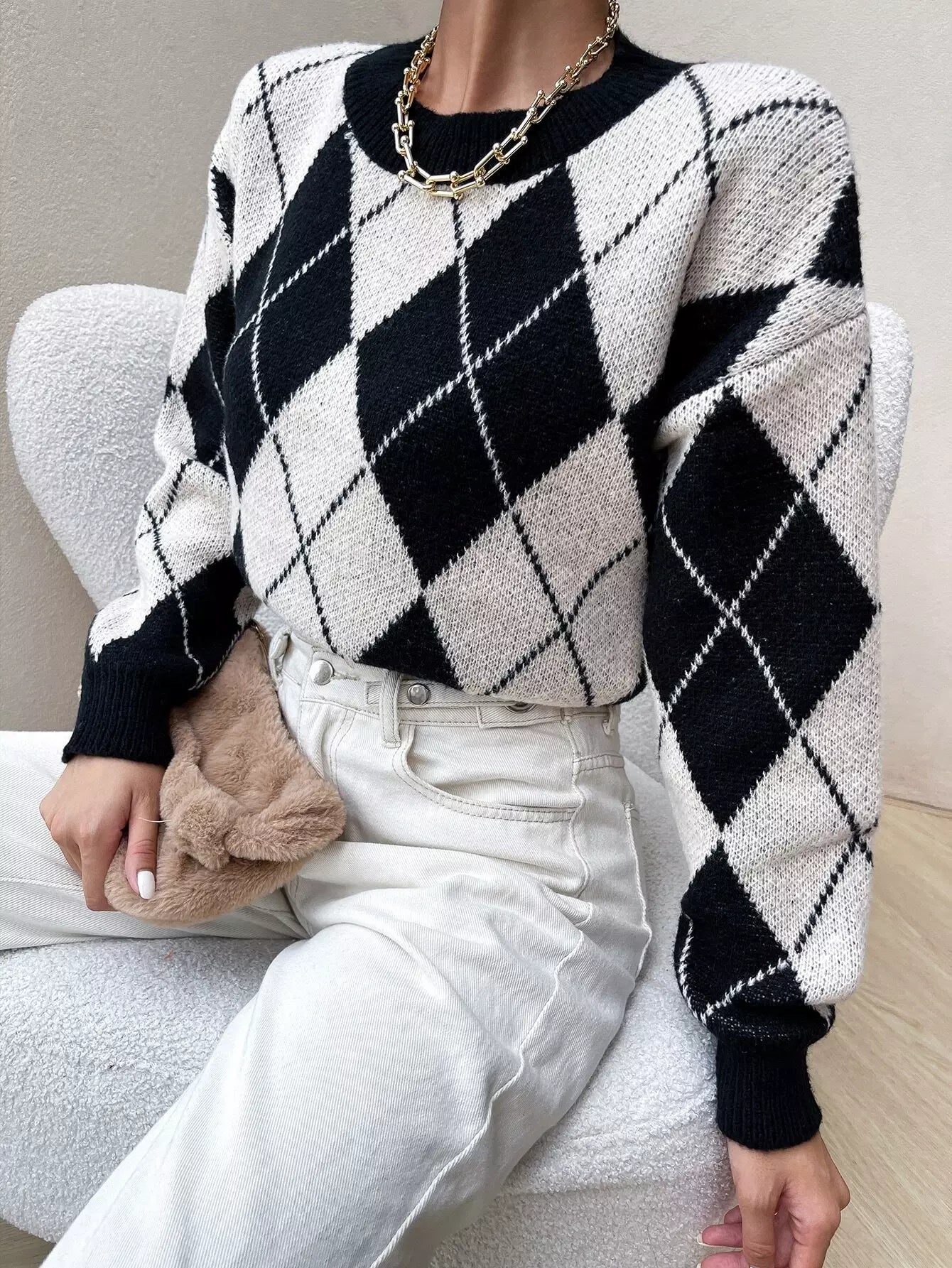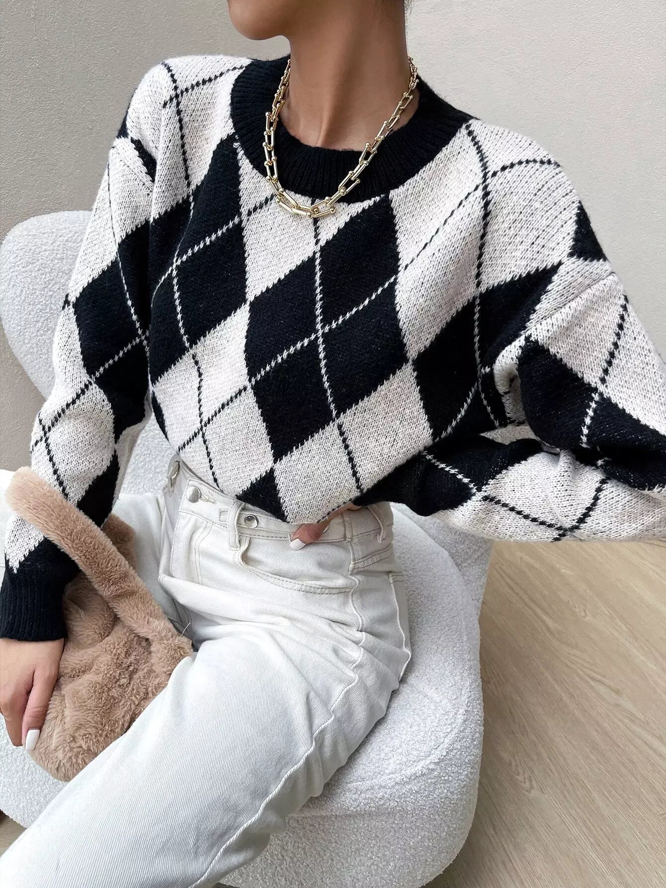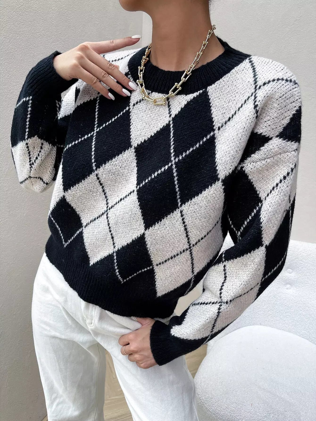 Drop Shoulder Argyle Pattern Colorblock Sweater