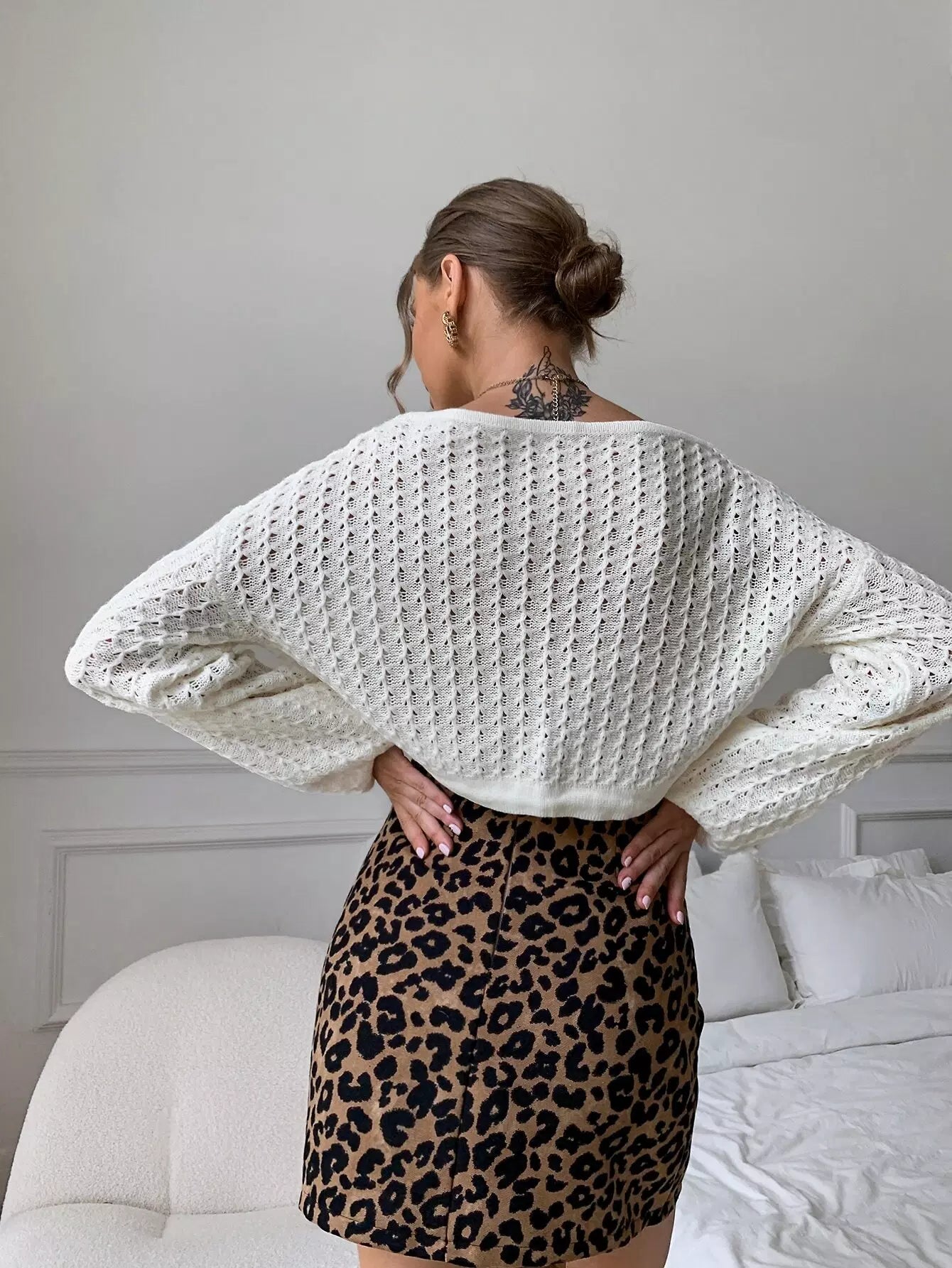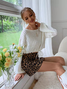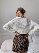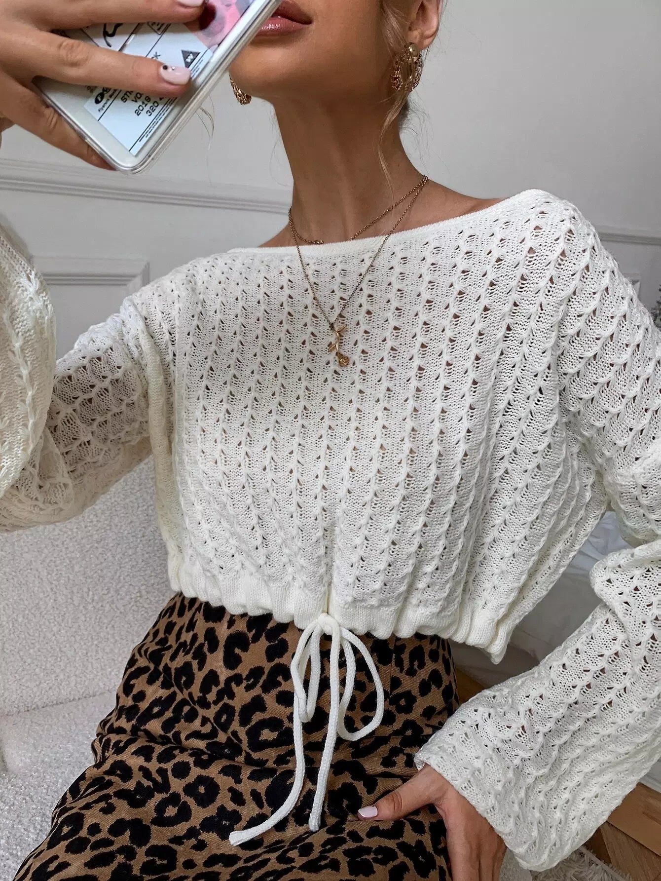 Drop Shoulder Pointelle Knit Drawstring Crop Sweater