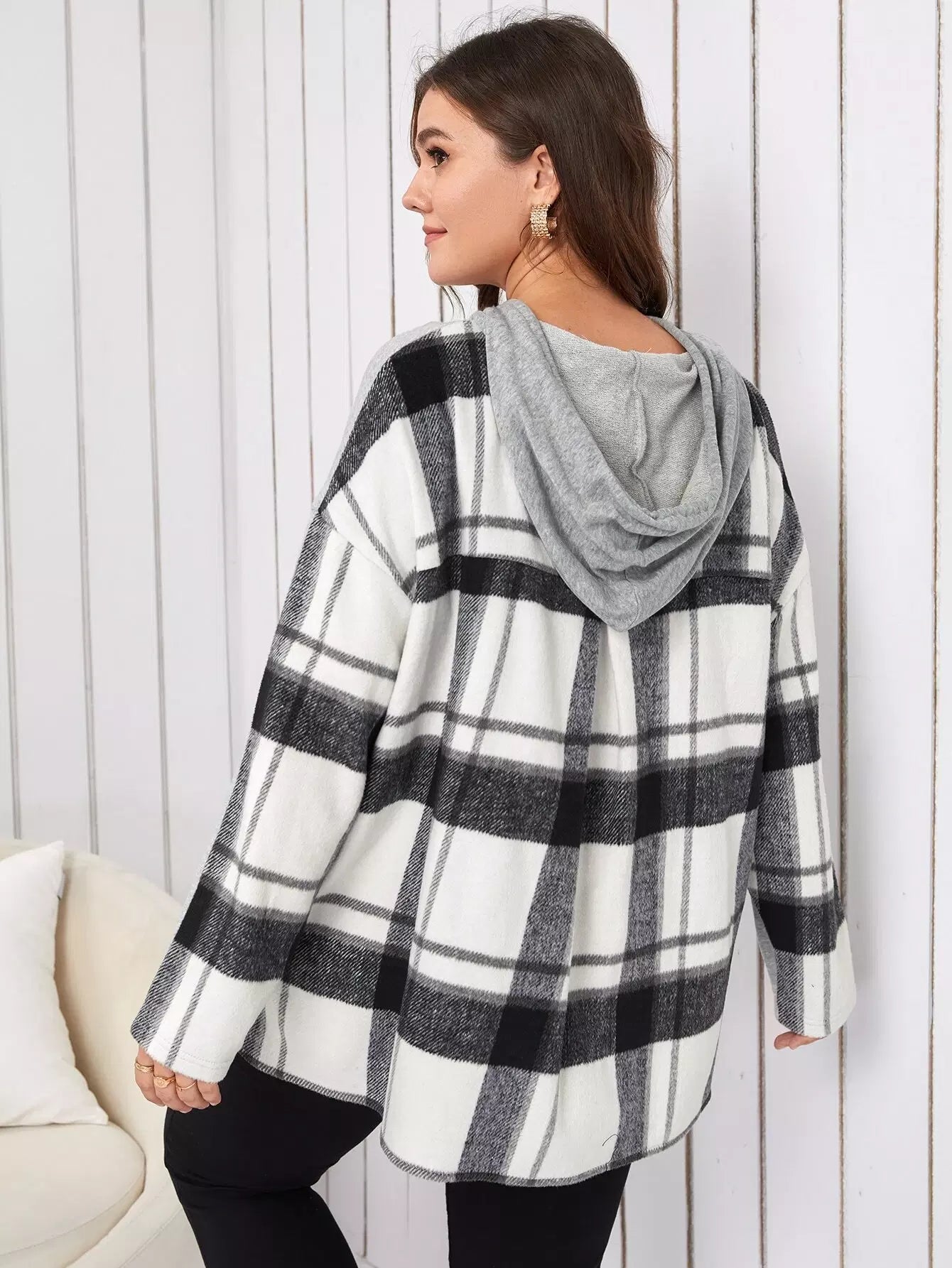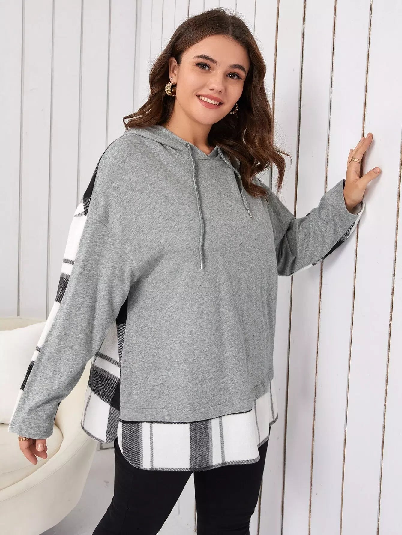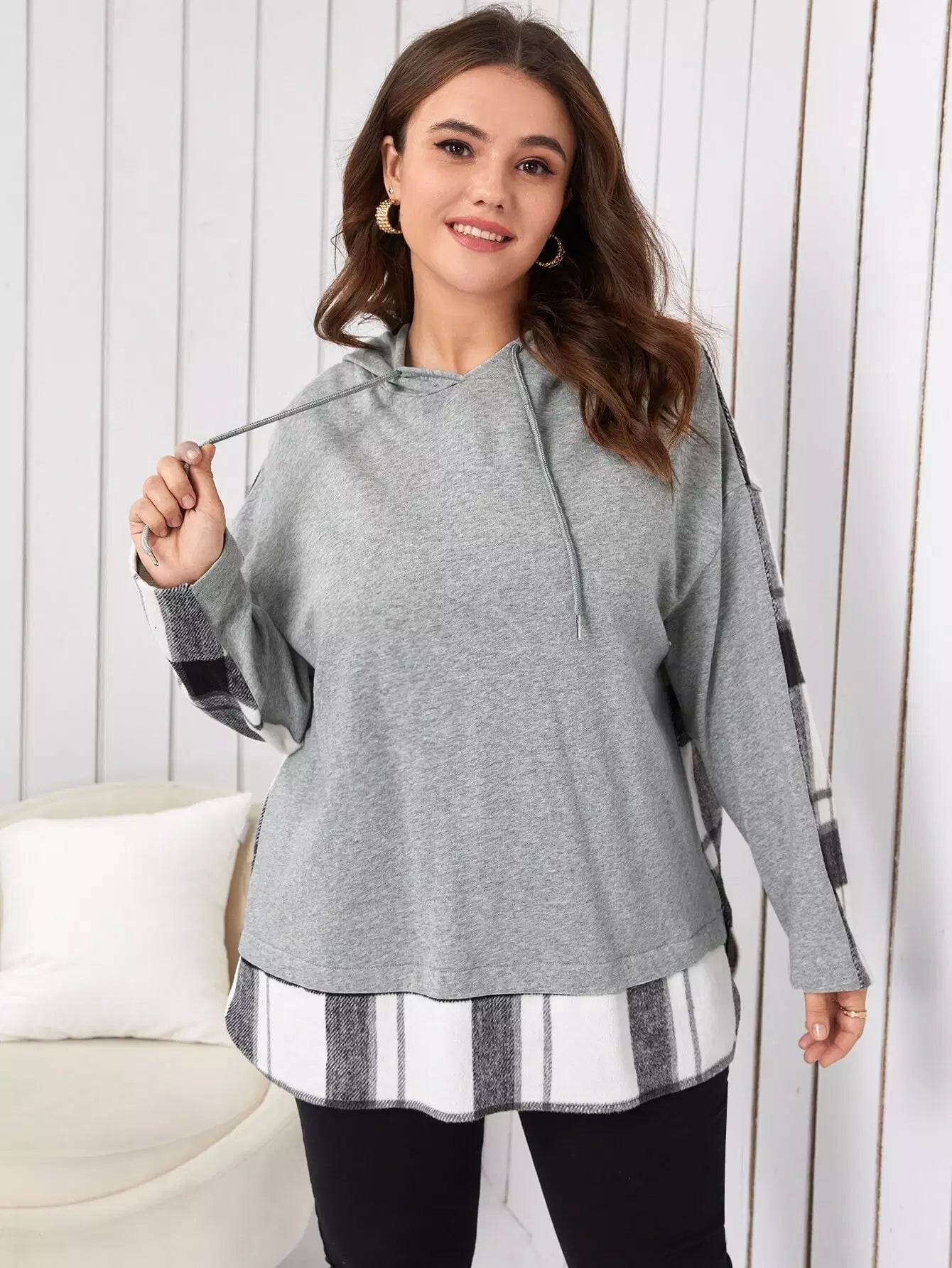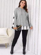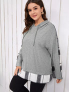 Plus Drop Shoulder Plaid Print Drawstring Colorblock Hoodie