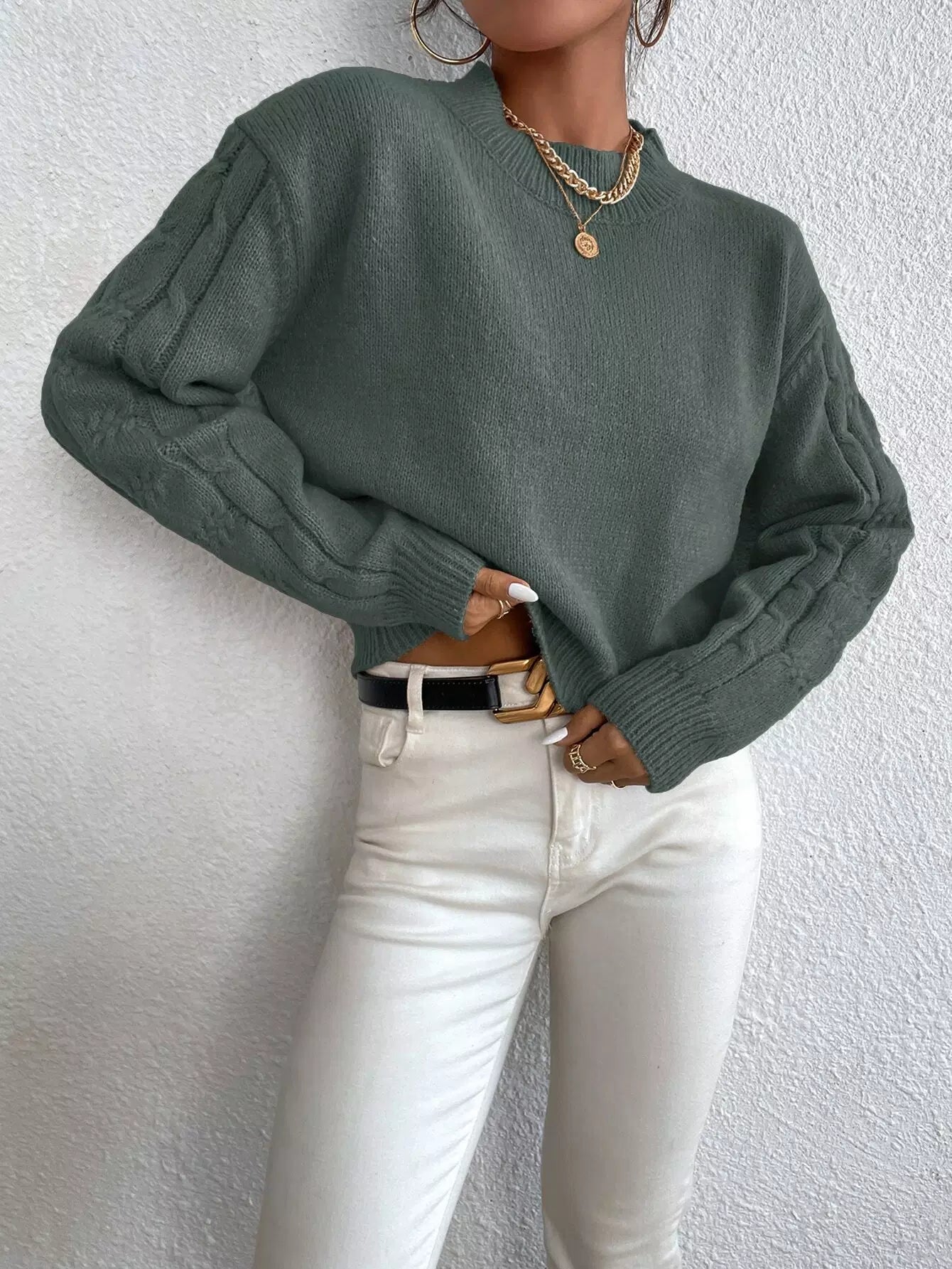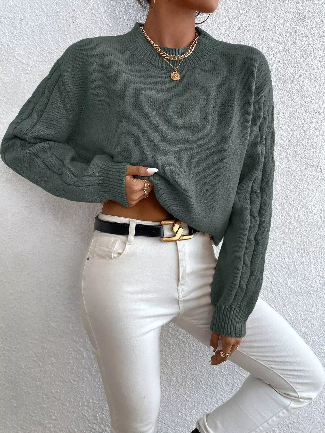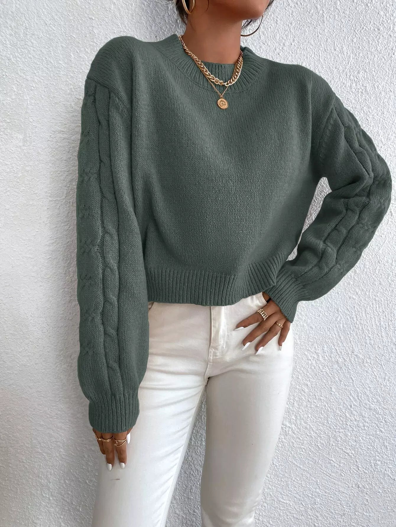 Solid Drop Shoulder Cable Knit Sweater