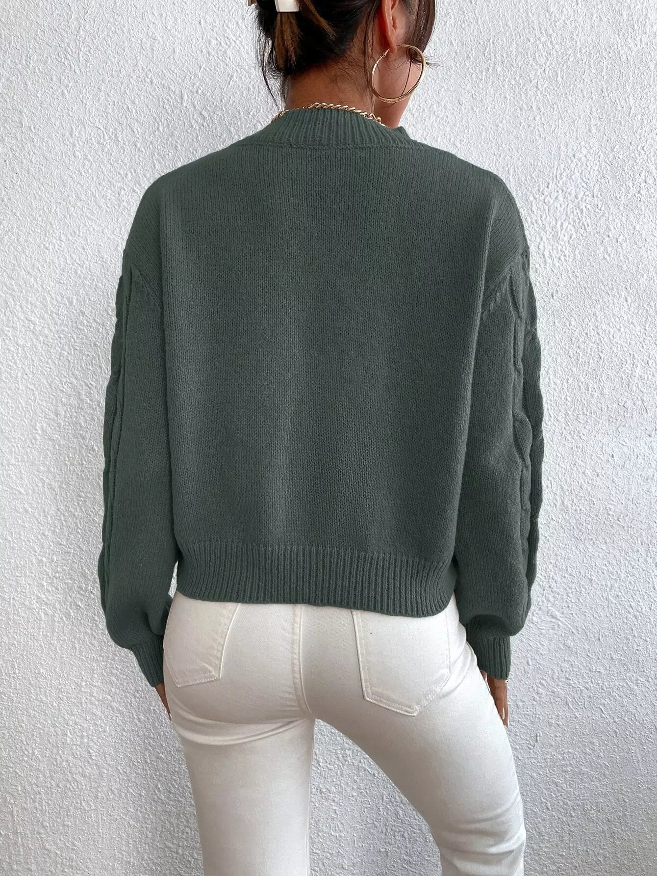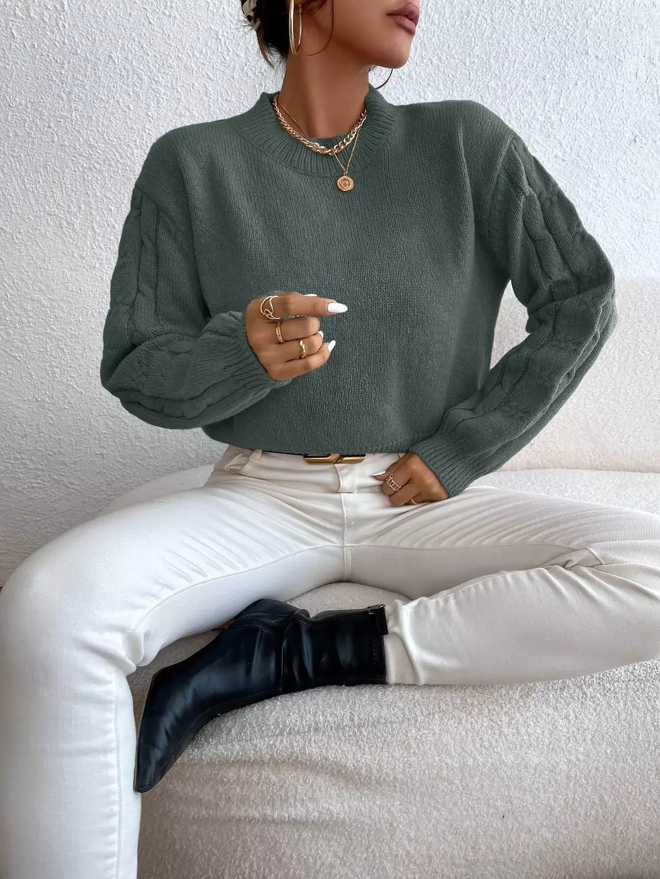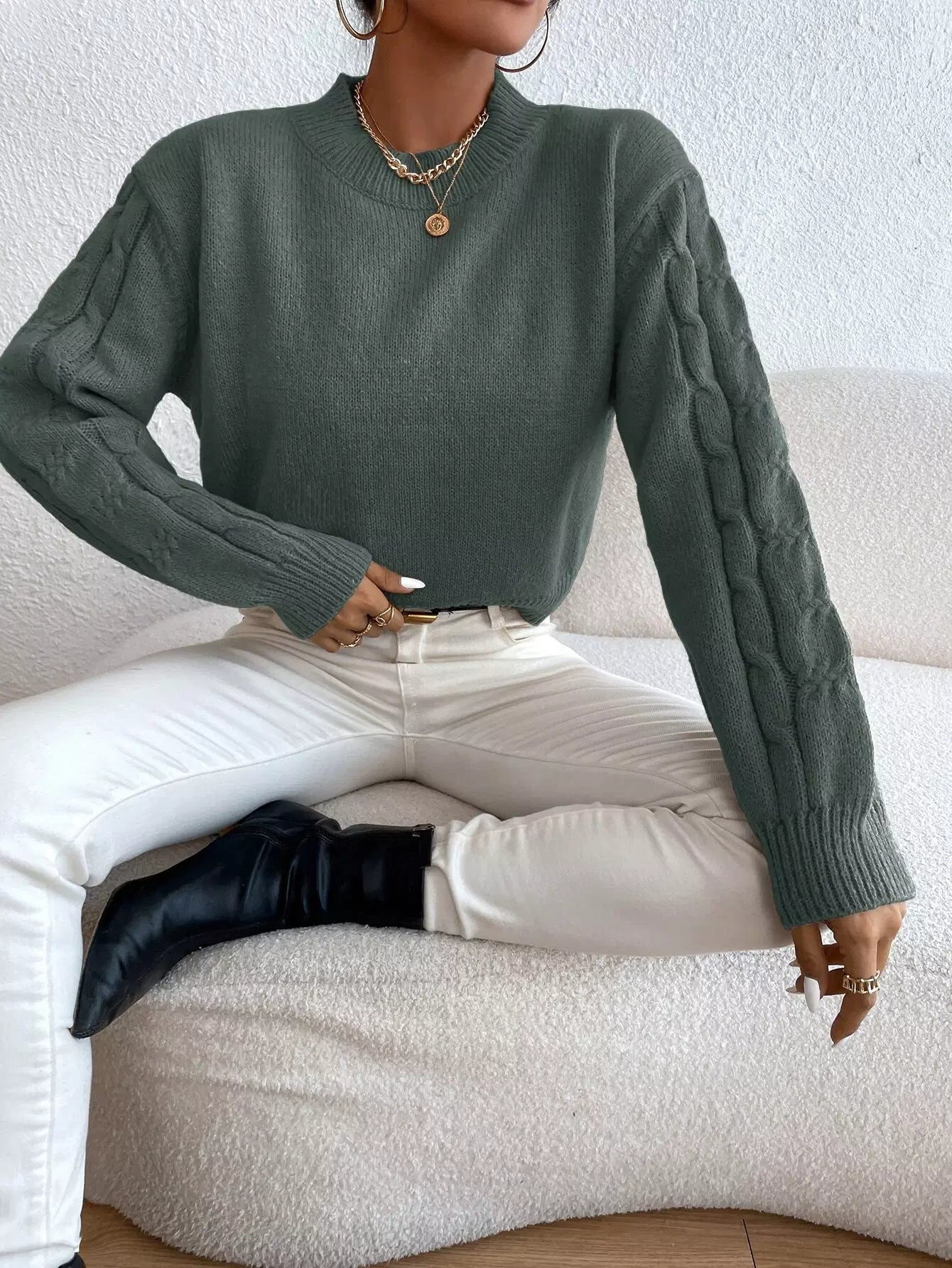 Solid Drop Shoulder Cable Knit Sweater