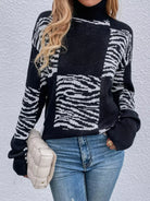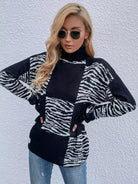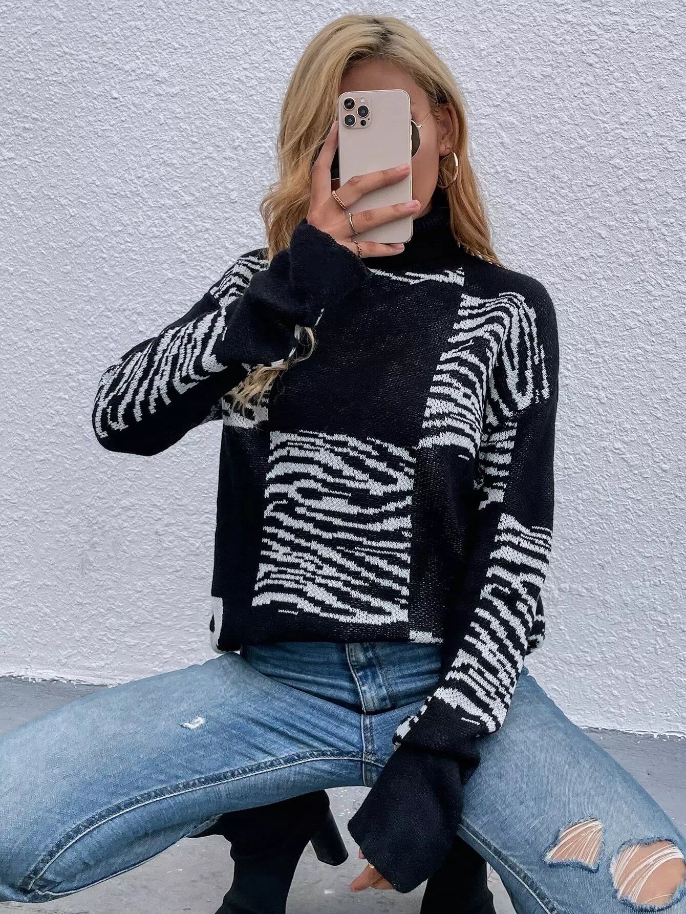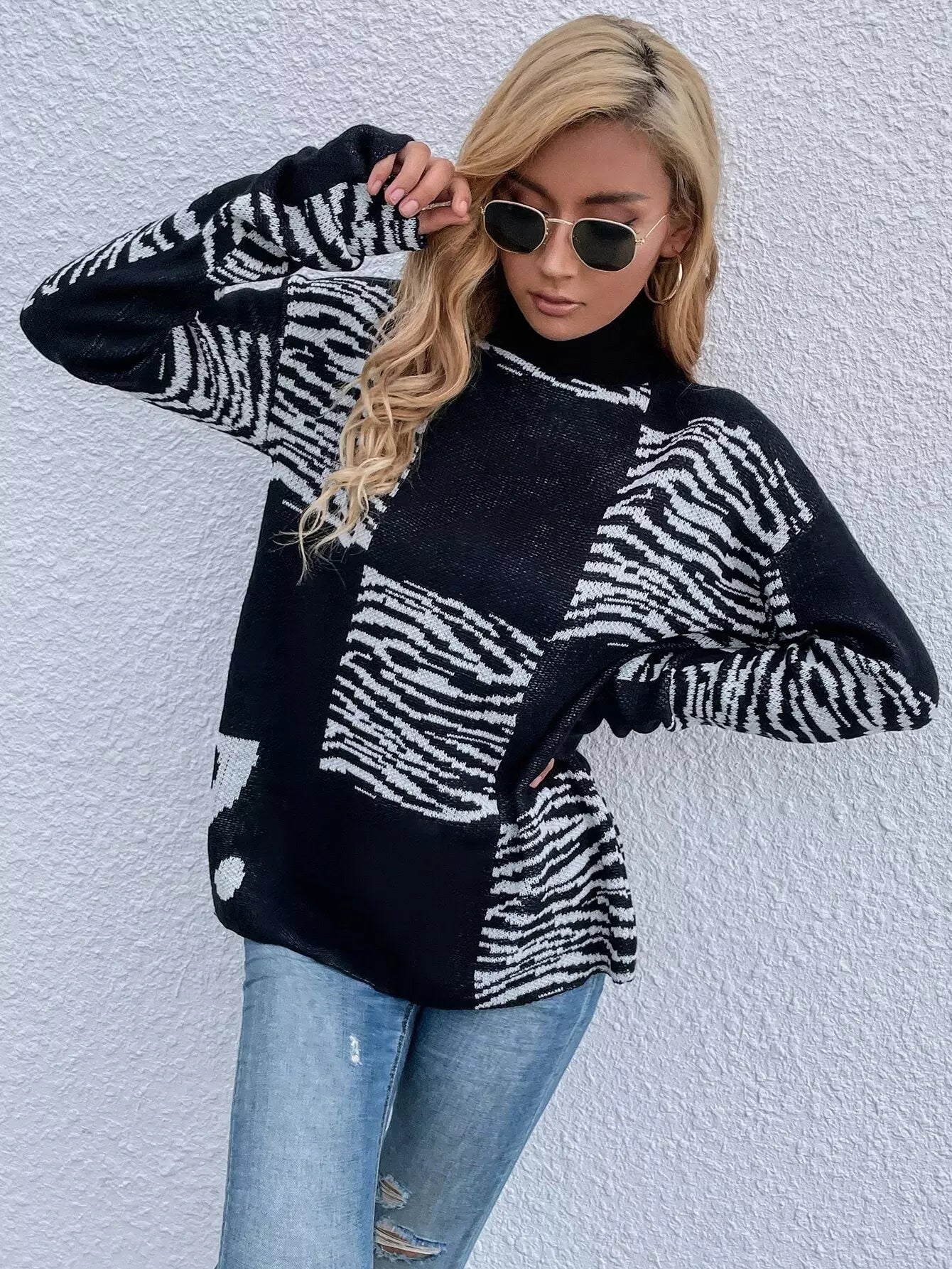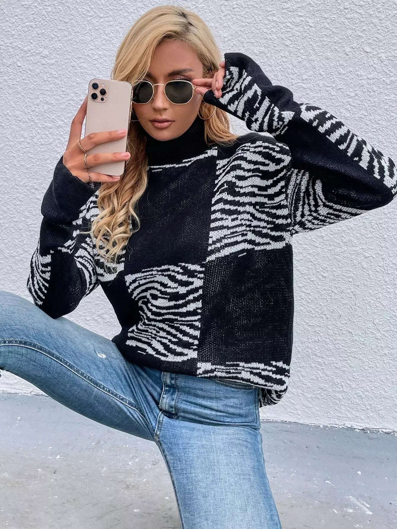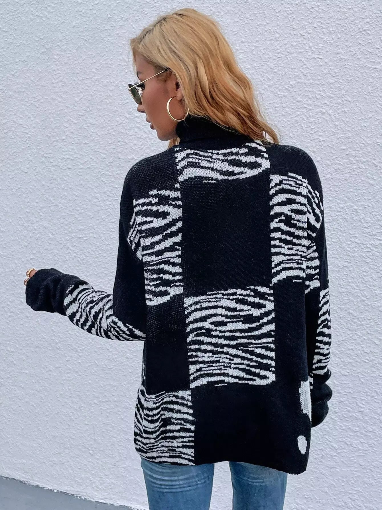 Zebra Striped Pattern Drop Shoulder Turtle Neck Sweater
