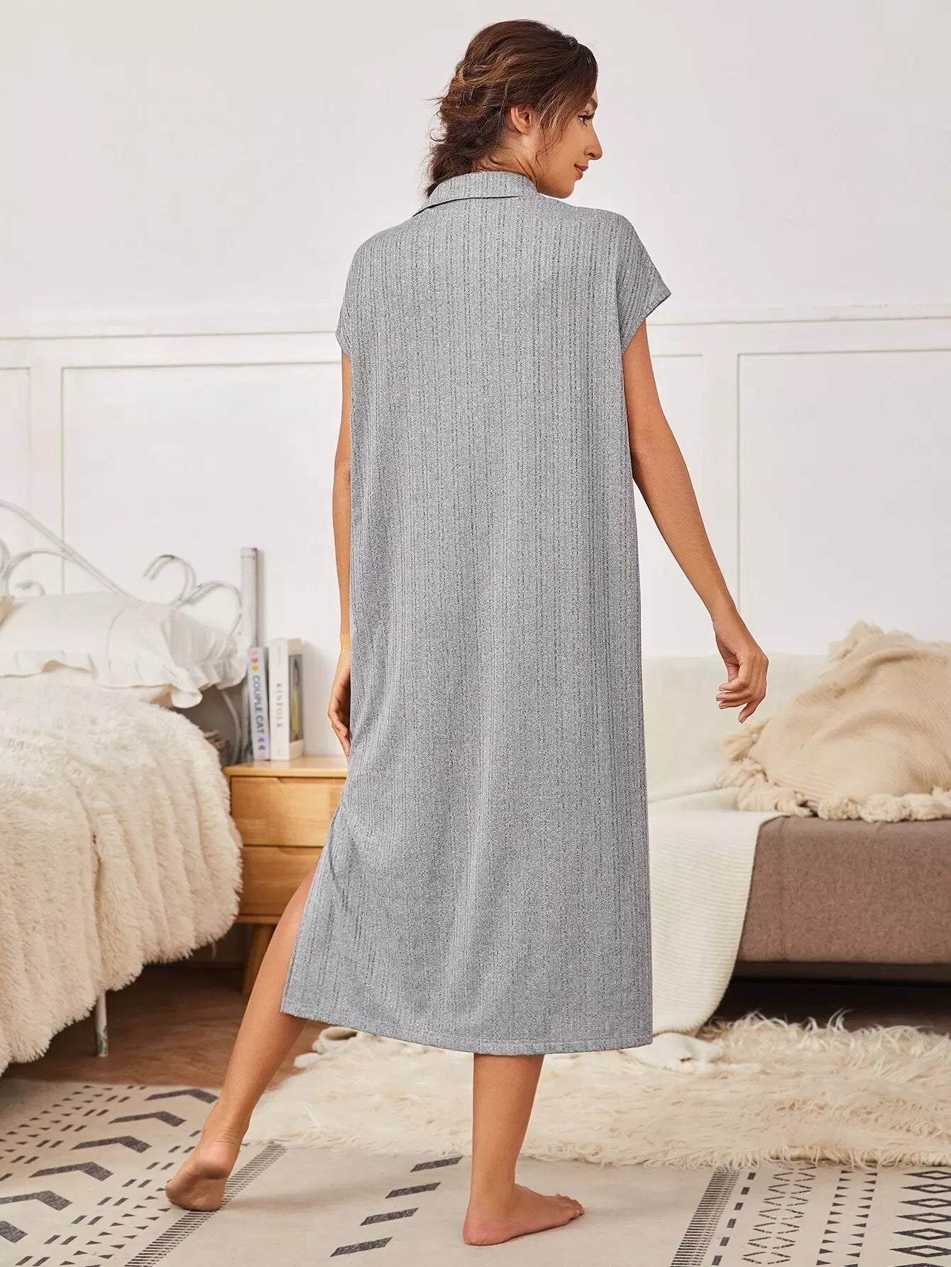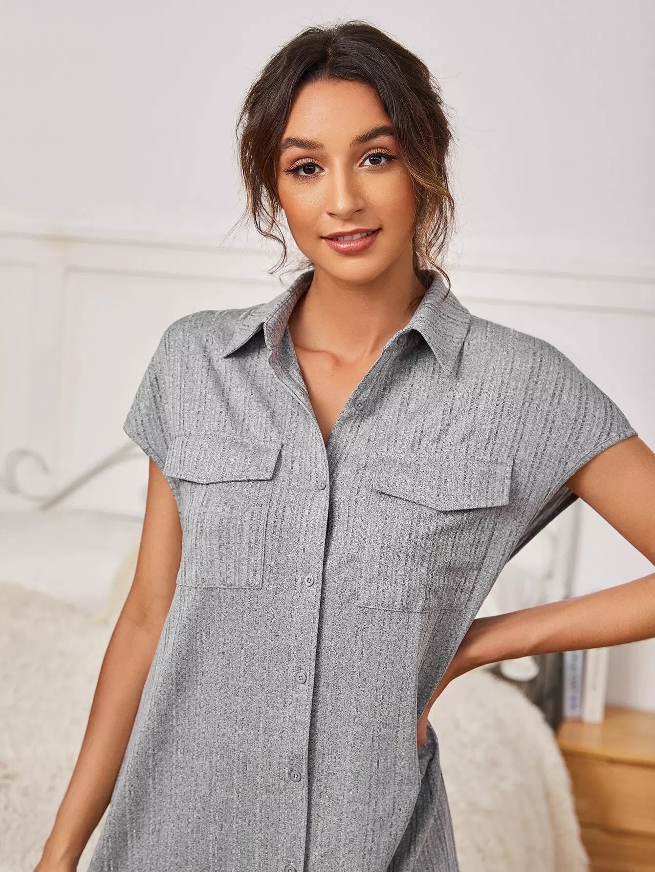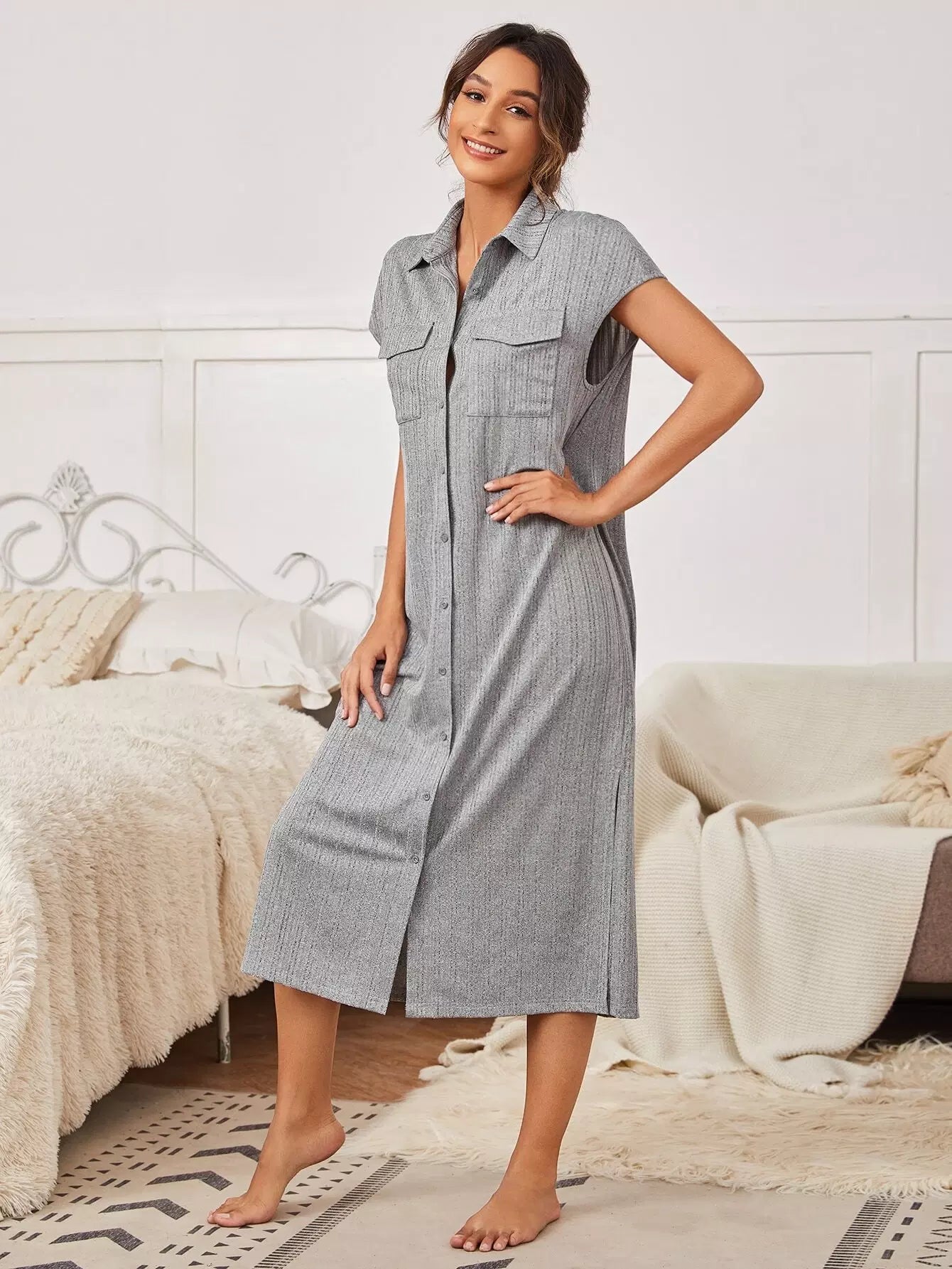 Flap Pocket Button Front Split Hem Nightdress