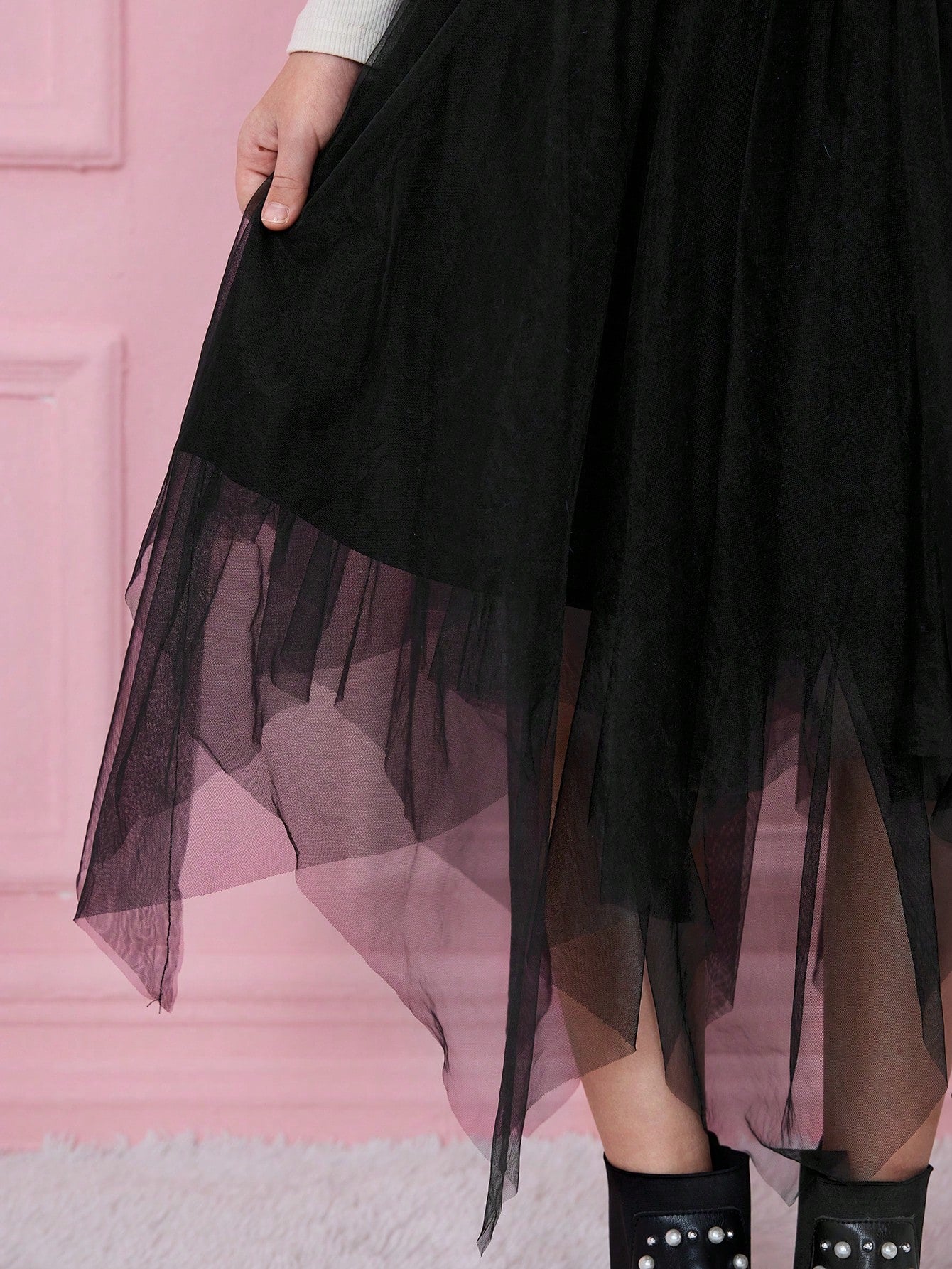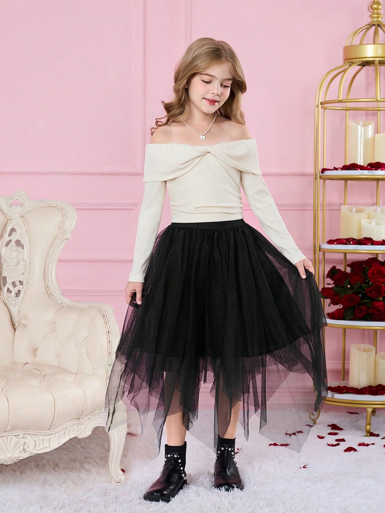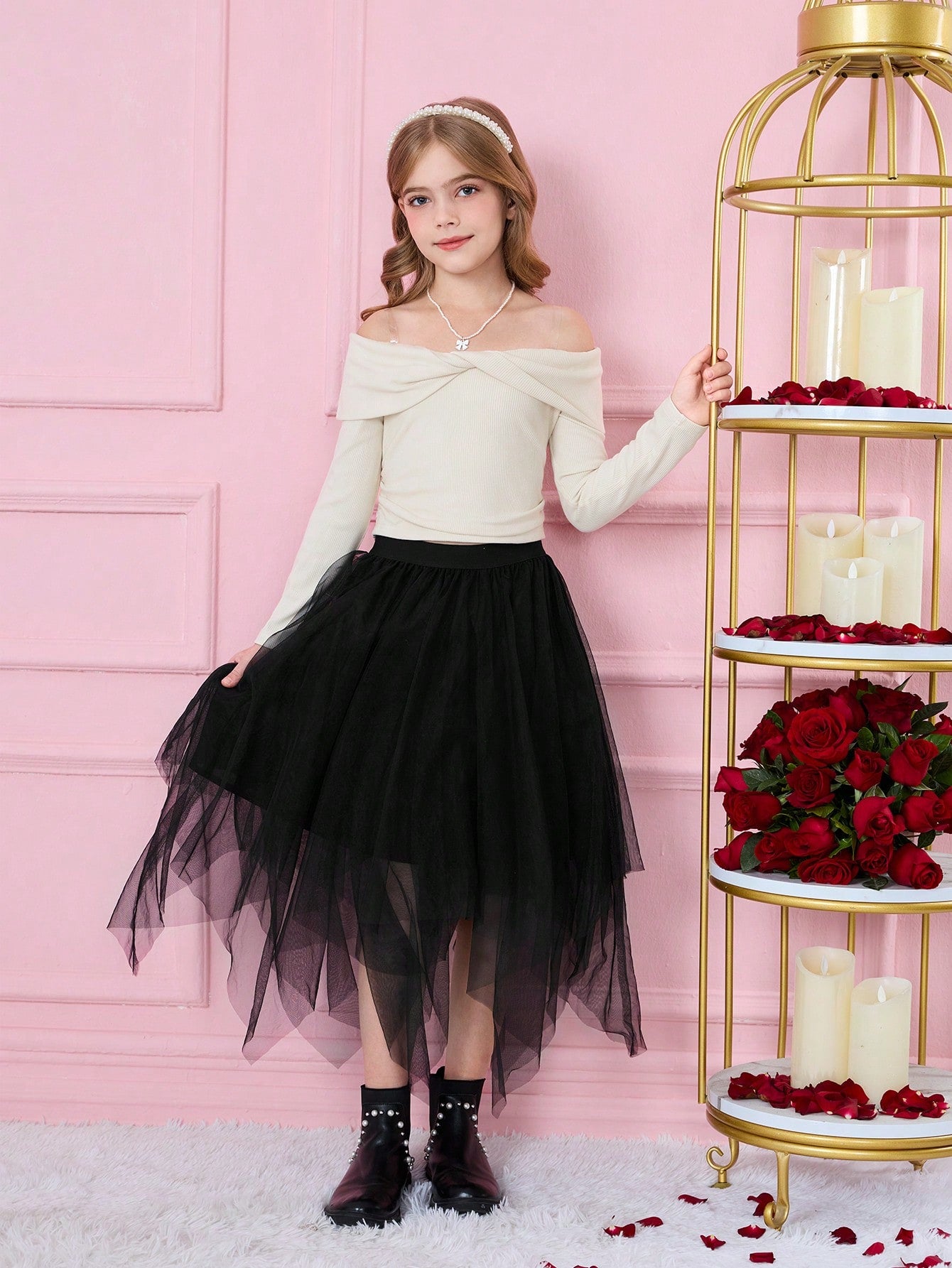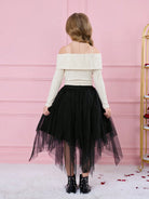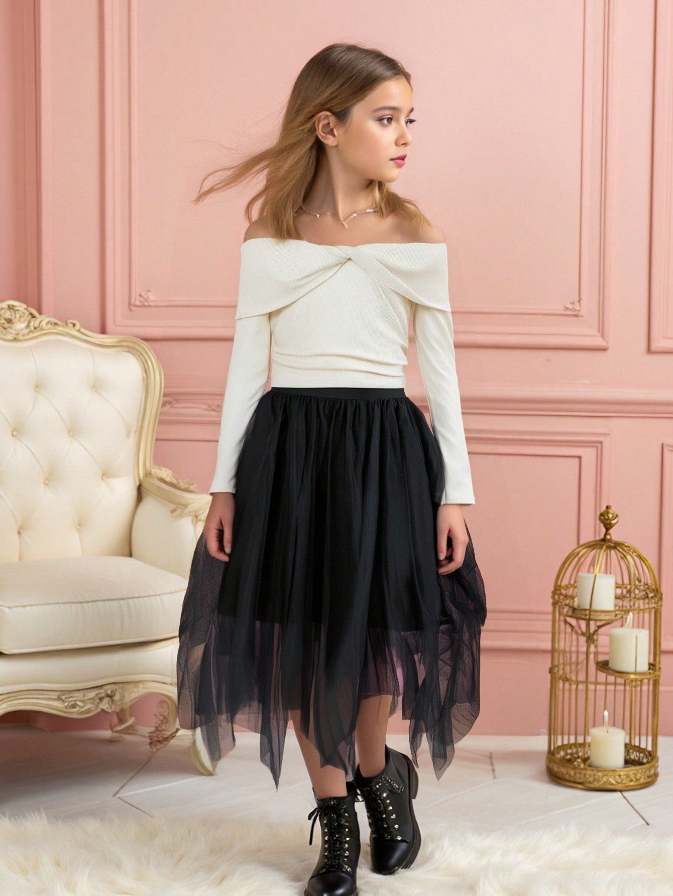 Fern Glow Tween Girls Cute Solid Color Off-Shoulder Long Sleeve Top & Mesh Skirt 2Pcs Set
