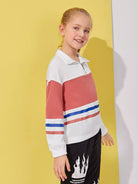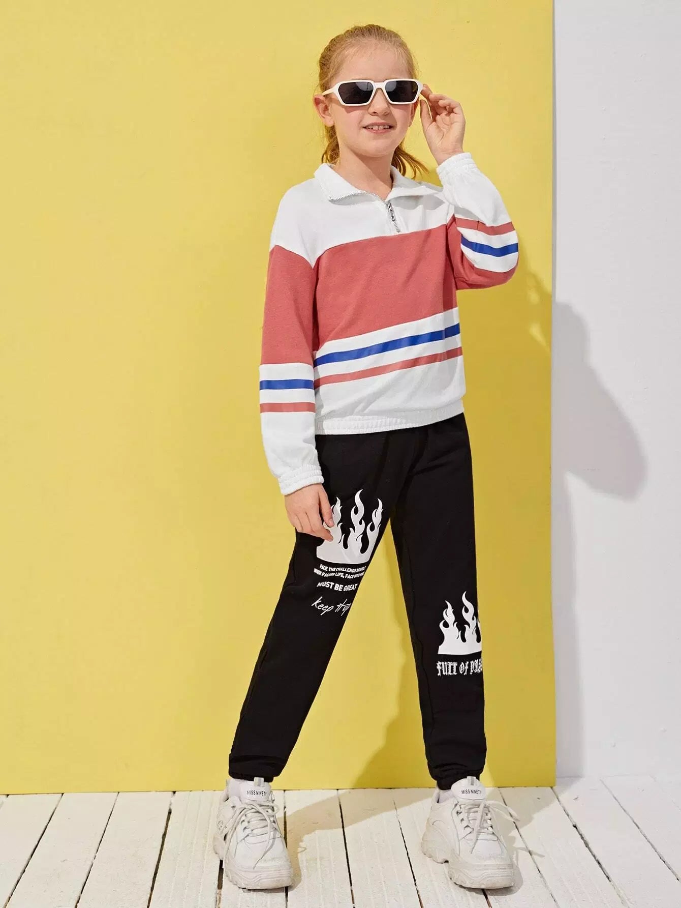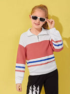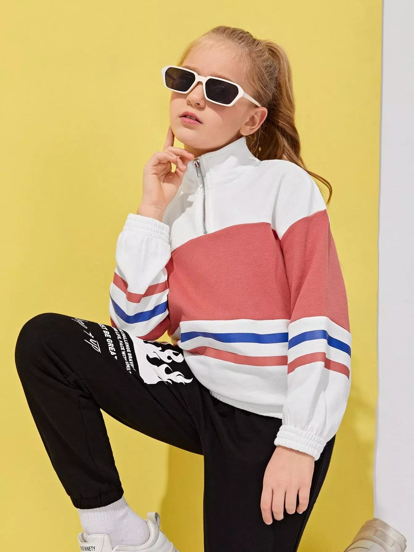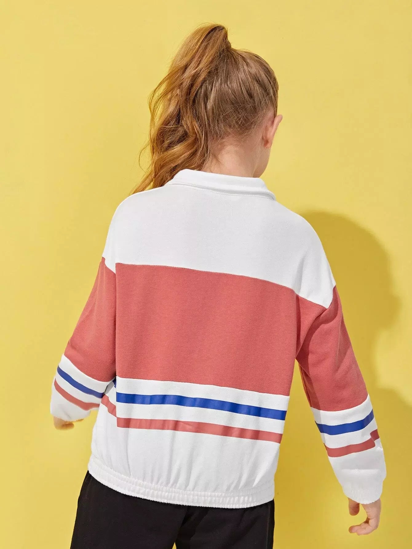 Girls Striped Colorblock Half Zipper Placket Pullover