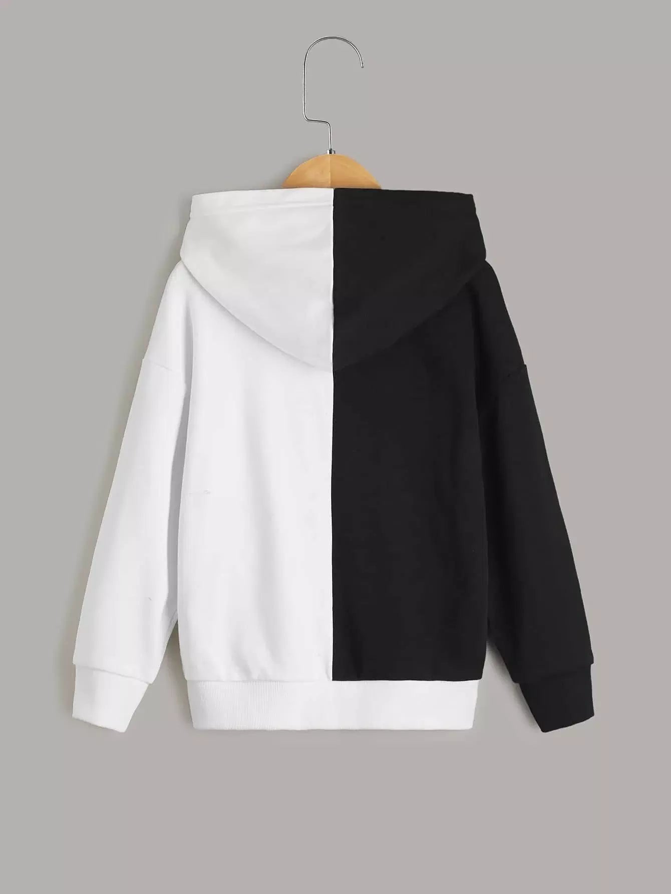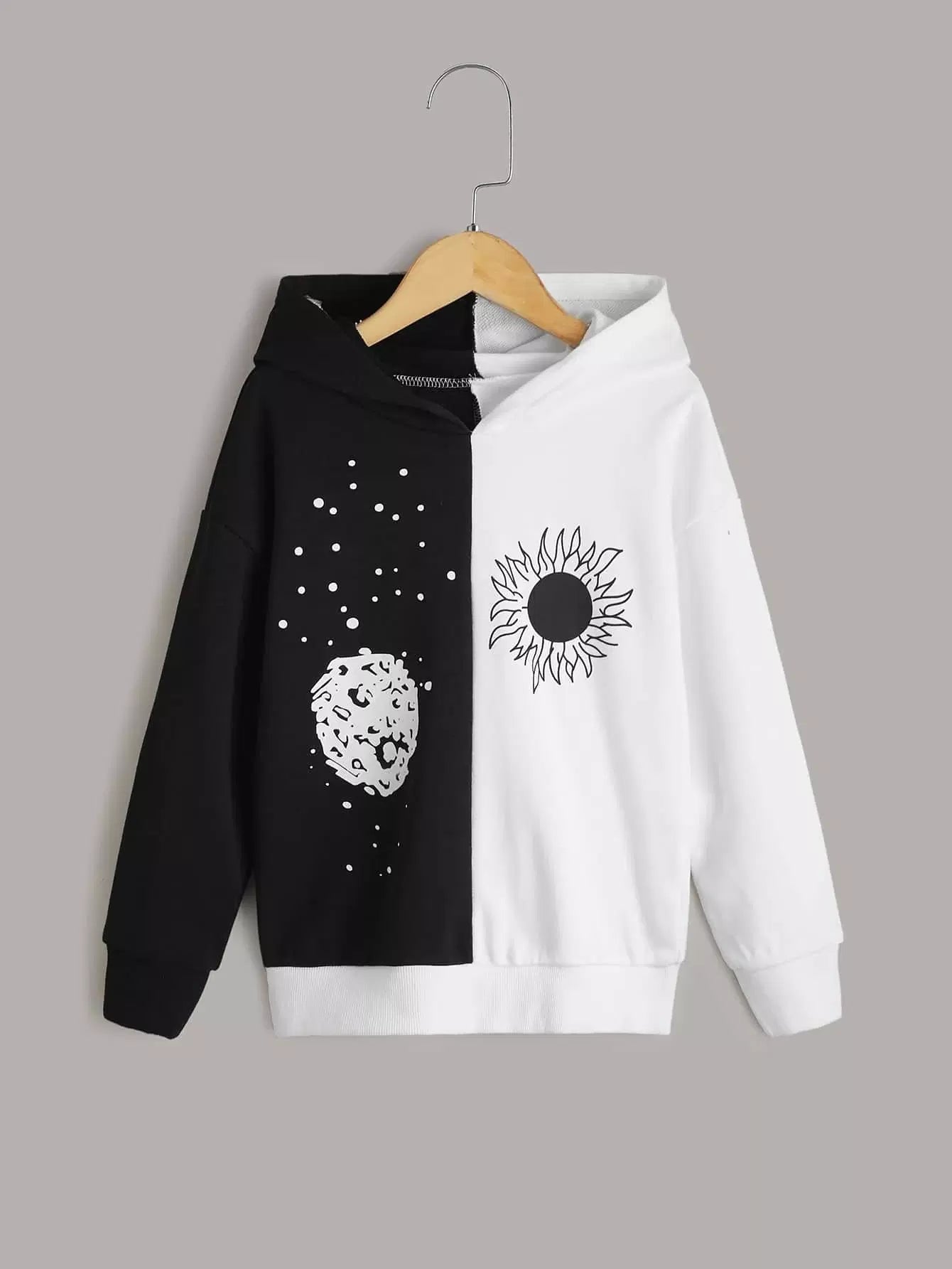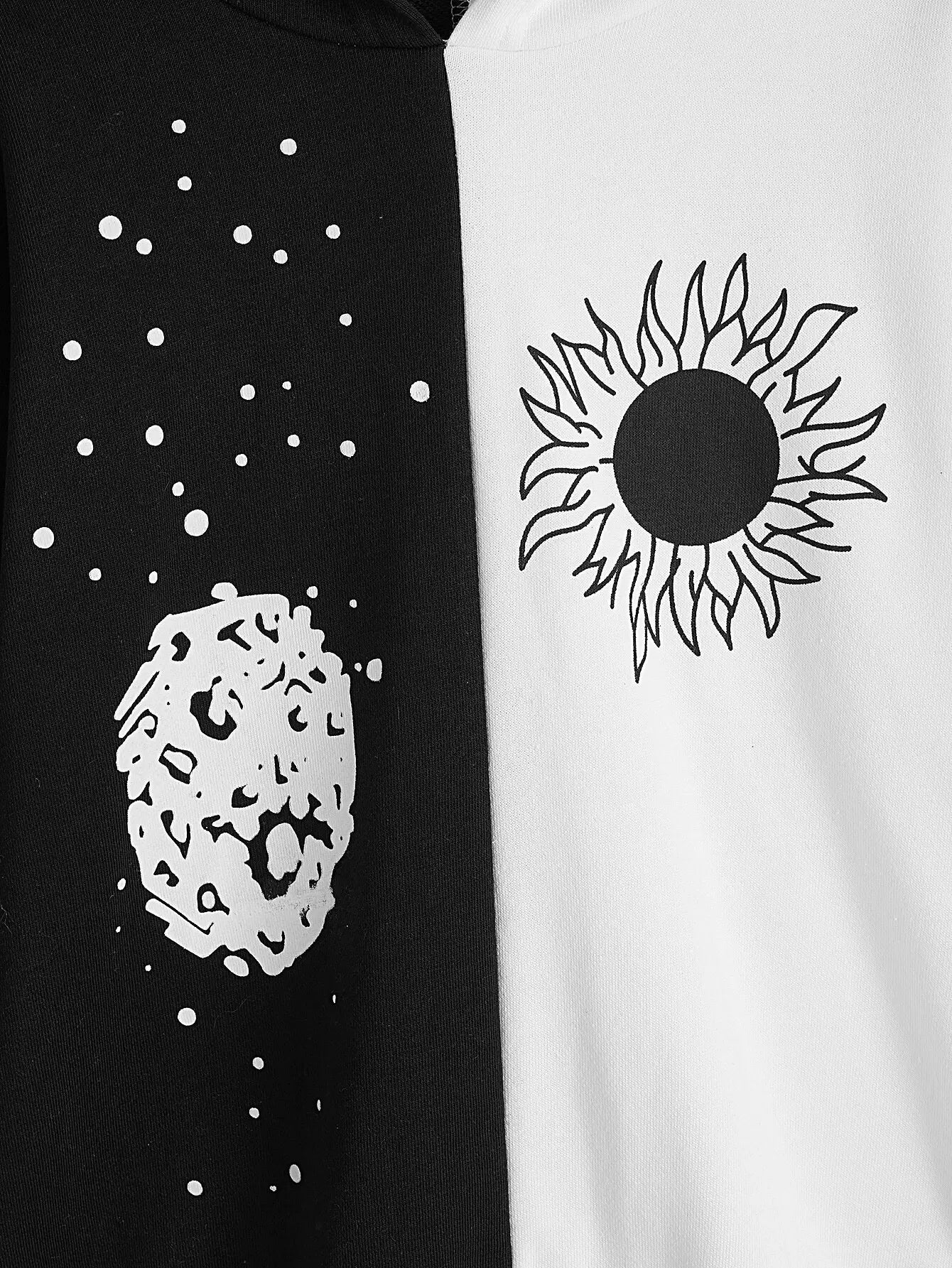 Girls Sun & Moon Print Colorblock Drop Shoulder Hoodie