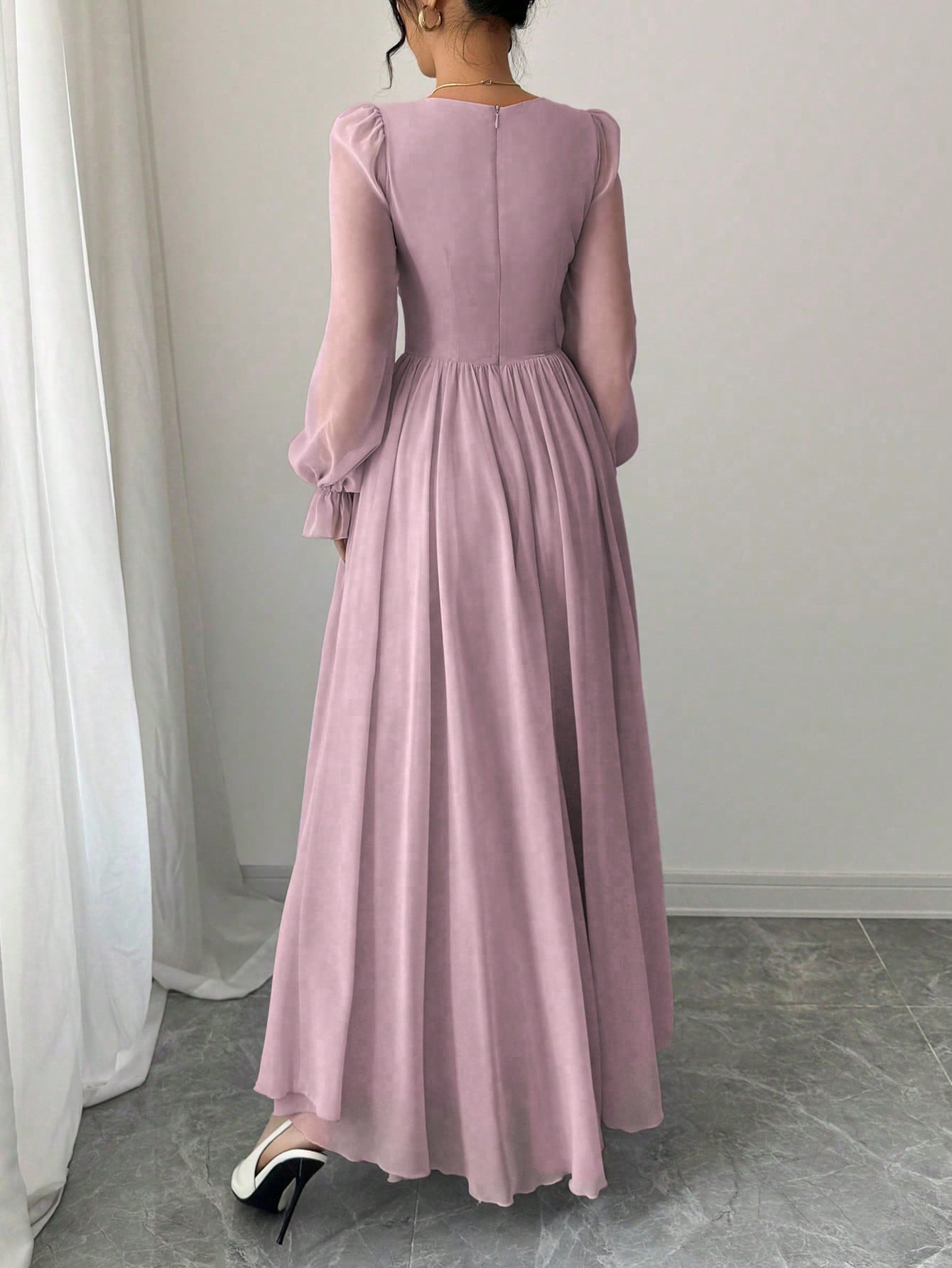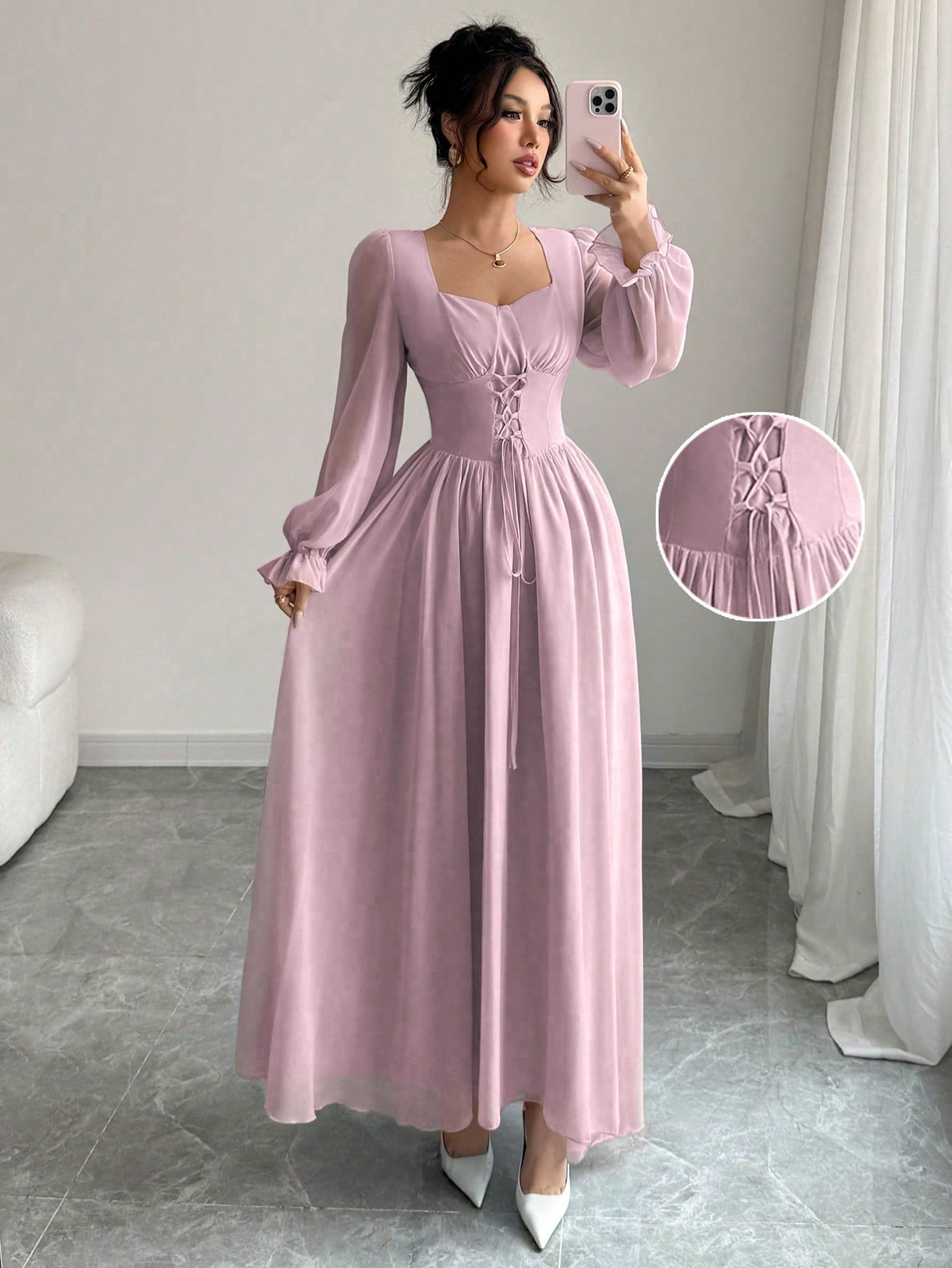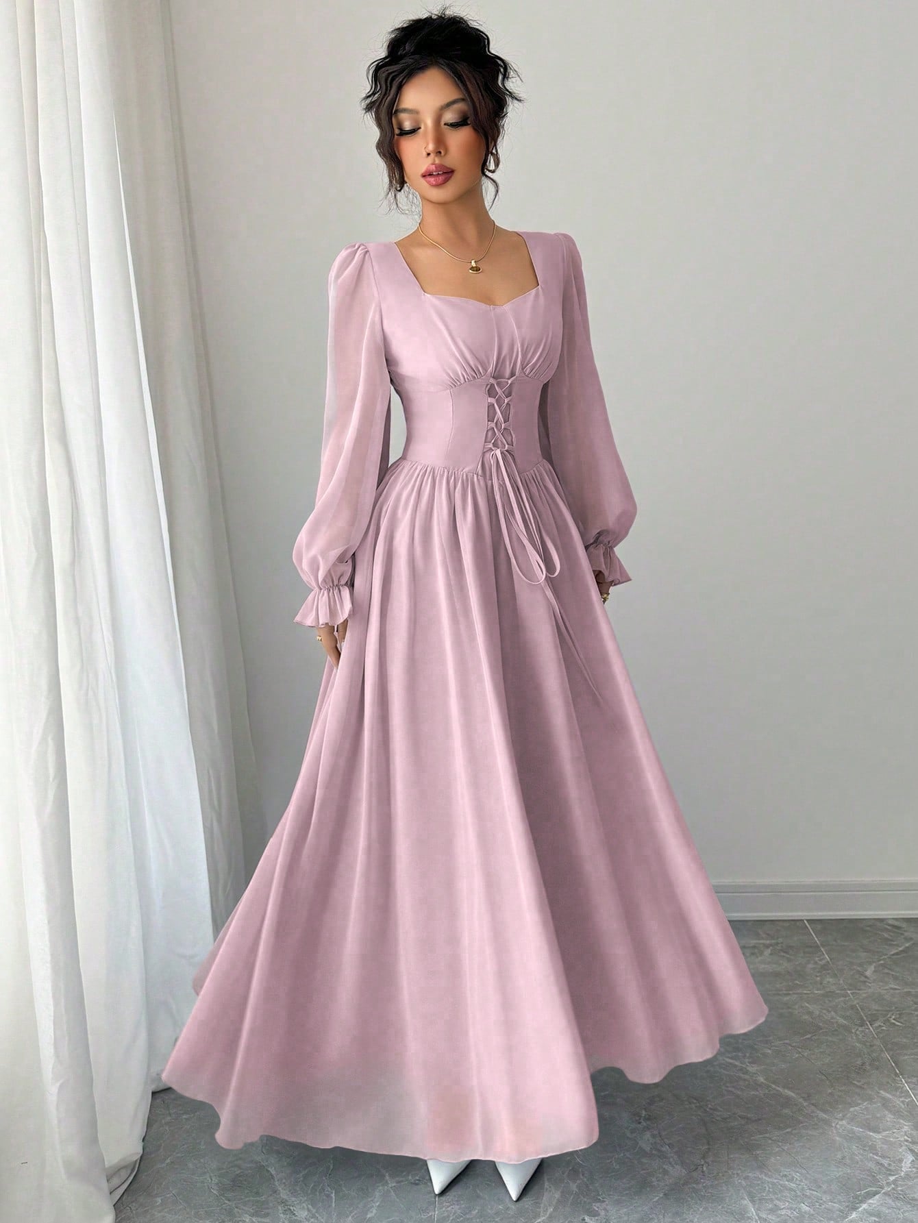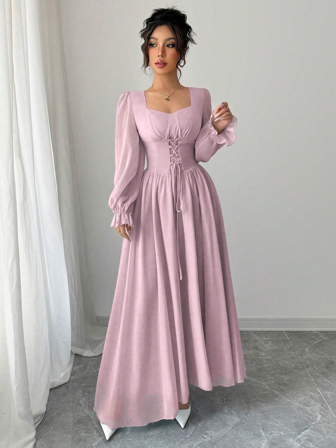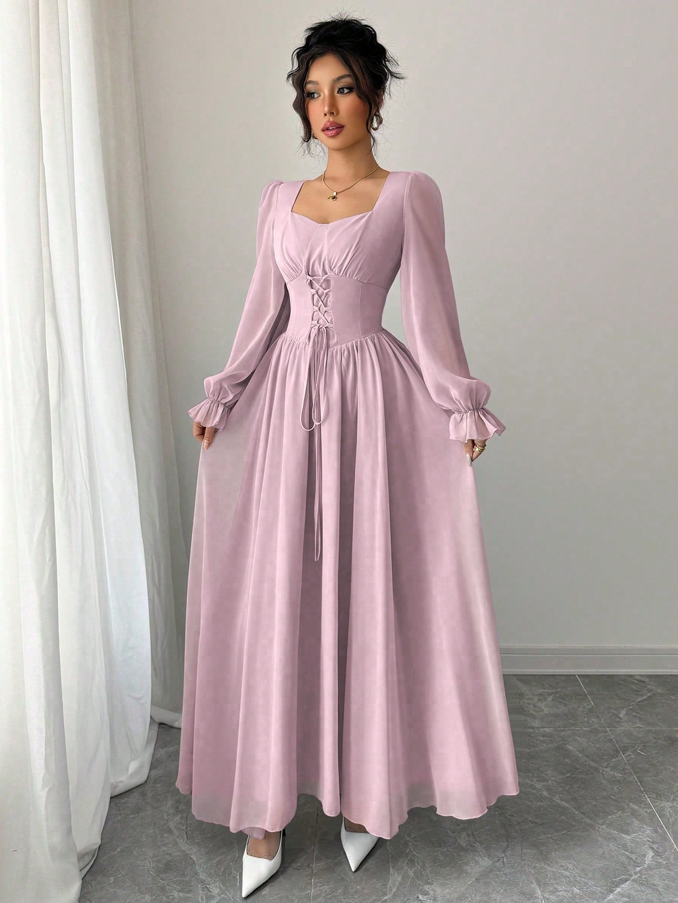 Modelyn French Elegant Solid Color Cross Straps Lantern Sleeve Dress Fall Cloth For Women