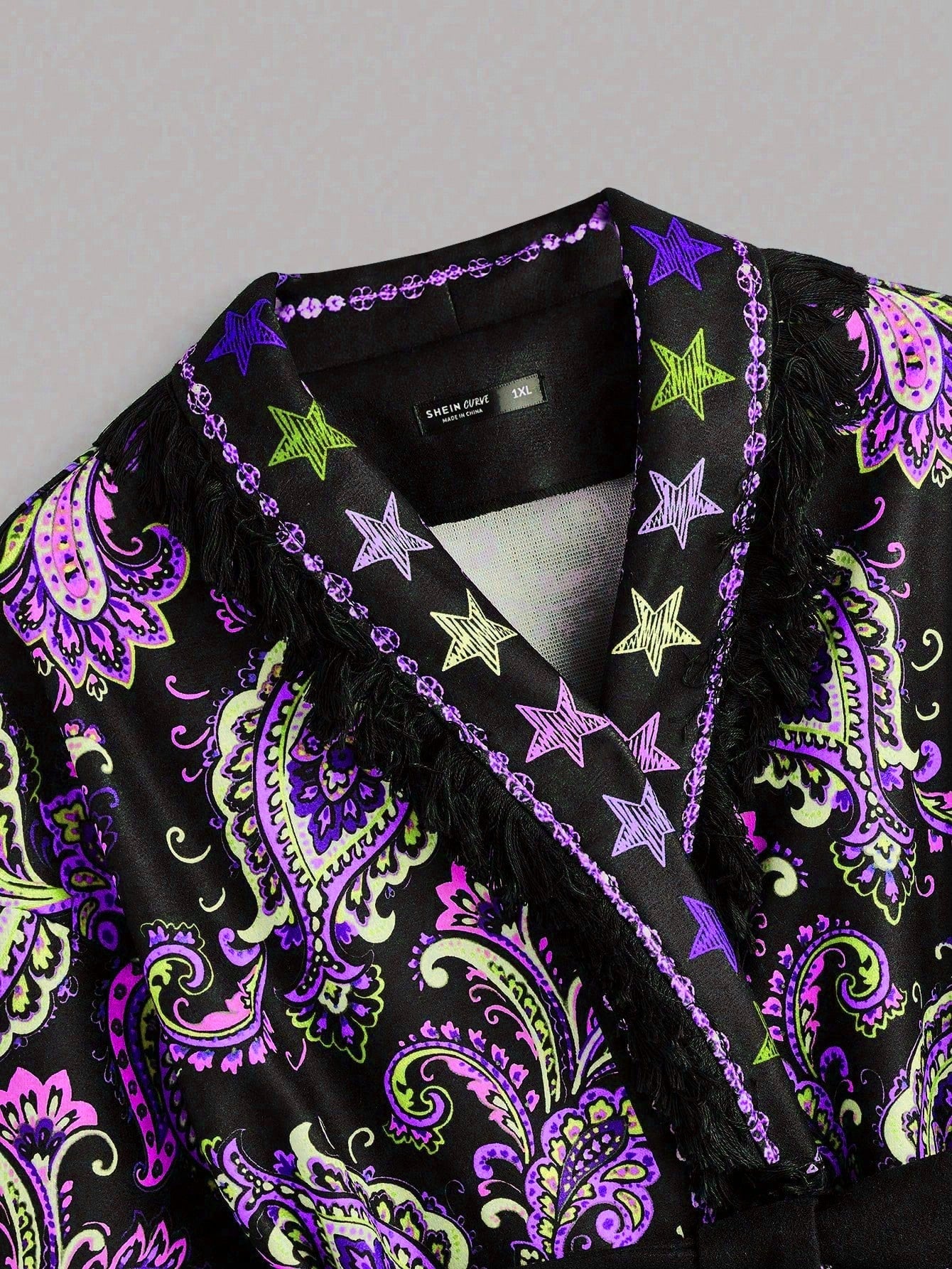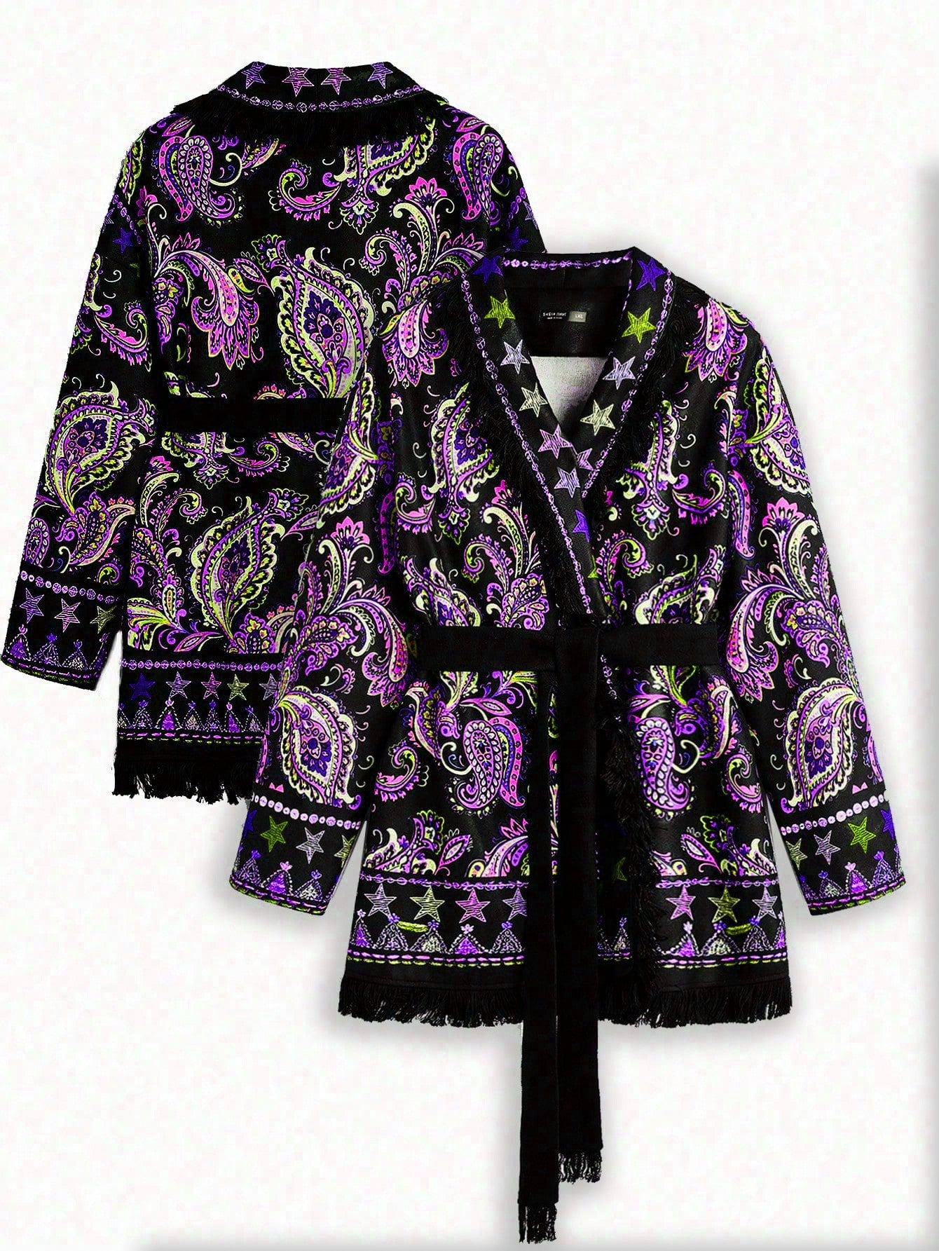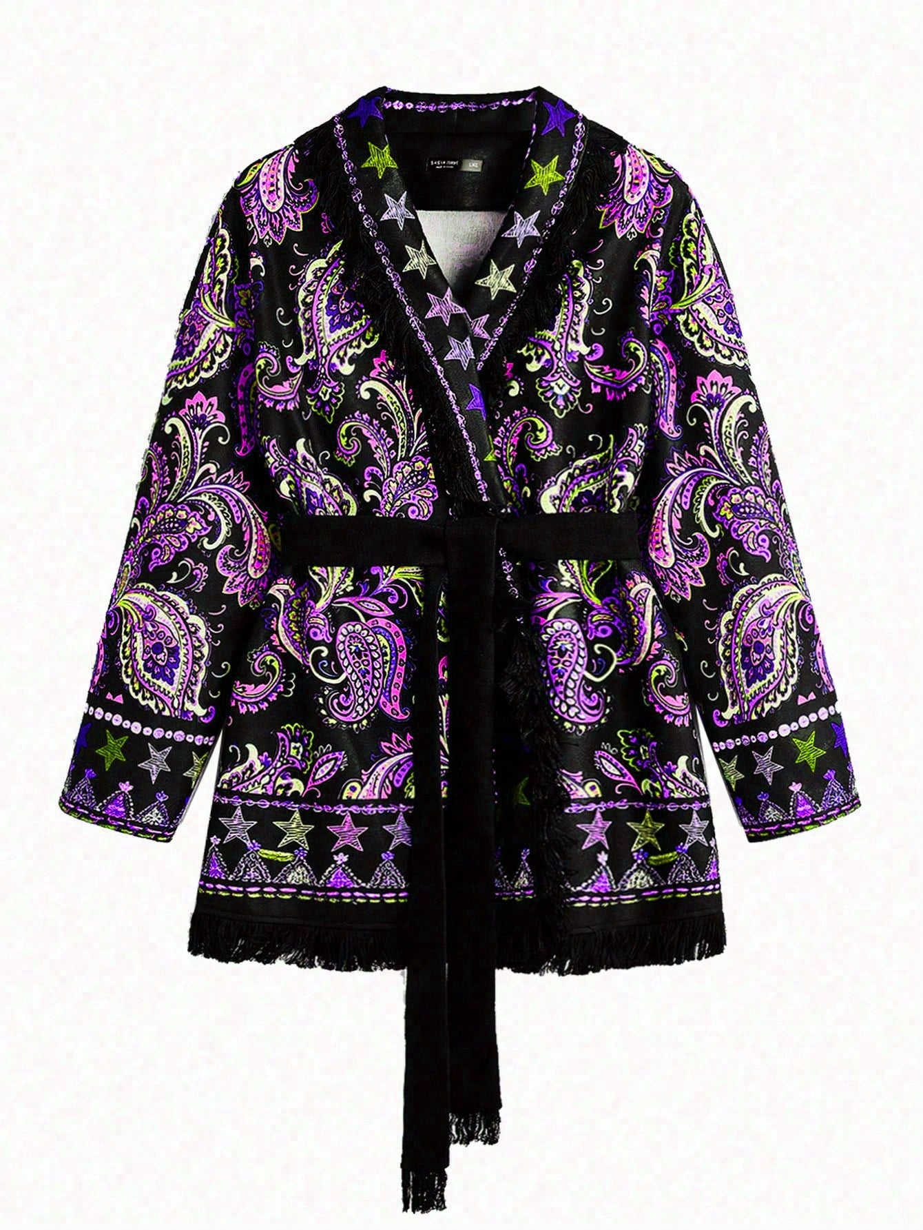 Sweetra Plus Size Lapel Position Print Waist Long Sleeve Tweed Jacket Without Belt