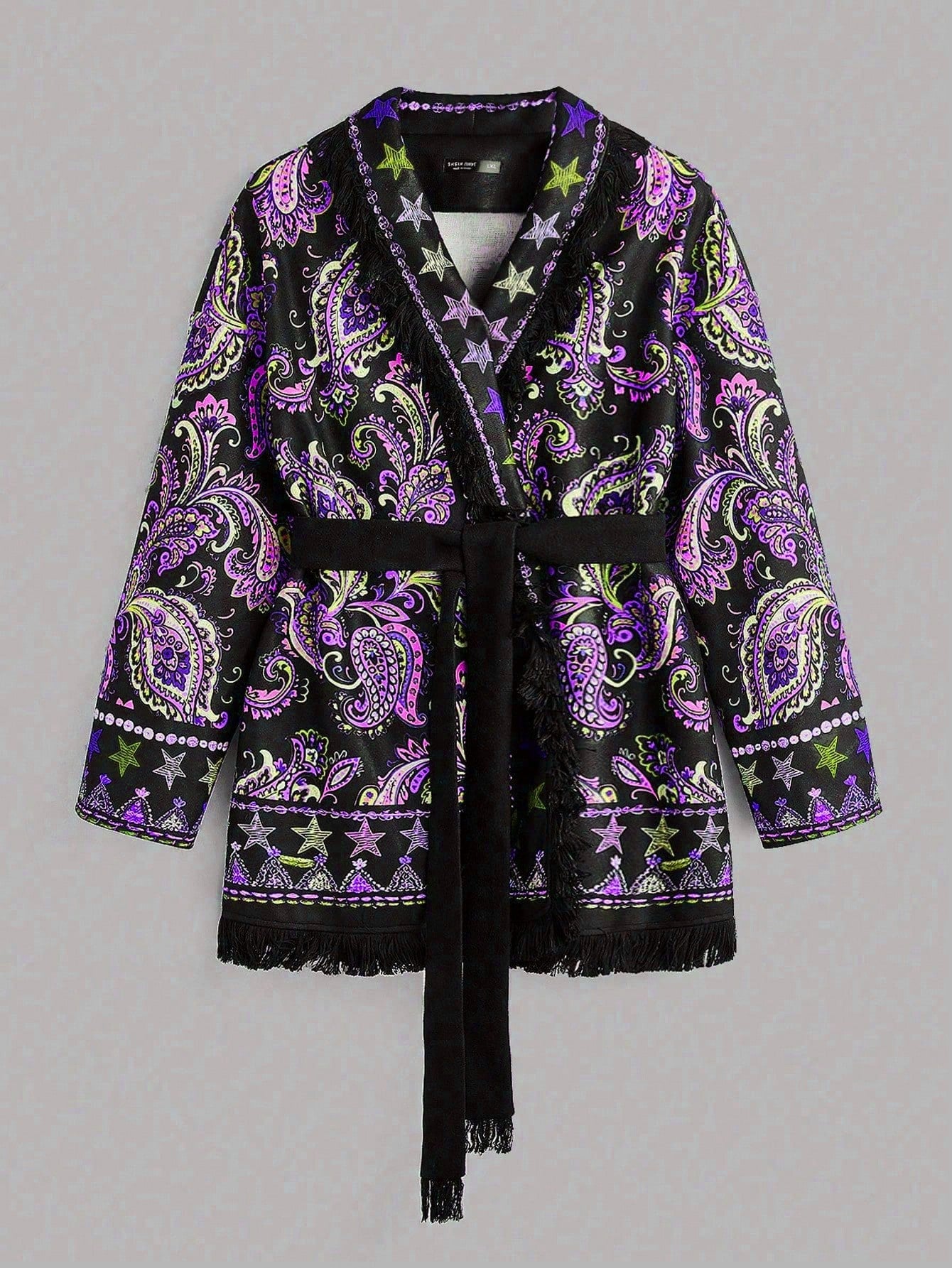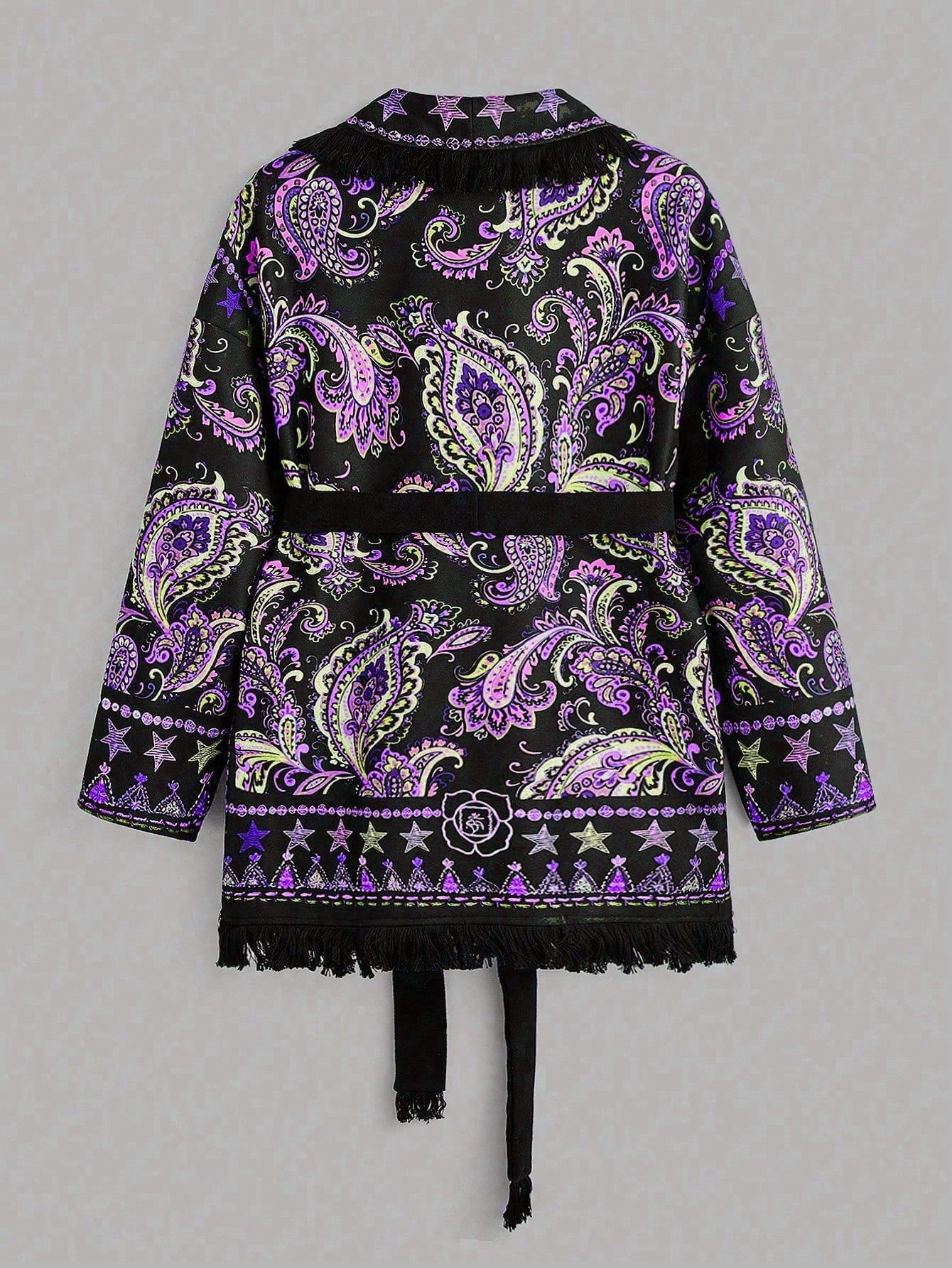 women Sweetra Plus Size Lapel Position Print Waist Belt Long Sleeve Tweed Jacket