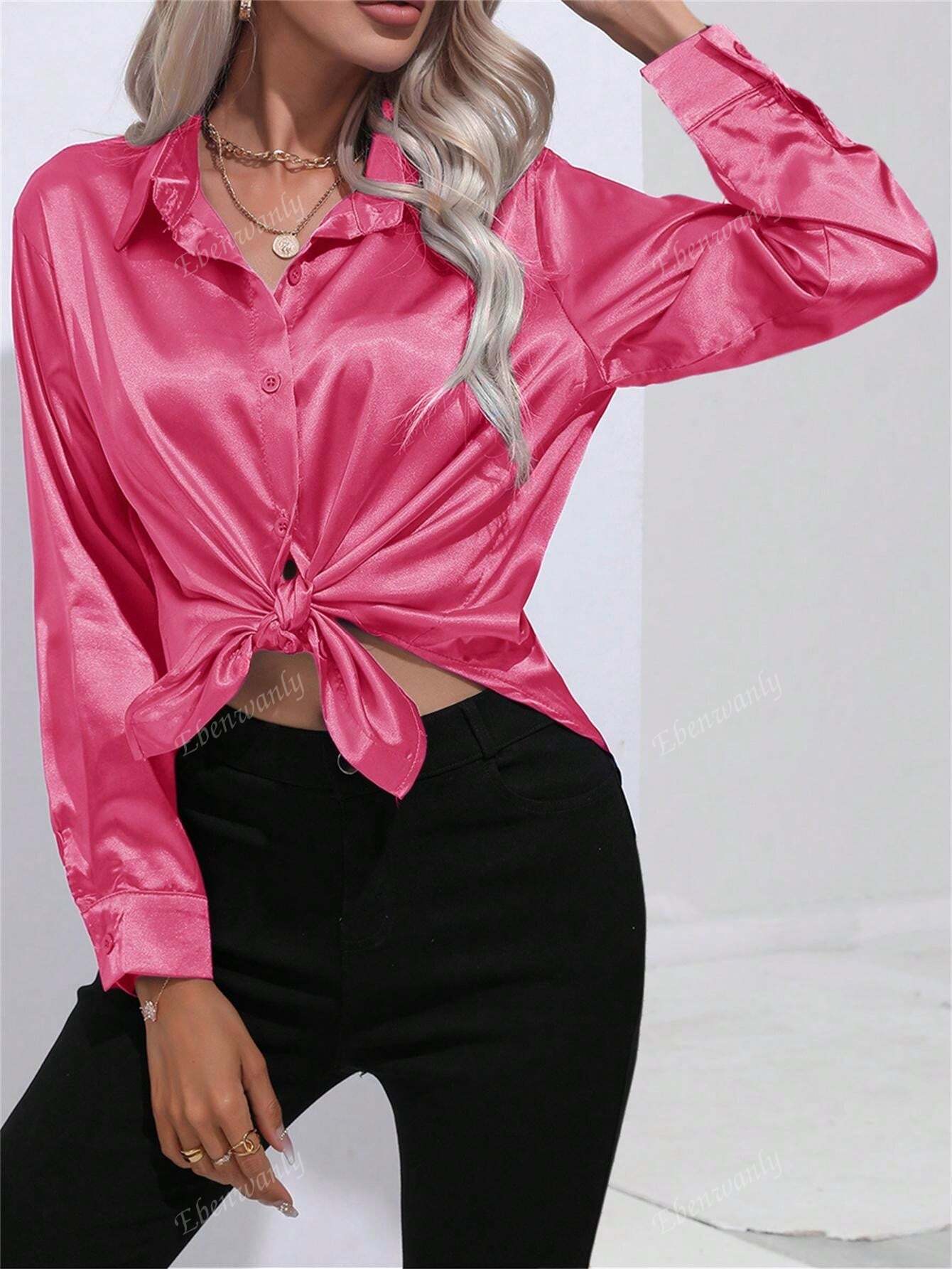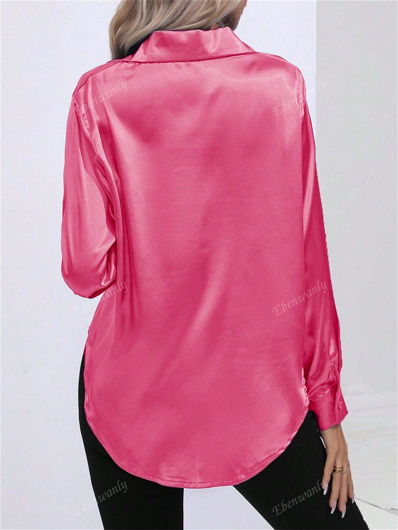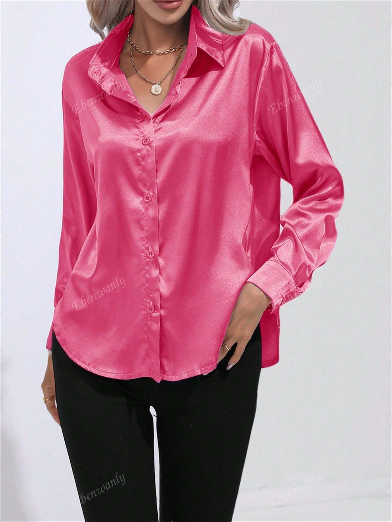 Women's Casual Turn-Down Collar Button Silky Satin-Faced Pique Long Sleeve Blouse